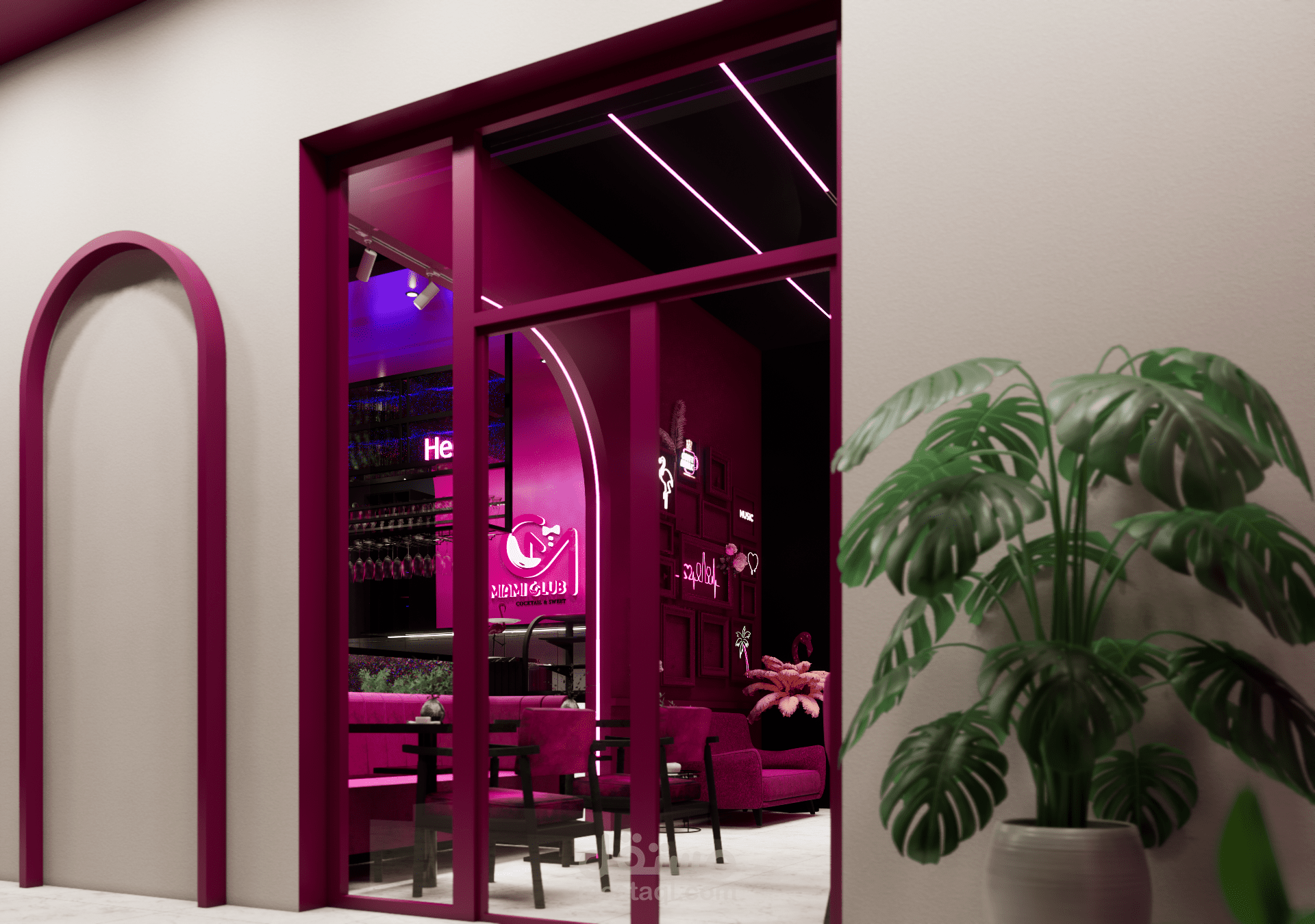 تصميم واجهة محل نادي ميامي للعصائر و حلويات بالطراز المودارن و بالدمج بين اللون أحمر البنفسجي و كلاسيك وايت و اكسيسوارت باللون الاسود .