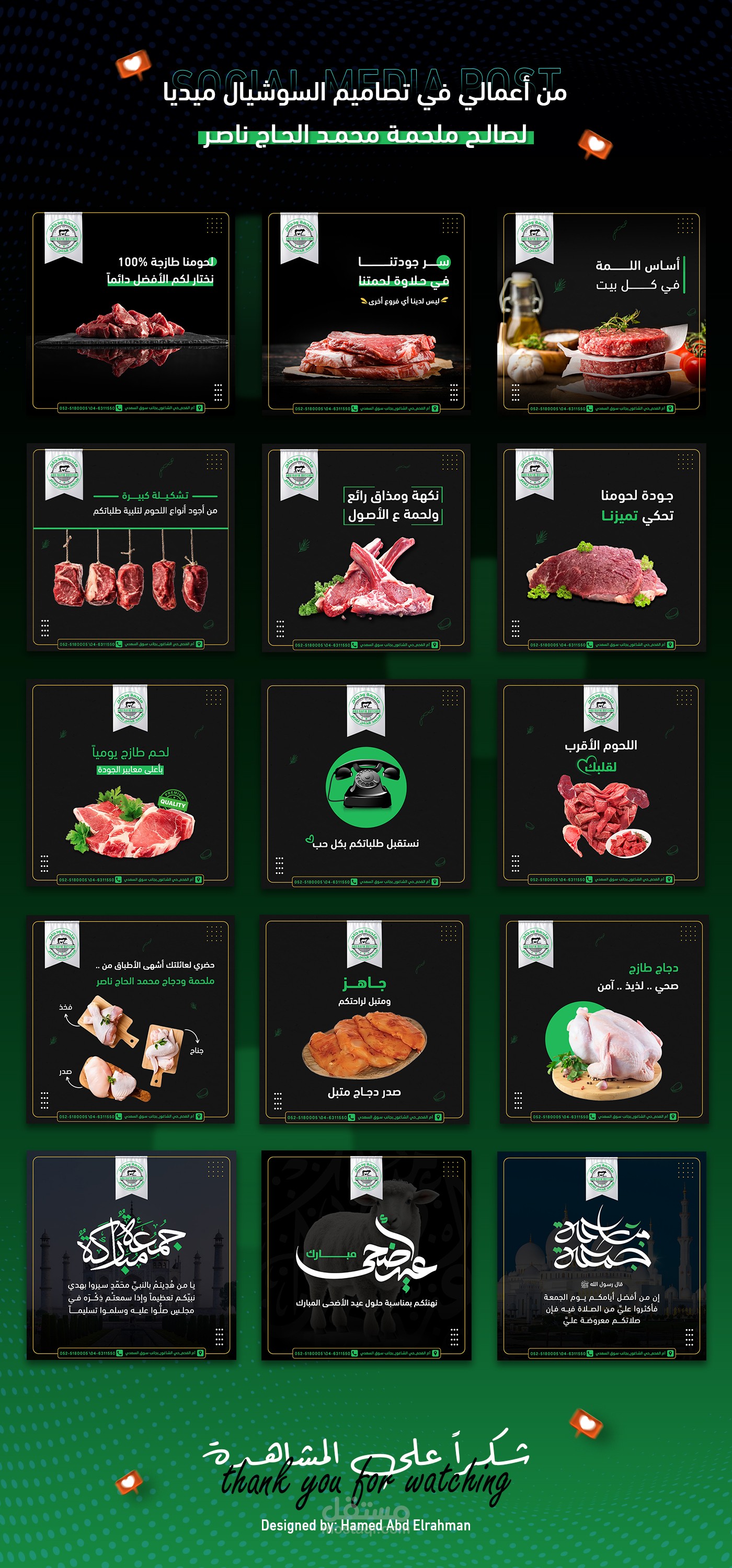 عملت على تصميم مجموعة منشورات احترافية لصالح "ملحمة ودجاج محمد الحاج ناصر"، وهو متجر متخصص في بيع اللحوم الطازجة والدواجن ومنتجاتها.