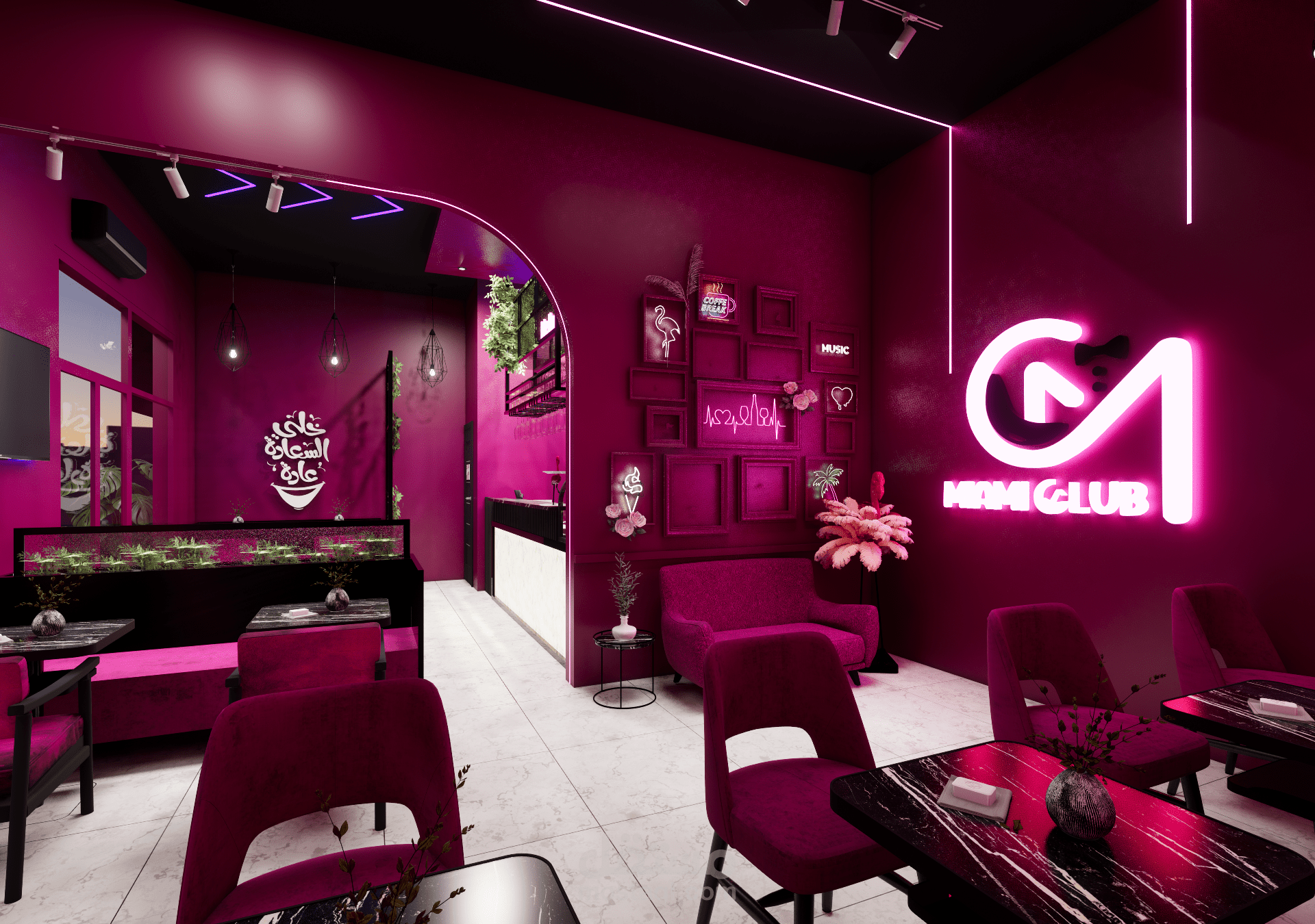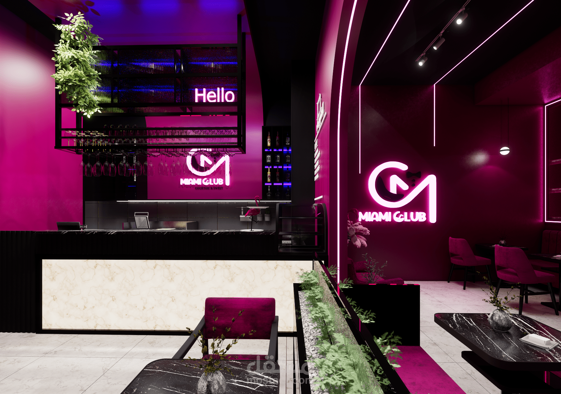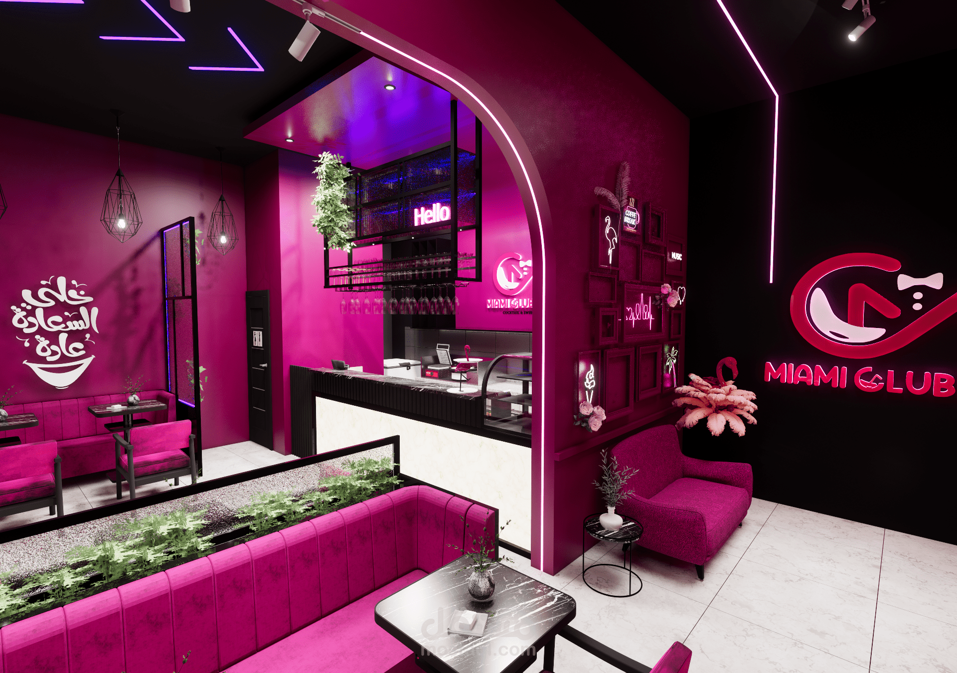 تم تصميم محل نادي ميامي للعصائر و حلويات بالطراز المودارن برغبة العميل واختيار الالوان الاساسية - الاحمر البنفسجي و كلاسيك وايت و الاسود - وذلك باقتباس من لون كوكتيل و فلامينغو والذي يبرز مشاعر الحب و الحيوية و الفرح و انتعاش وهذا هو احساس البارز في مكان و كذلك هي الالوان التي اخترناها في الهوية التجارية .
