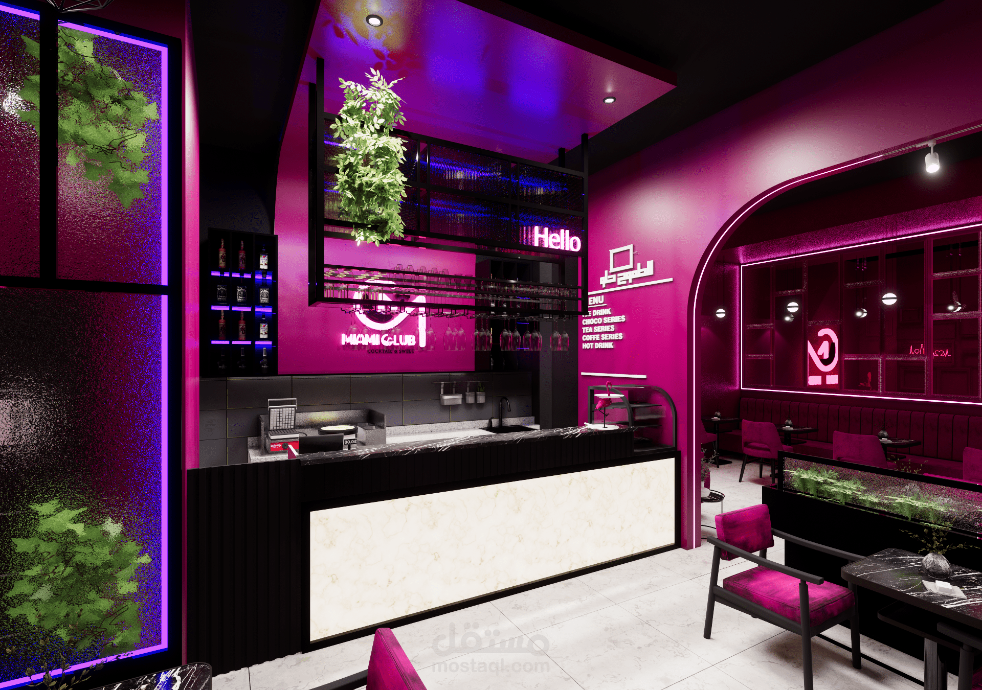 تصميم محل نادي ميامي للعصائر و حلويات بالطراز المودارن