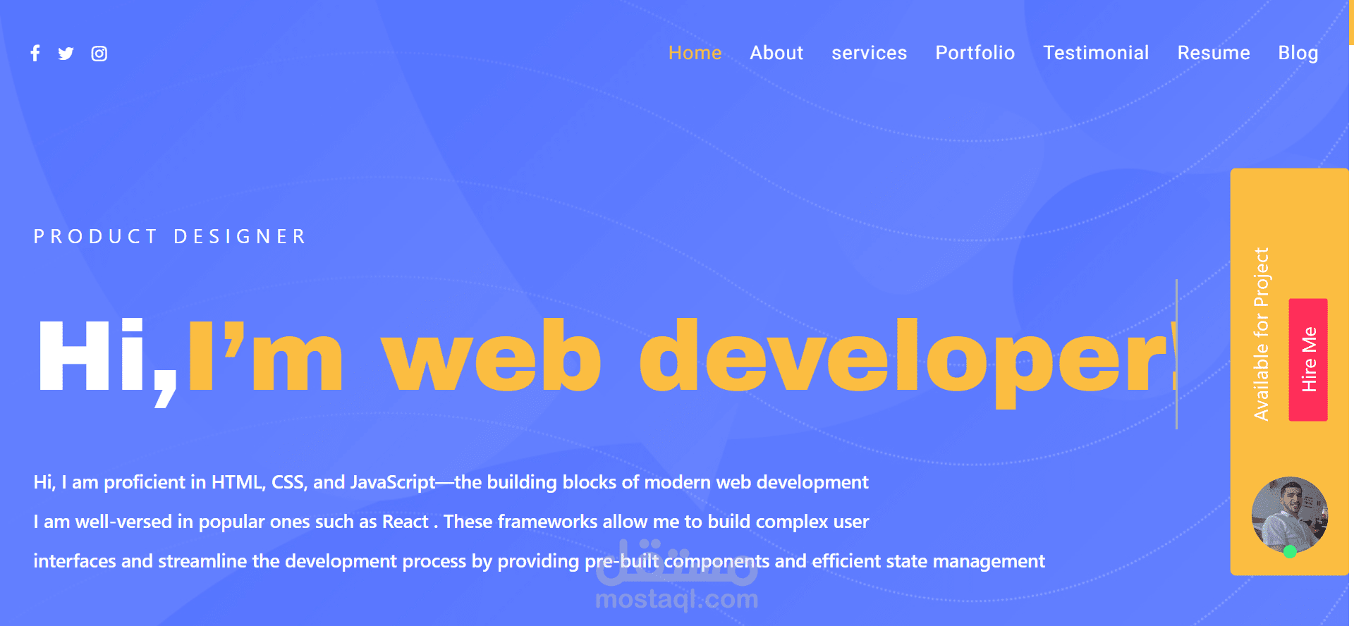 الصفحة الرئيسية/المقدمة: توفر الصفحة الرئيسية عادةً مقدمة مختصرة أو رسالة ترحيب، مما يمنح الزائرين نظرة عامة عن الفرد أو الشركة. وقد يتضمن صورة شخصية أو شعارًا لإضافة عنصر مرئي.