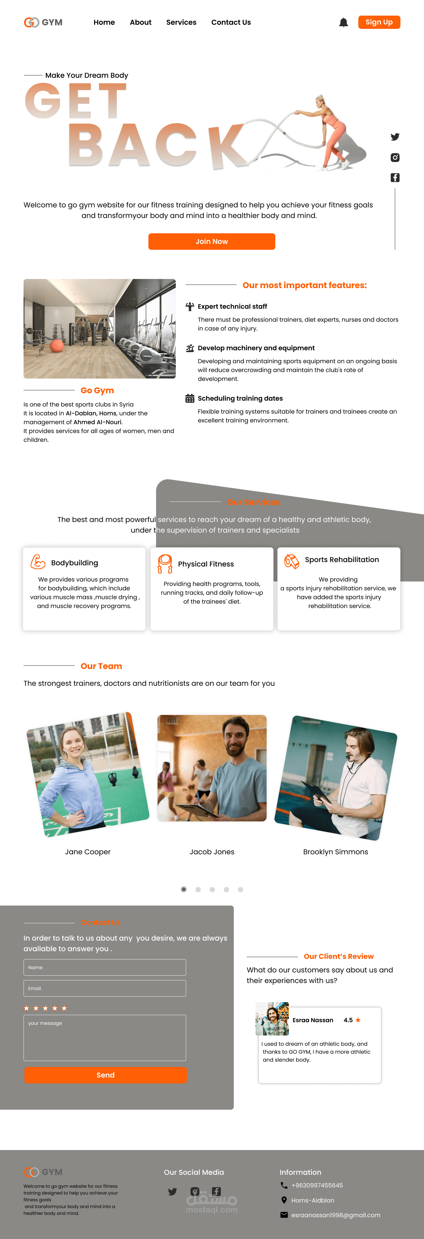 A website for a sports club that displays the features that the club enjoys, in addition to the existing services of courses and bodybuilding for all ages, displaying the management and training team, and the most important feature is the possibility of booking online through the website.