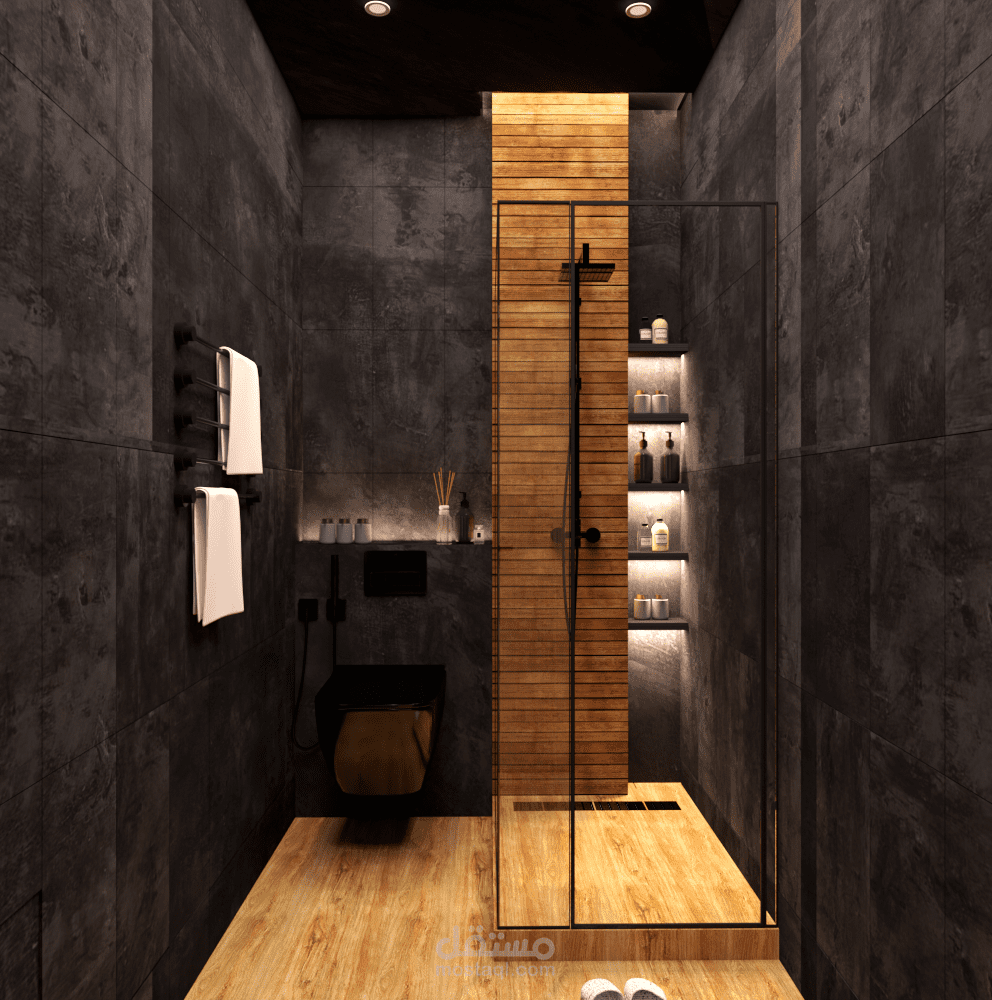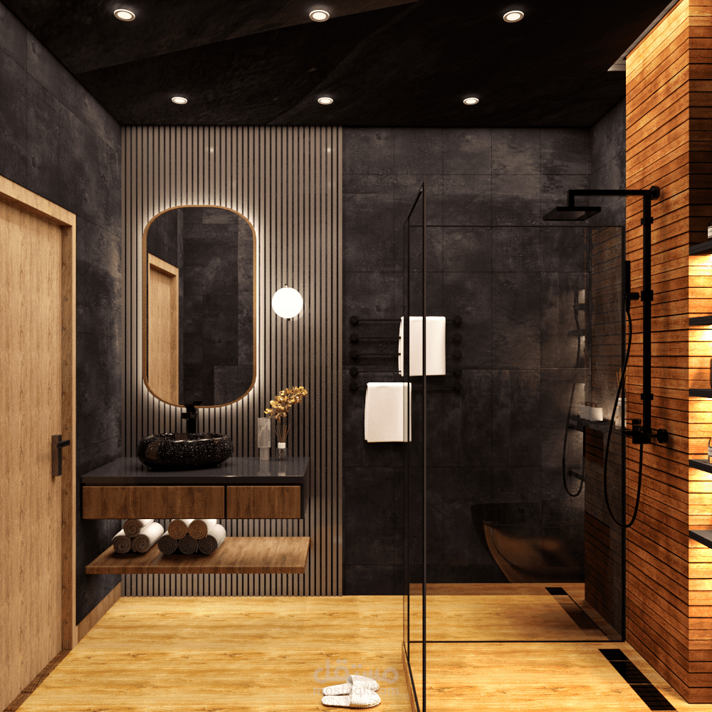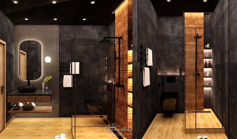 دورة مياه على الطراز الحديث تشمل كل من شاور وكرسي حمام ومغسلة ومرايا بانارة مخفية