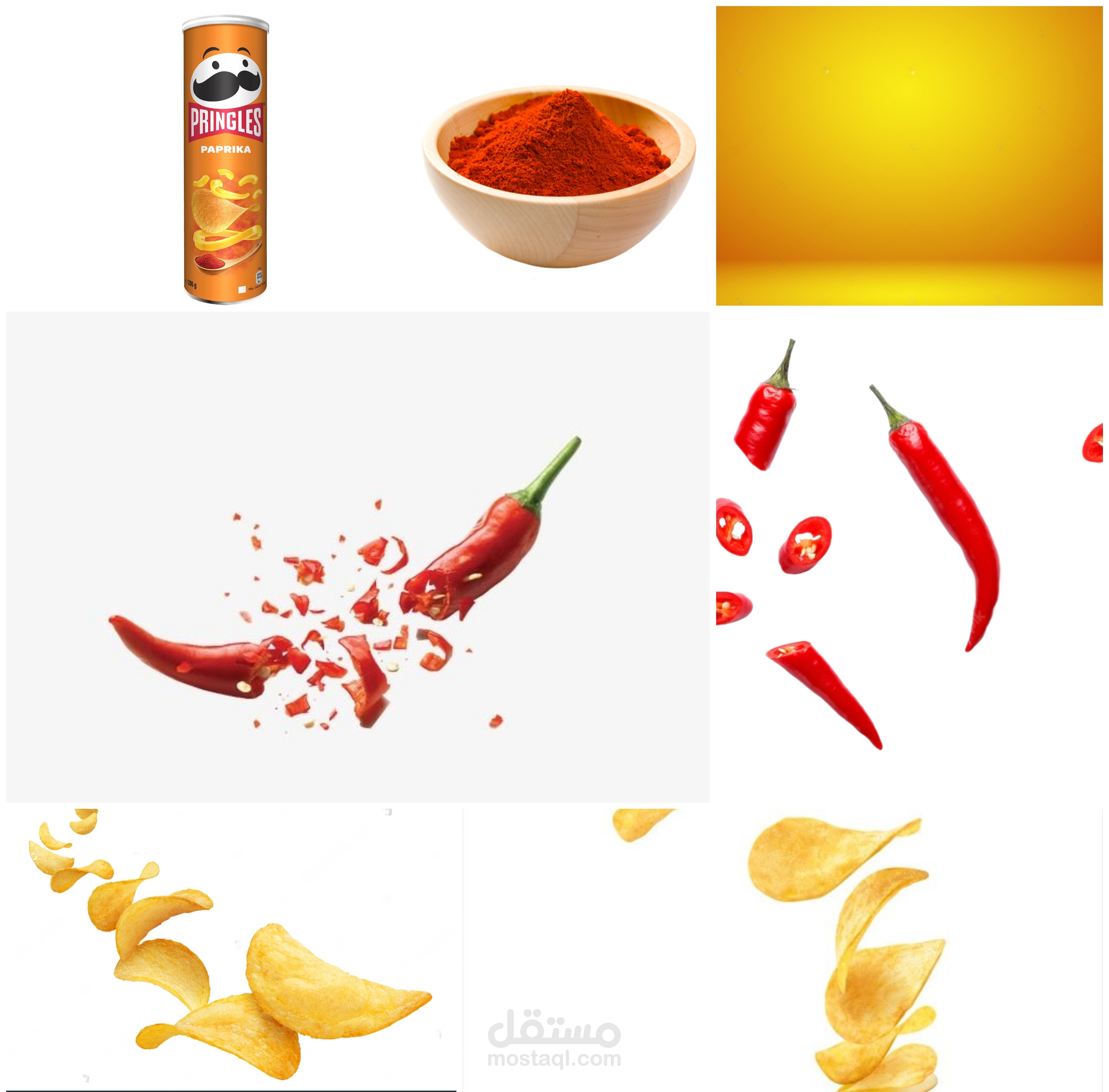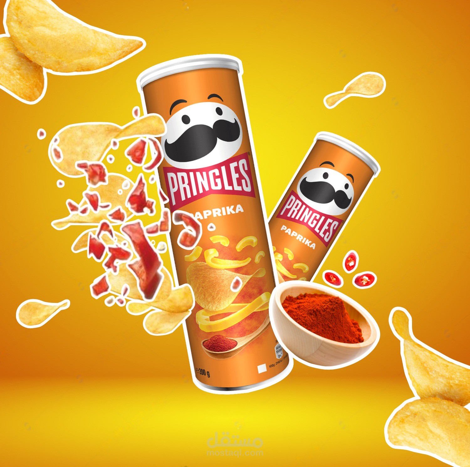 تصميم الي pringles بنكهة البابريكا يعكس الإبداع والحيوية, تتميز العلبة بتصميم جذاب حيث تظهر رقائق الpringles وهي تتطاير بشكل مشوق، مع تفاصيل واضحة للبابريكا وقطع الفلفل الأحمر التي تضفي لمسة من الحماسة والنكهة. يتم تسليط الضوء بشكل خاص على العلبة نفسها، مما يبرز جاذبيتها ويجعلها محور الانتباه في التصميم.