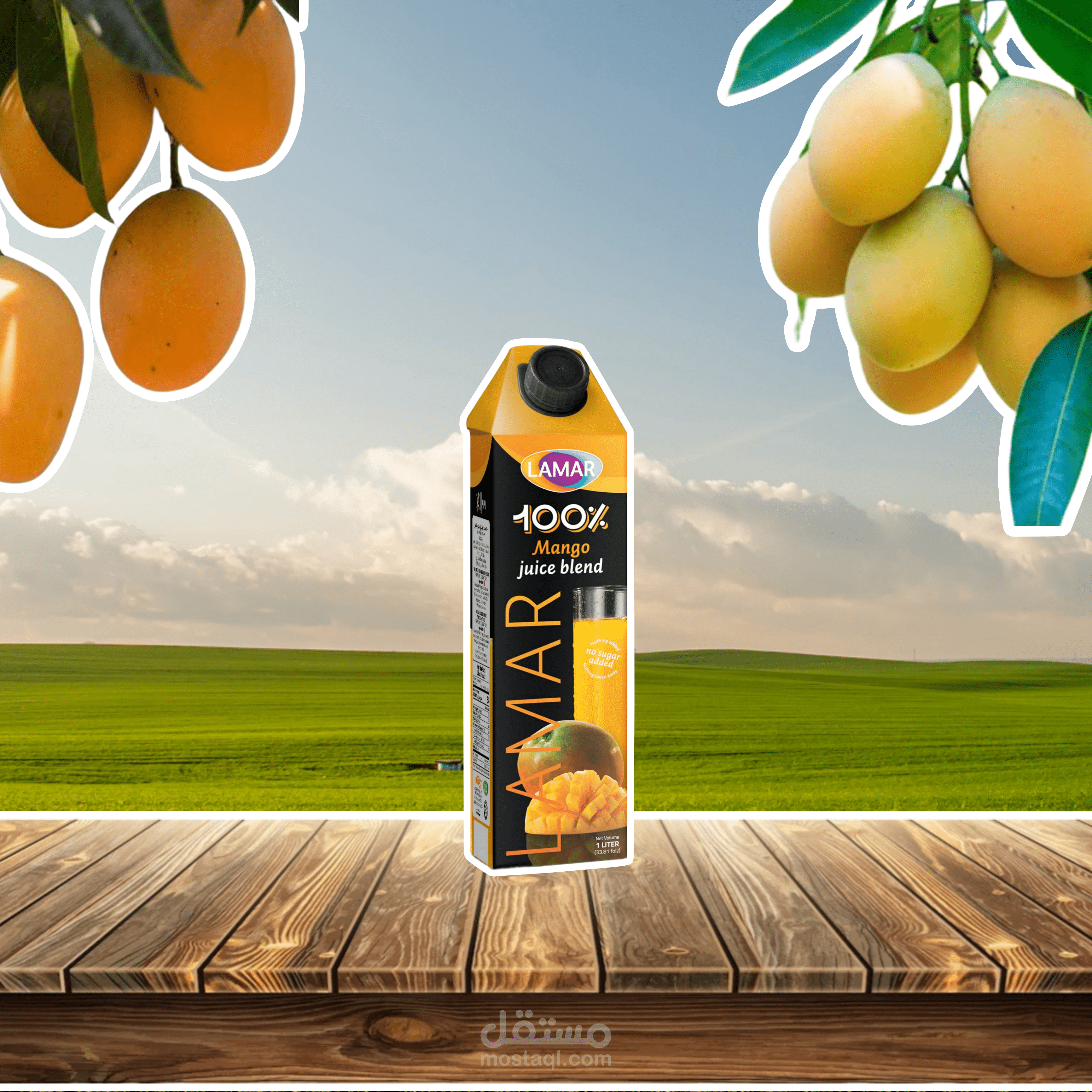 لقد قمت بتصميم علبة عصير المانجو الخاصة بشركة لمار، والتي تحتوي على 100% من المانجو الطبيعية يتضمن التصميم فواكه المانجو المعلقة على الجانب، مما يعكس أن العصير مستخلص من الطبيعة، ويتم التركيز بشكل كبير على علبة العصير.