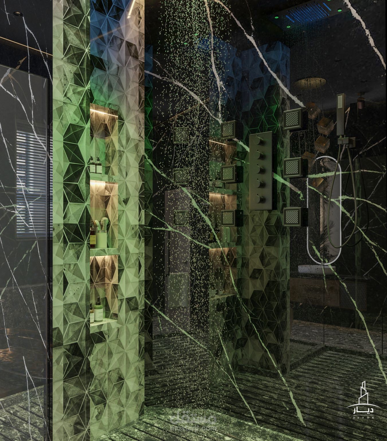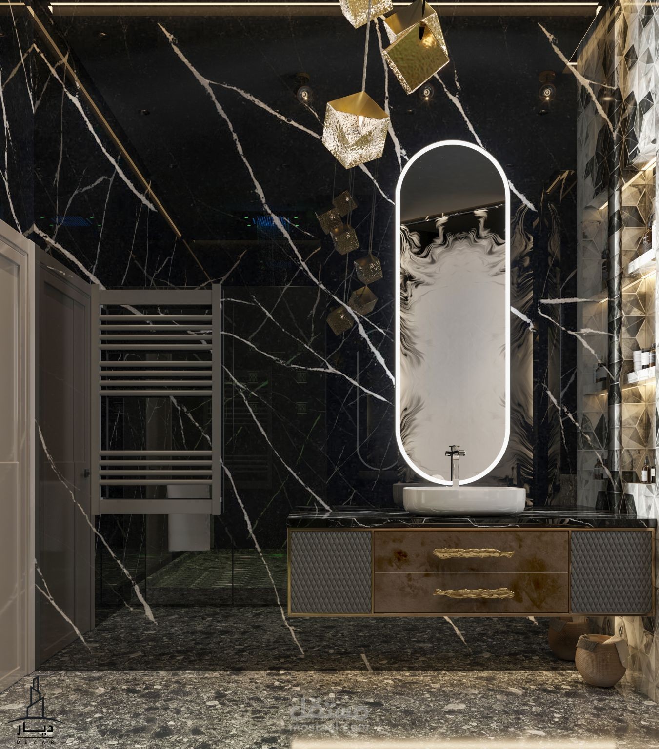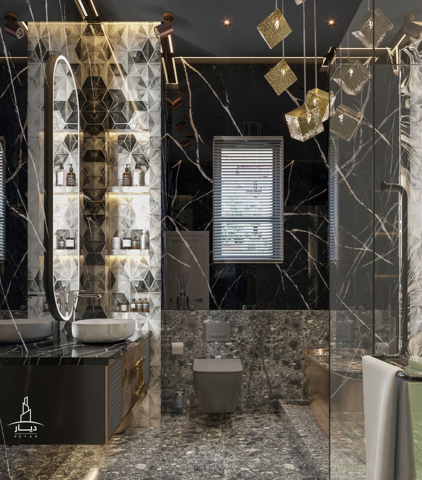 تم تصميم حمام لجناح نوم رئيسي على نمط تصميم حديث لصالح مكتب ديار