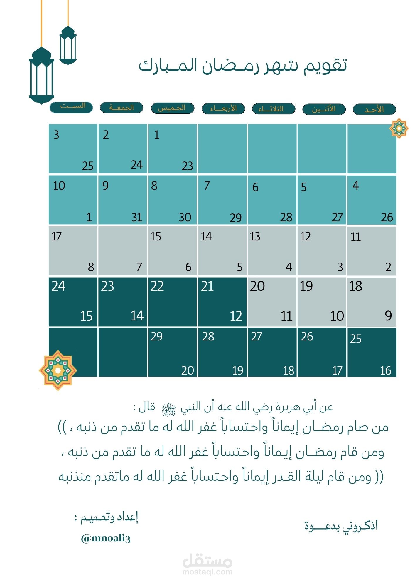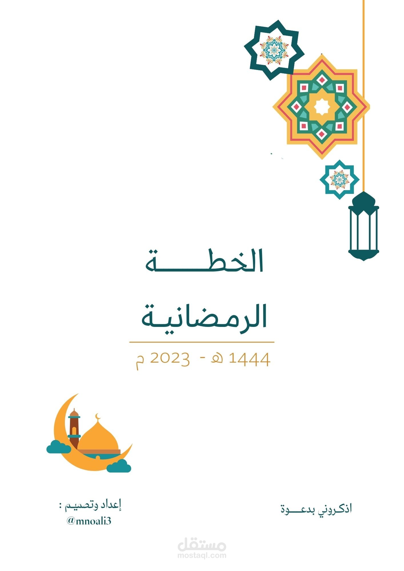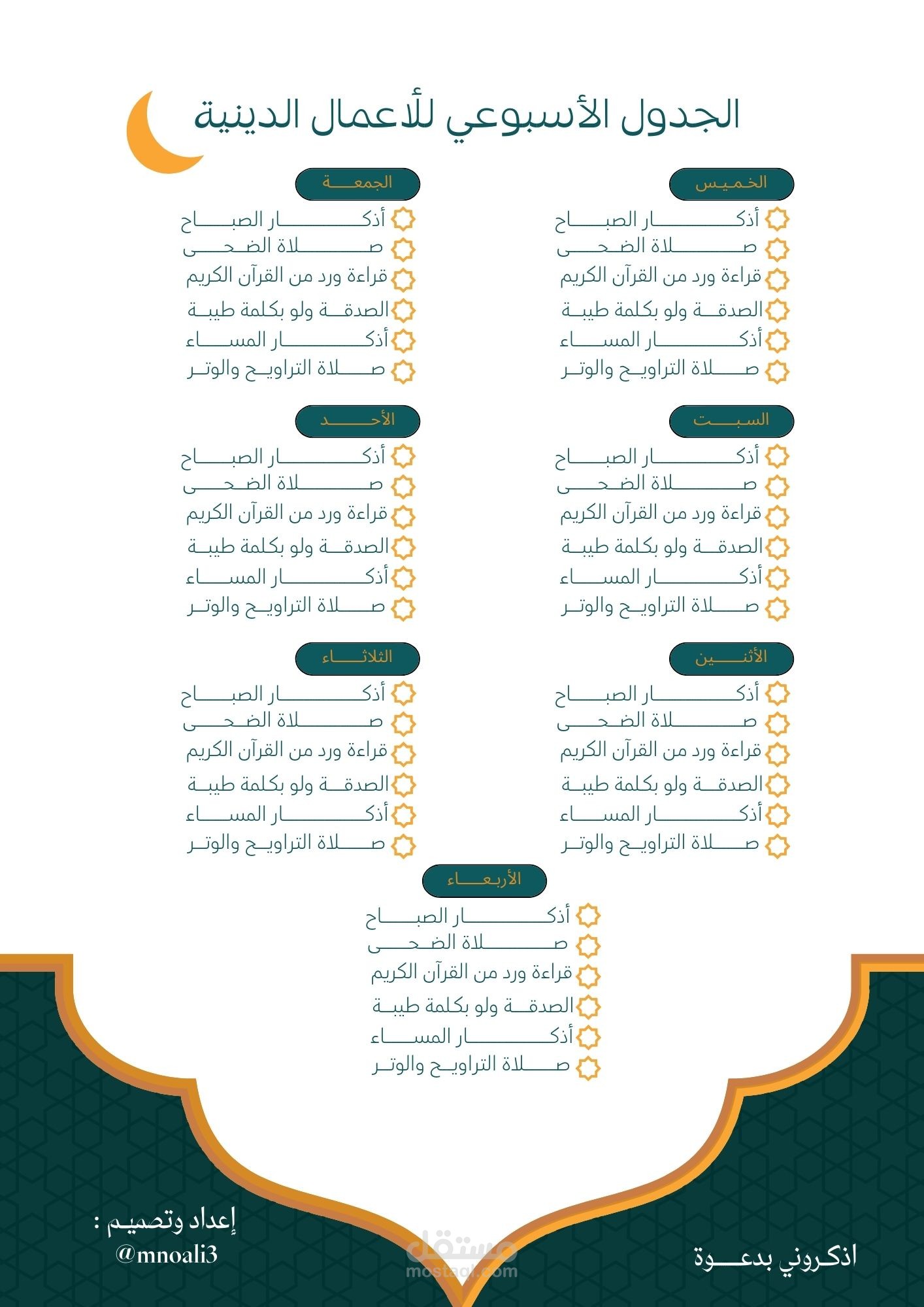 عبارة عن تصميم رمضاني لخطة متابعة يومية للاعمال الدينية والشخصية ، تم التصميم ببرنامج كانفا مكون من ٦ صفحات تقويم لشهر رمضان المبارك تم استخدام الوان باردة مع إضافة لمسات ذات طابع ديني تعبيراً عن المناسبة الدينية ، وجدول ختم القرآن الكريم ، وجدول اسبوعي للاعمال الدينية خلال الشهر الكريم وجدول اسبوعي للاعمال للعناية الشخصية ، ومتابعة مدى الانجاز الاسبوعي استغرق التنفيذ يومين مدة ساعتين في اليوم بمعدل ٤ ساعات