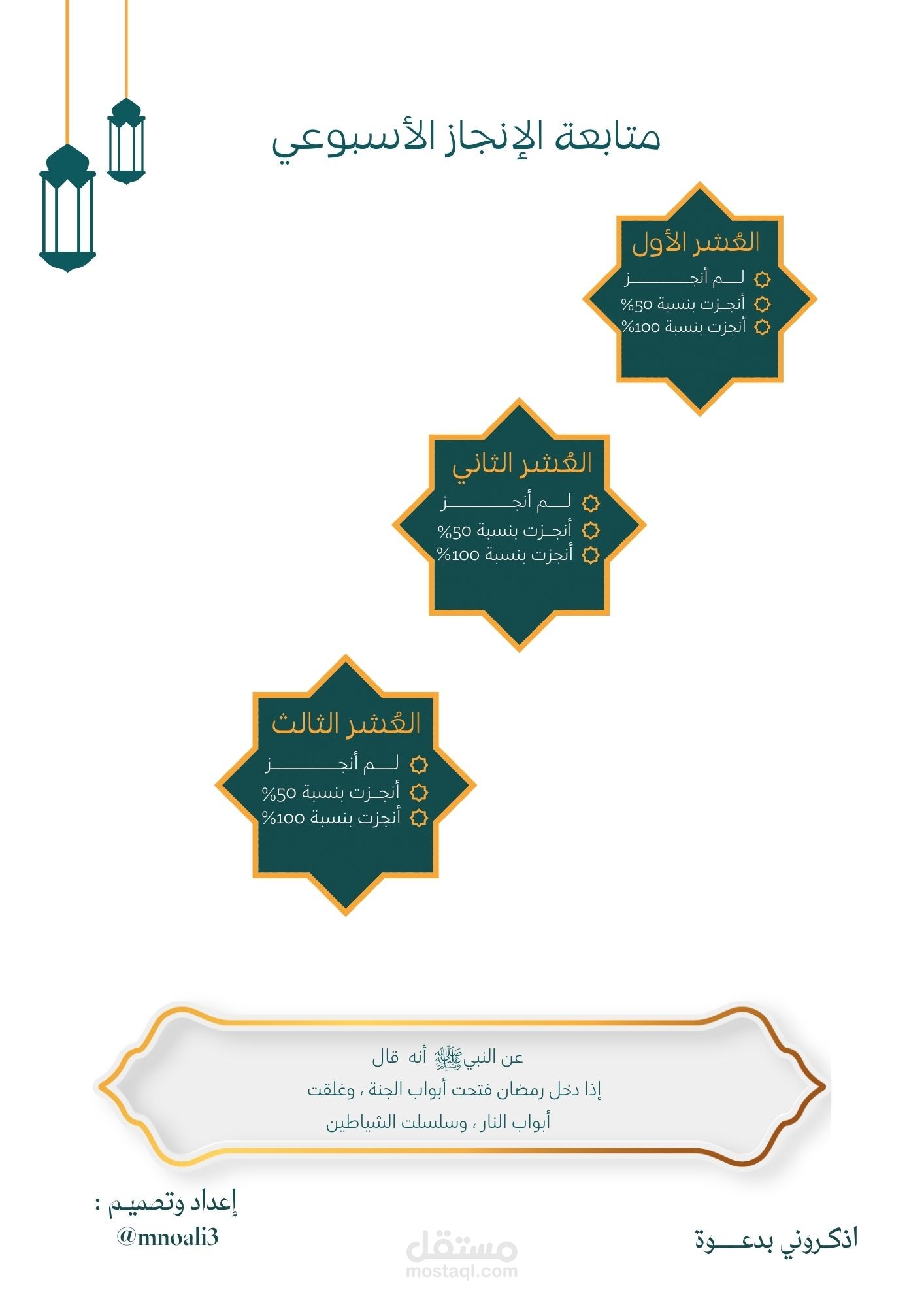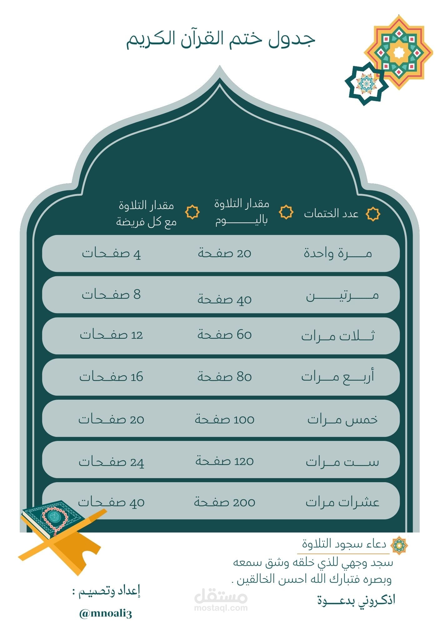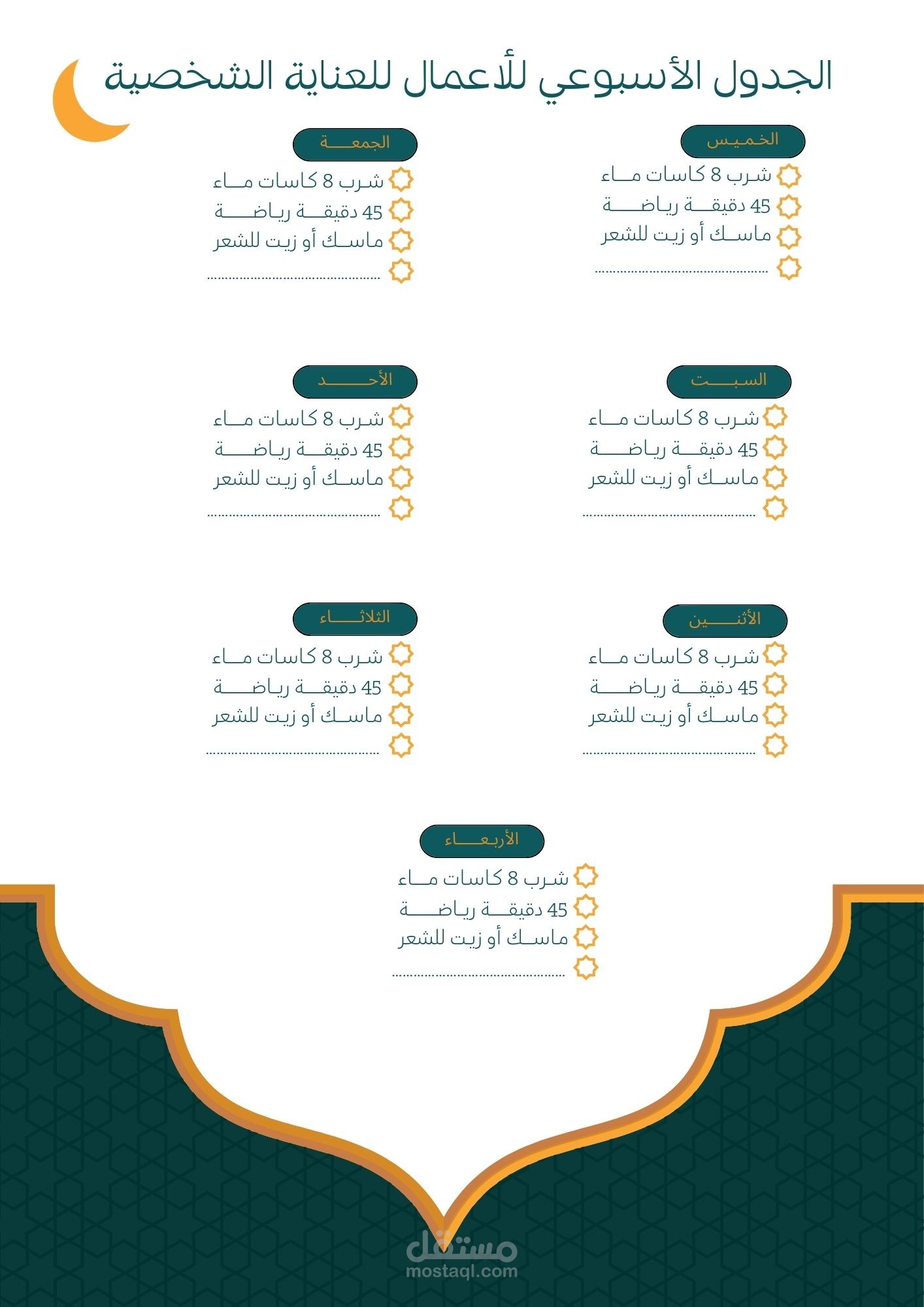 عبارة عن تصميم رمضاني لخطة متابعة يومية للاعمال الدينية والشخصية ، تم التصميم ببرنامج كانفا مكون من ٦ صفحات تقويم لشهر رمضان المبارك تم استخدام الوان باردة مع إضافة لمسات ذات طابع ديني تعبيراً عن المناسبة الدينية ، وجدول ختم القرآن الكريم ، وجدول اسبوعي للاعمال الدينية خلال الشهر الكريم وجدول اسبوعي للاعمال للعناية الشخصية ، ومتابعة مدى الانجاز الاسبوعي استغرق التنفيذ يومين مدة ساعتين في اليوم بمعدل ٤ ساعات
