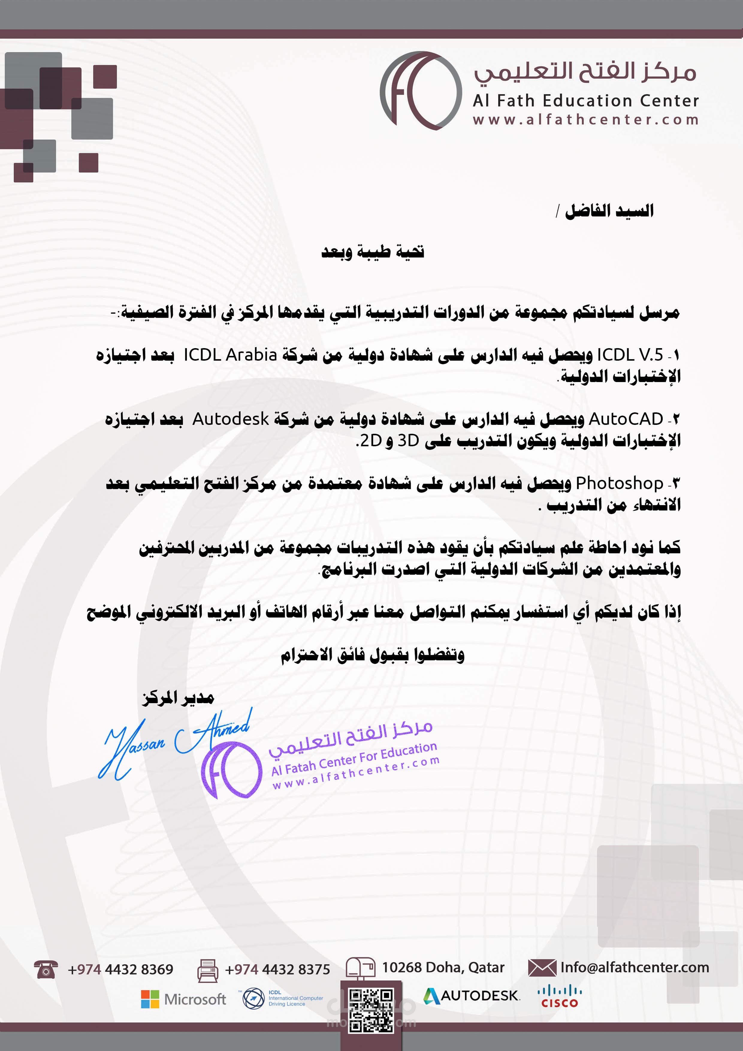 عبارة عن تصميم ورقة مخاطبة لمركز الفتح التعليمي بدولة قطر والذي تم انجازة من خلال موقع مستقل
