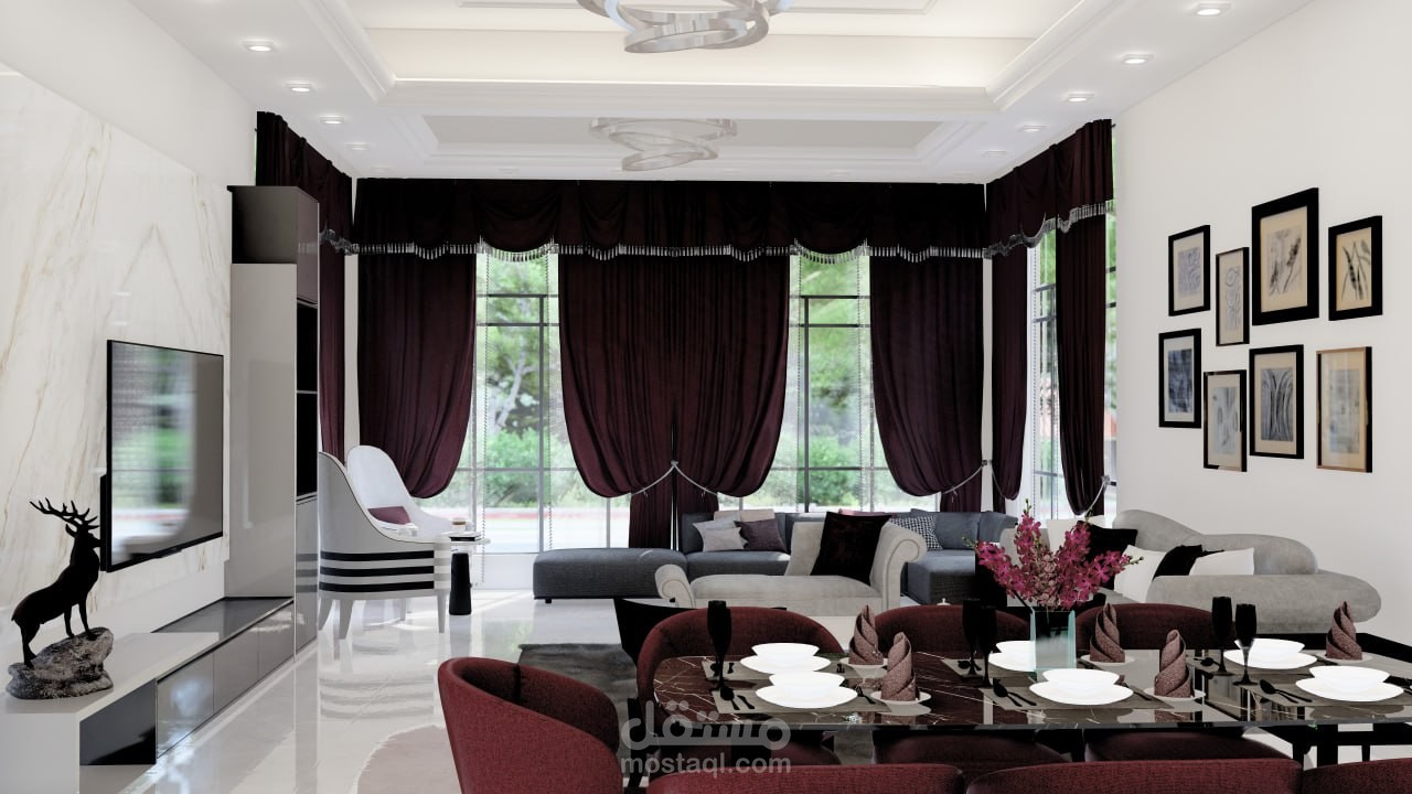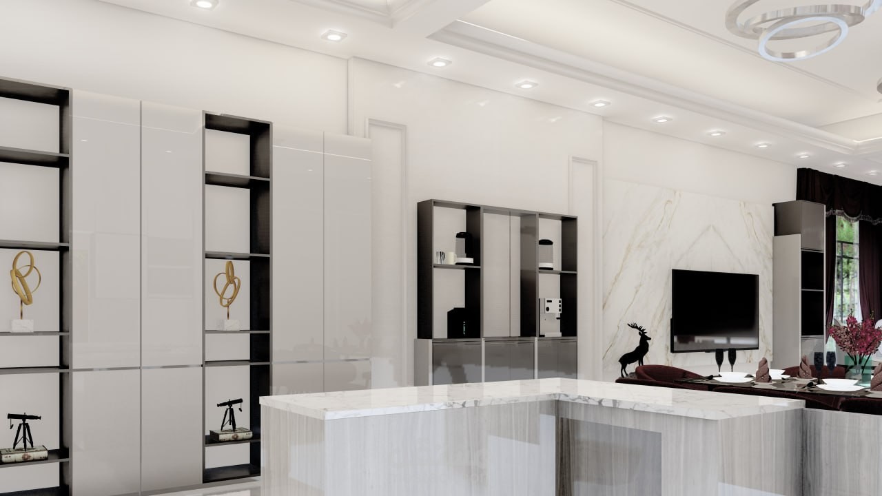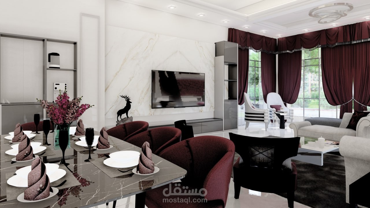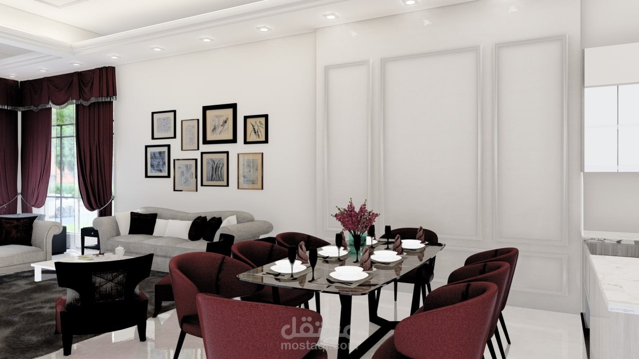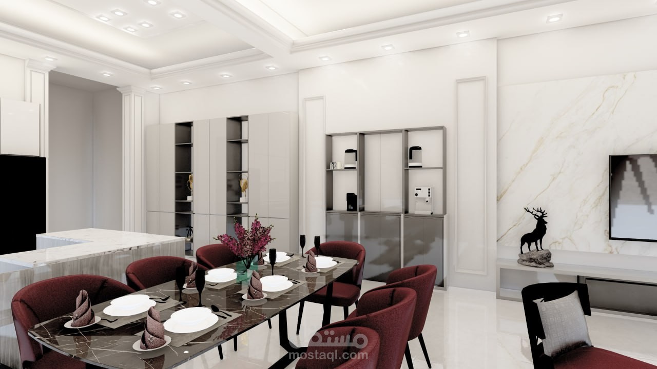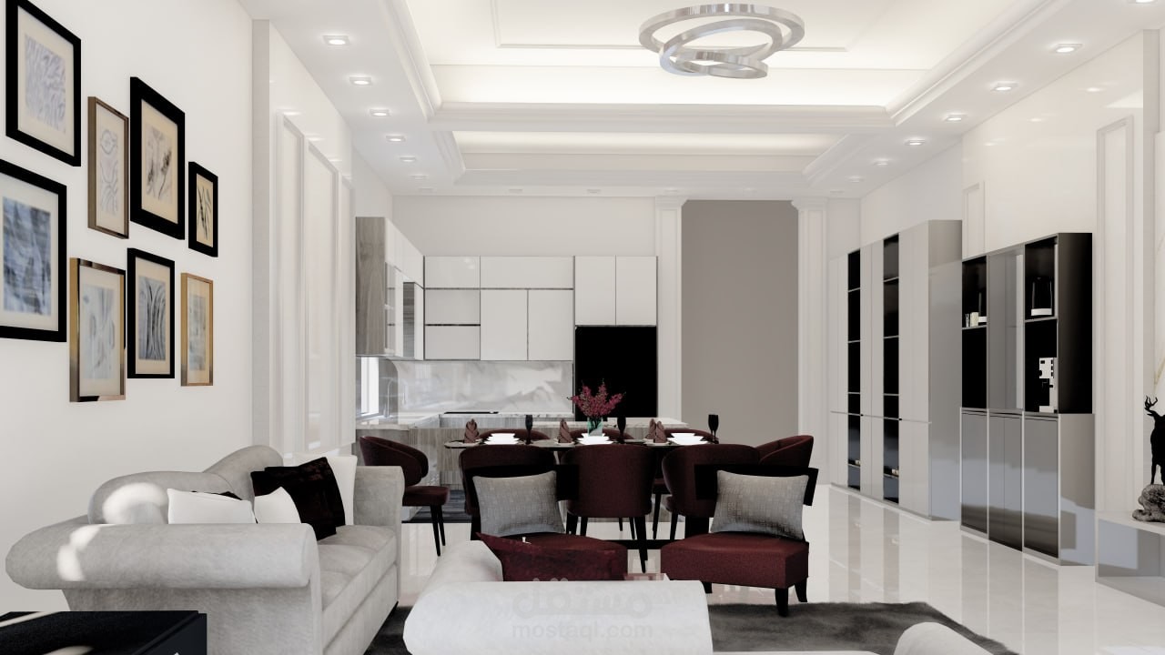 تصميم داخلي وديكور لفراغ معيشة يحوي مطبخ وطعام وصالة وكوفي كورنر