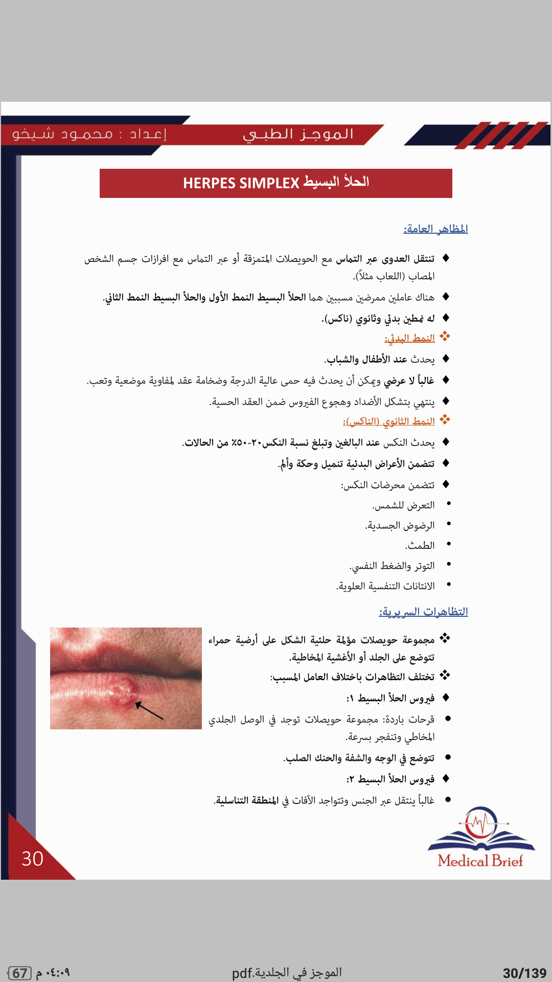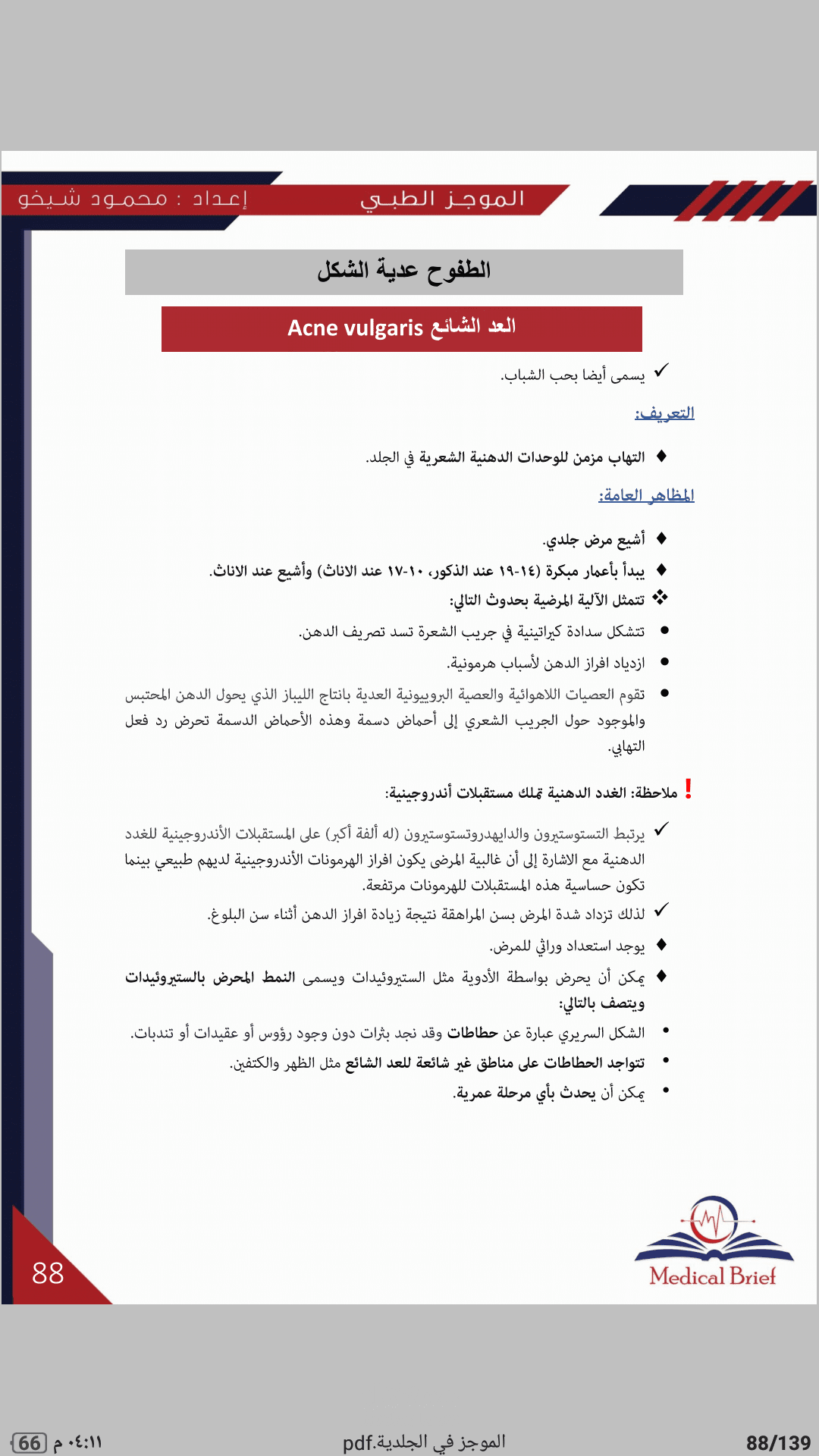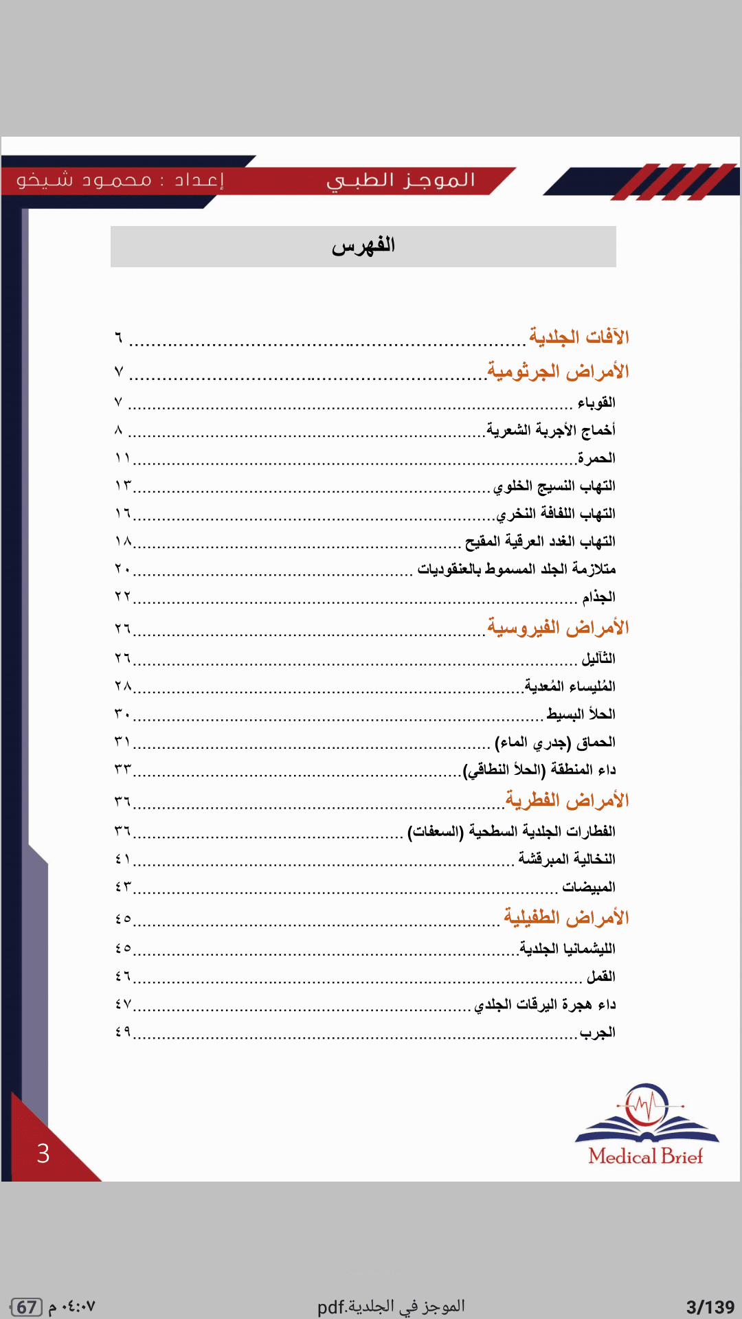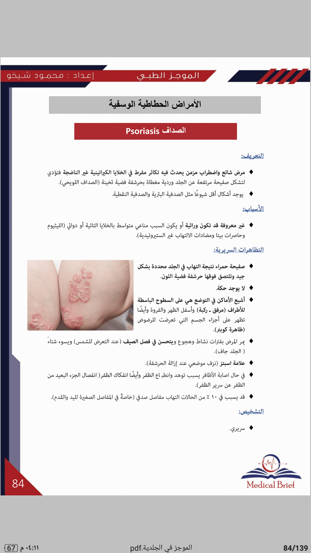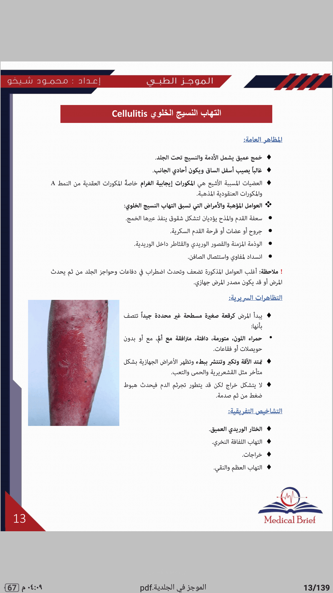 يضم كتاب الموجز في الجلدية أهم المعلومات السريرية التي تهم طالب الطب والطبيب العام مع صورة للمرض الجلدي لاعتماد المادة على الذاكرة البصرية بشكل رئيسي بالإضافة إلى مجموعة من الحالات السريرية الهادفة لتسهيل حفظ المعلومات وترسيخها بالذاكرة من خلال عرض حالة سريرية مباشرةً بعد دراسة كل مرض .