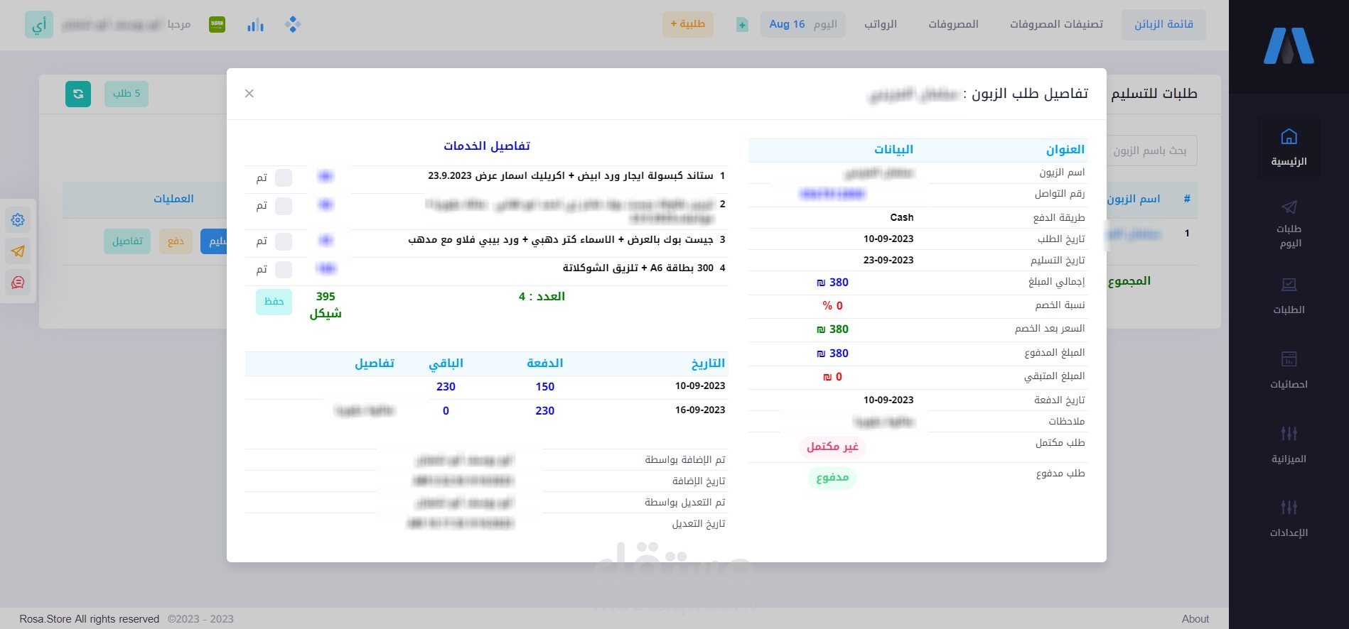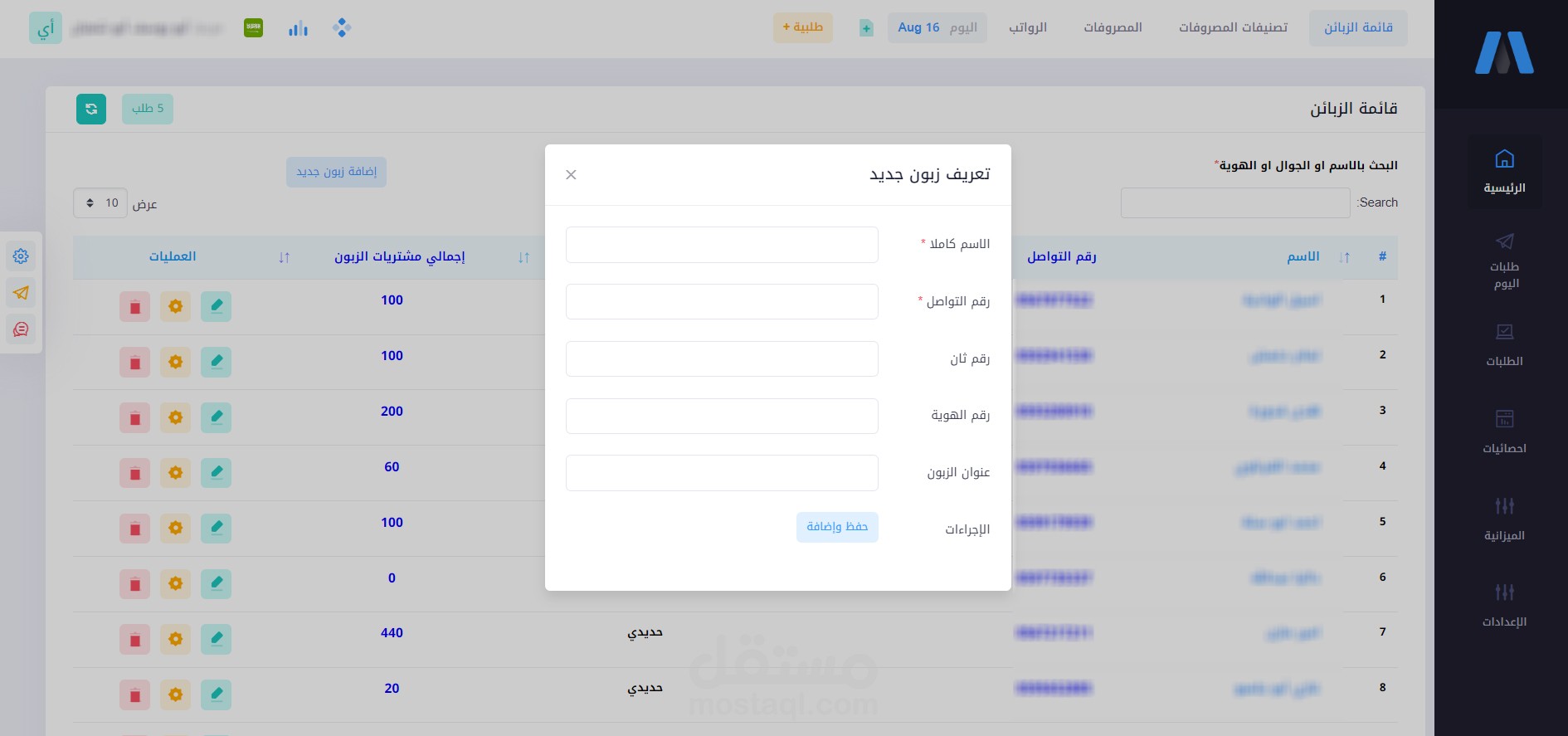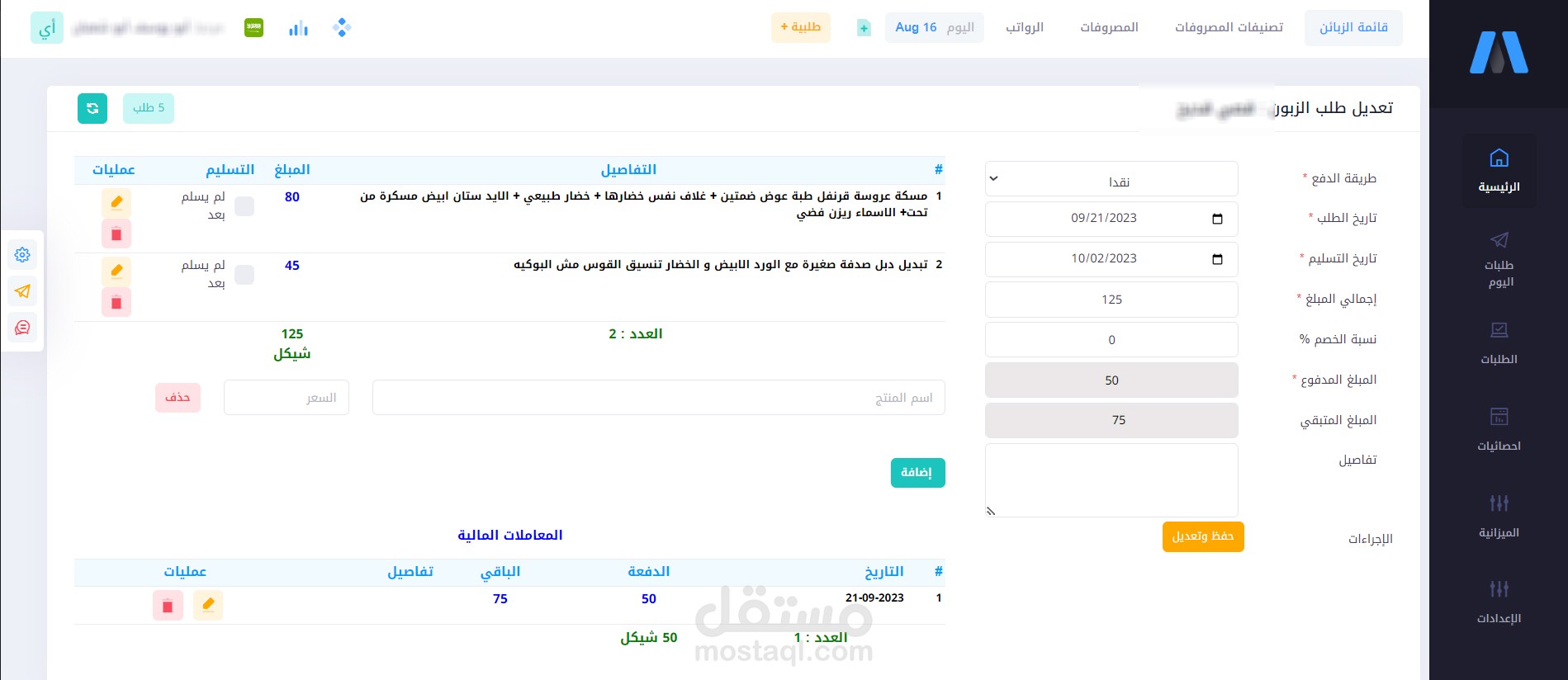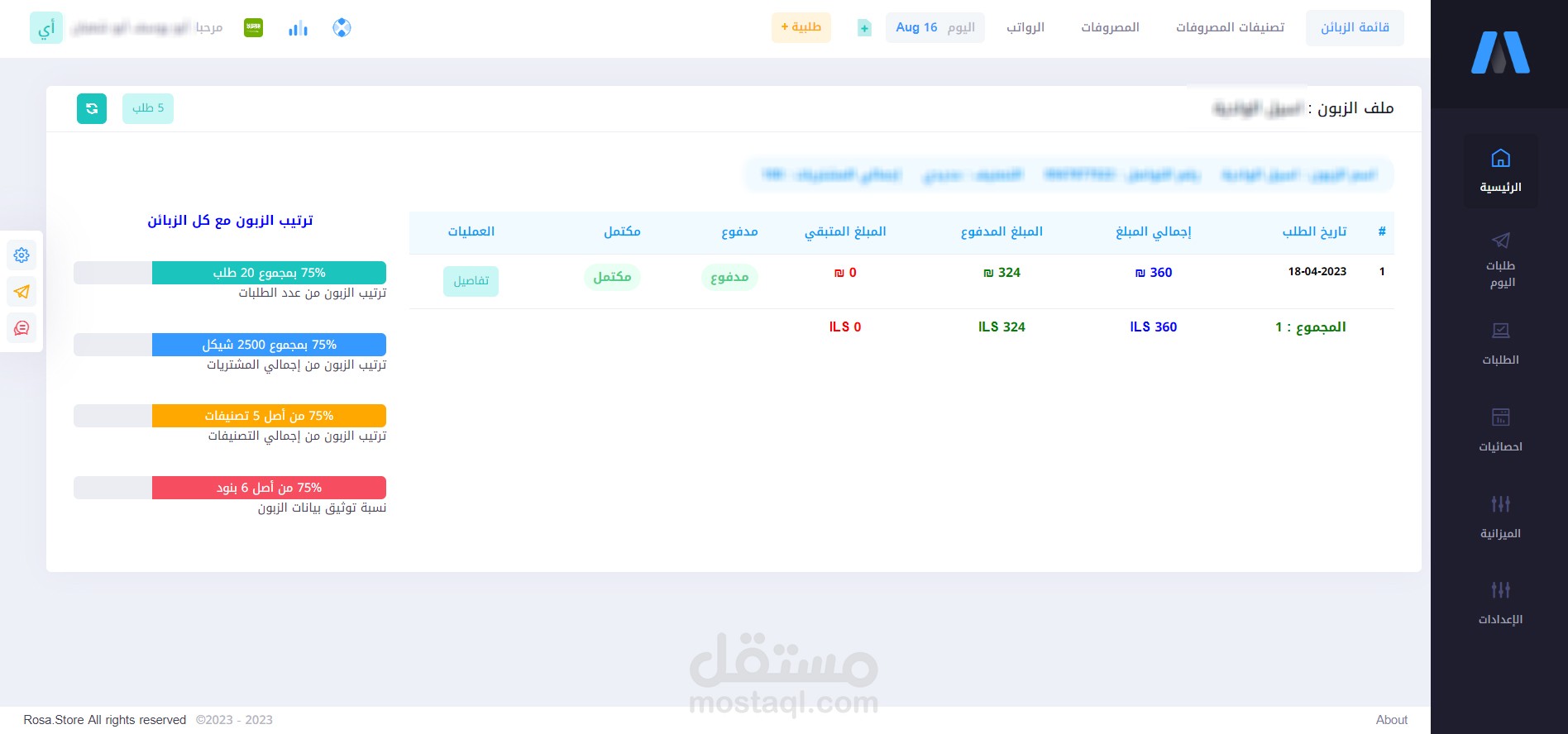 7. ملف العميل الذي يحتوي على طلباته السابقة وإجمالي مبالغ الشراء ونسبة إكمال بياناته على النظام