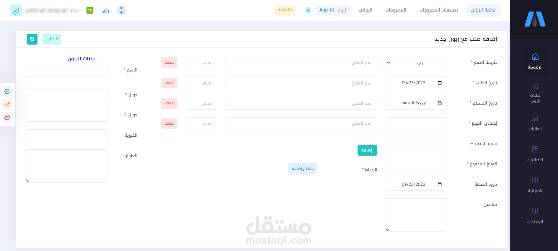 9. امكانية إضافة طلب لزبون غير مدرج على النظام ويتم انشاء ملف وهمي له