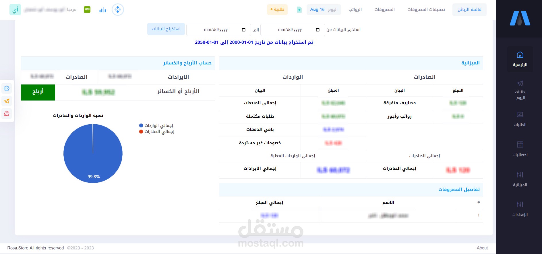 6. واجهة احصائية مع تخصيص مدة الفلترة لدراسة الأرباح والخسائر