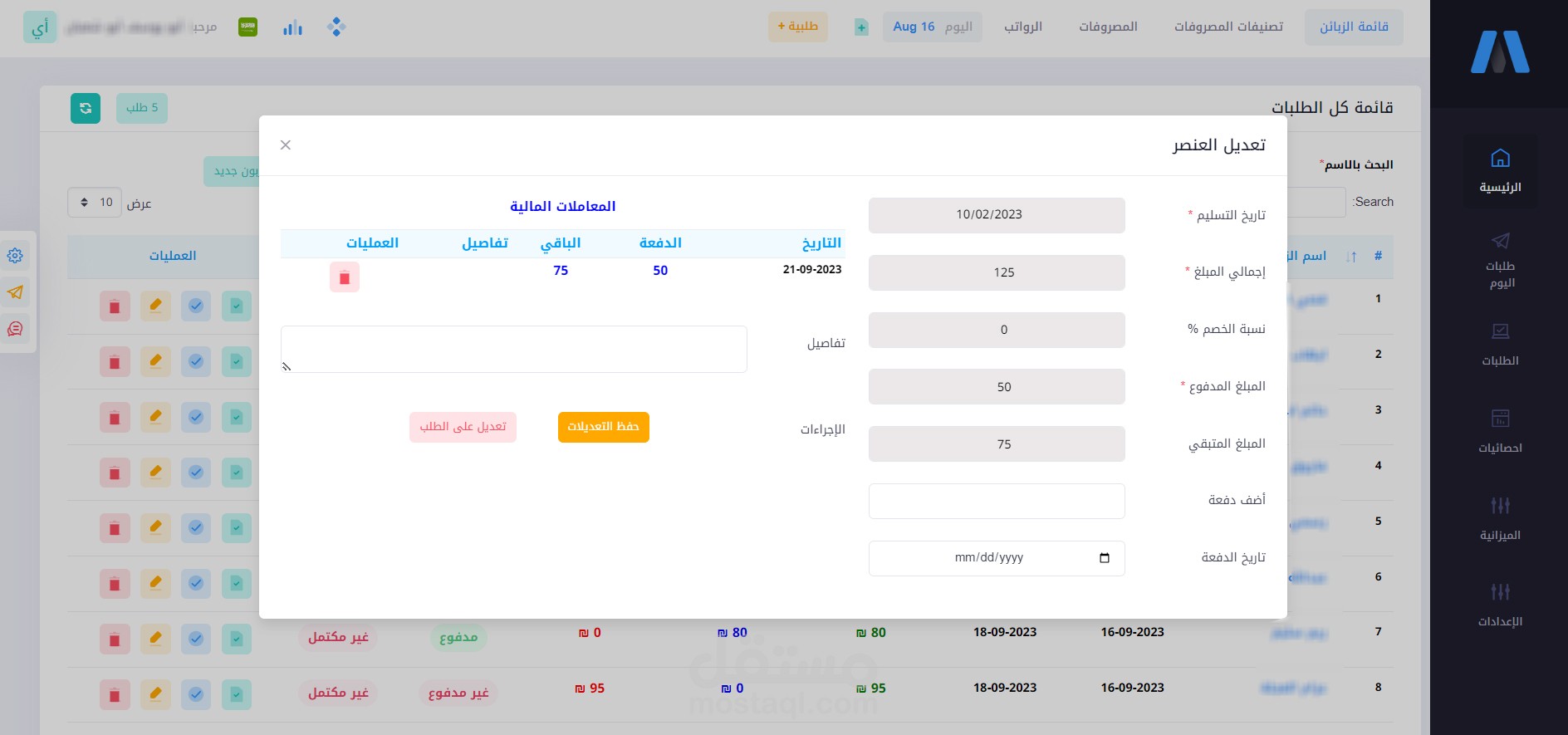 2. قائمة الطلبات وهي أساس النظام حيث تقوم بتجهيز الطلب للعميل وحساب سعره وموعد تسليمه