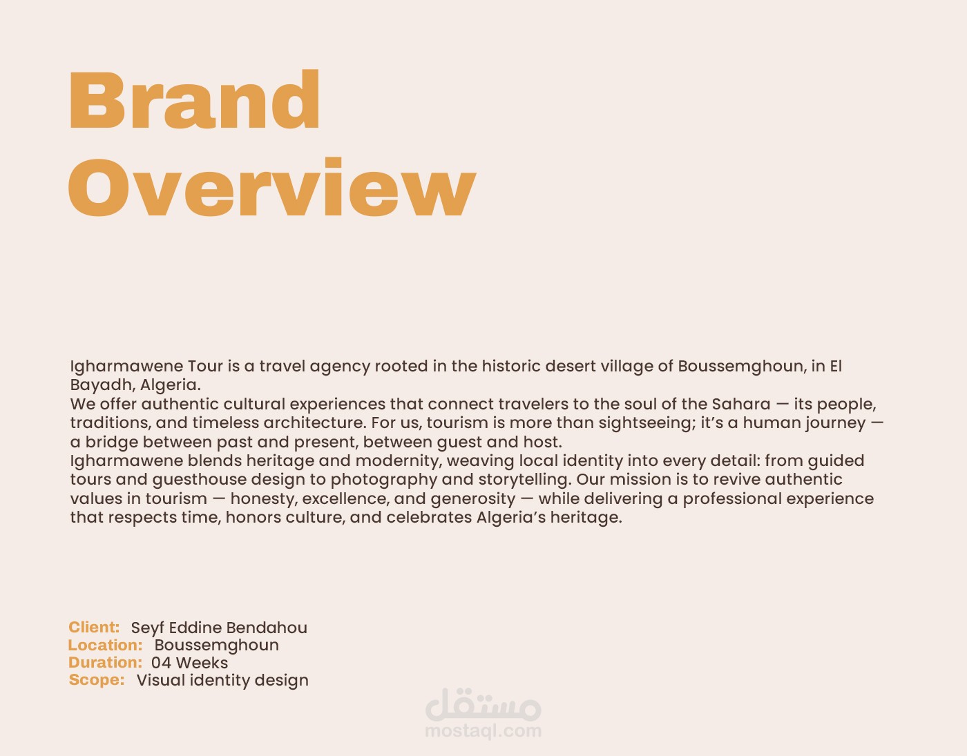 وكالة إيغرماون تور هي مشروع سياحي وُلد في قلب مدينة بوسمغون، أحد القصور التاريخية ضمن أطلس الصحراء في الجزائر. تستلهم العلامة روح التراث والضيافة والاكتشاف، وتدعو المسافرين إلى رحلة تعرّفهم على العمارة العريقة، والثقافة الأصيلة، وجمال الطبيعة الصحراوية الممتدة منذ قرون.