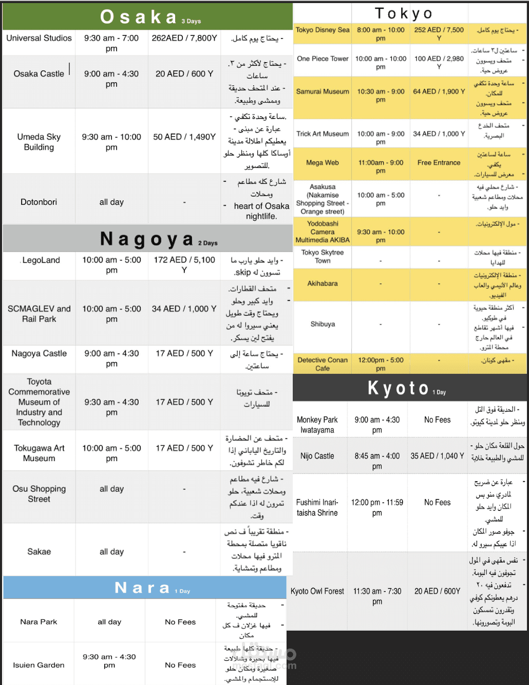 جدول سفر لليابان لعدة مناطق
