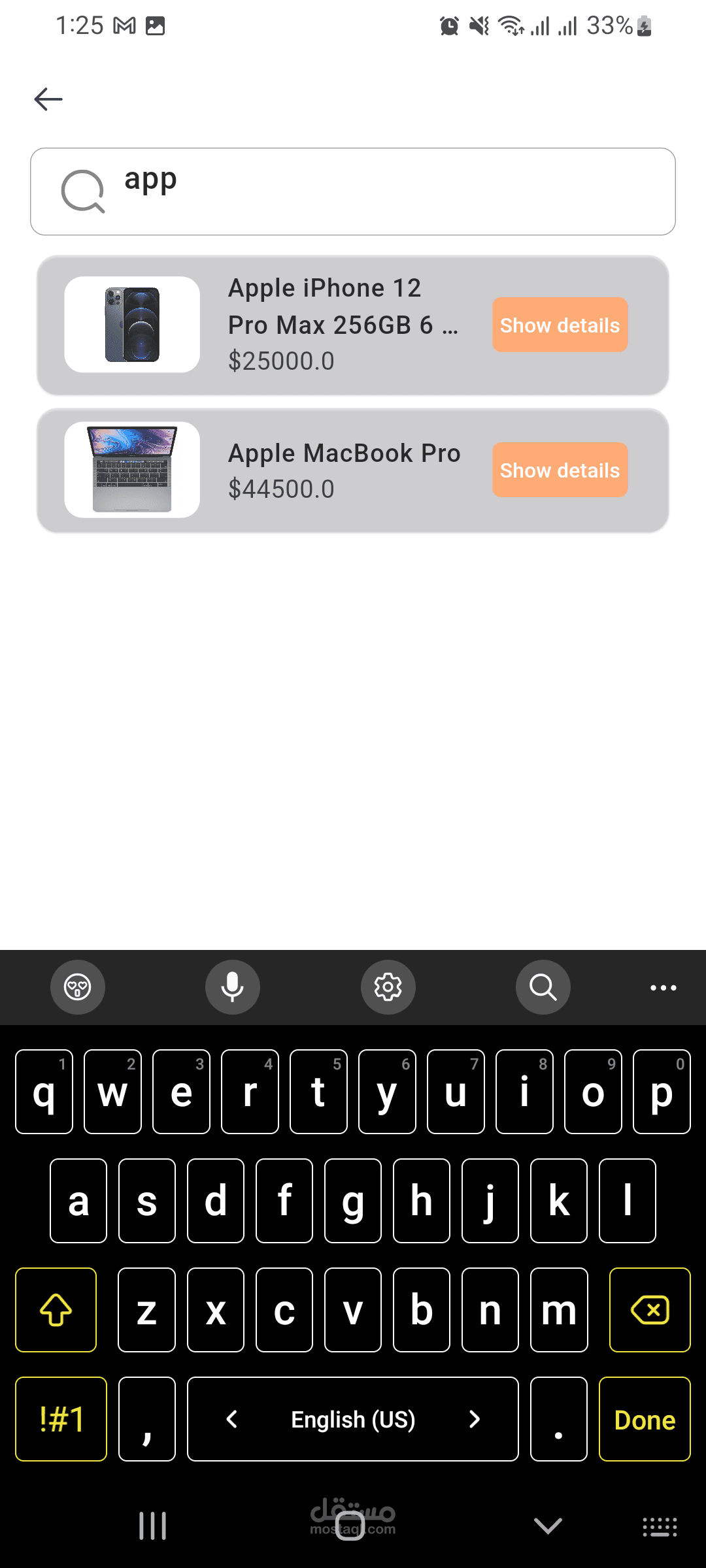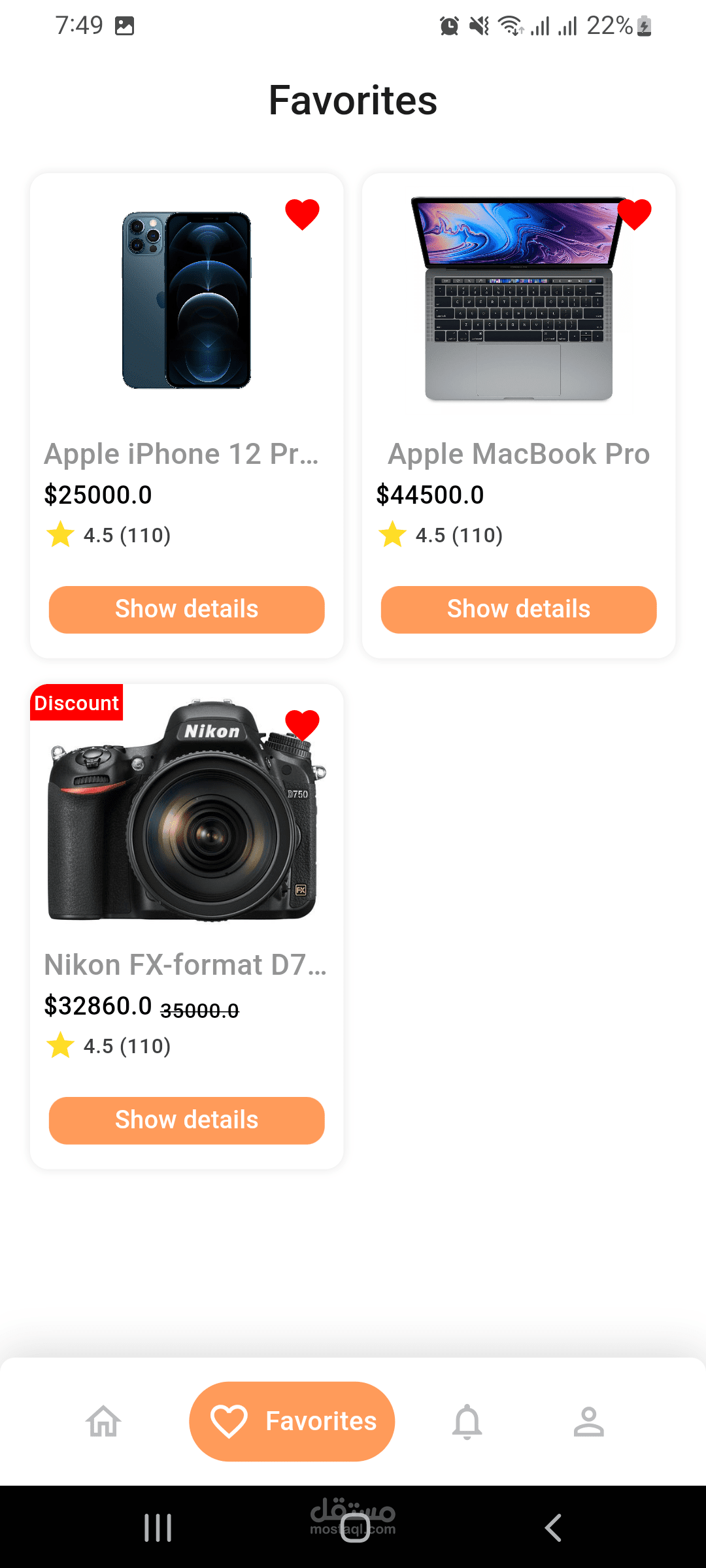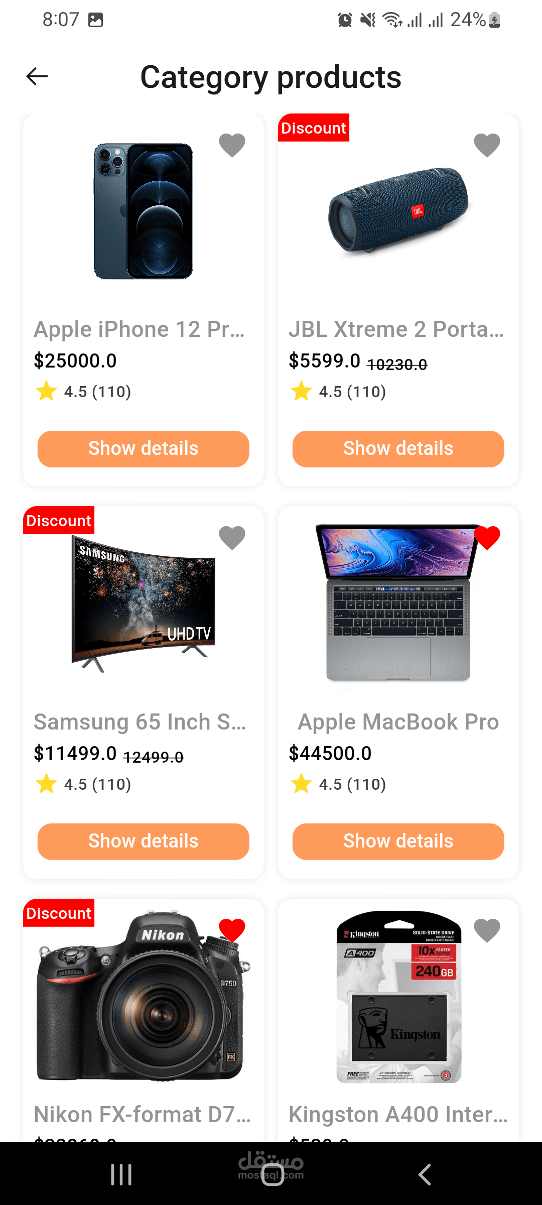 كل منتج يحتوي على معلومات تفصيلية مثل: اسم المنتج، السعر، وصف مختصر، وسعر الخصم في حال توفره.