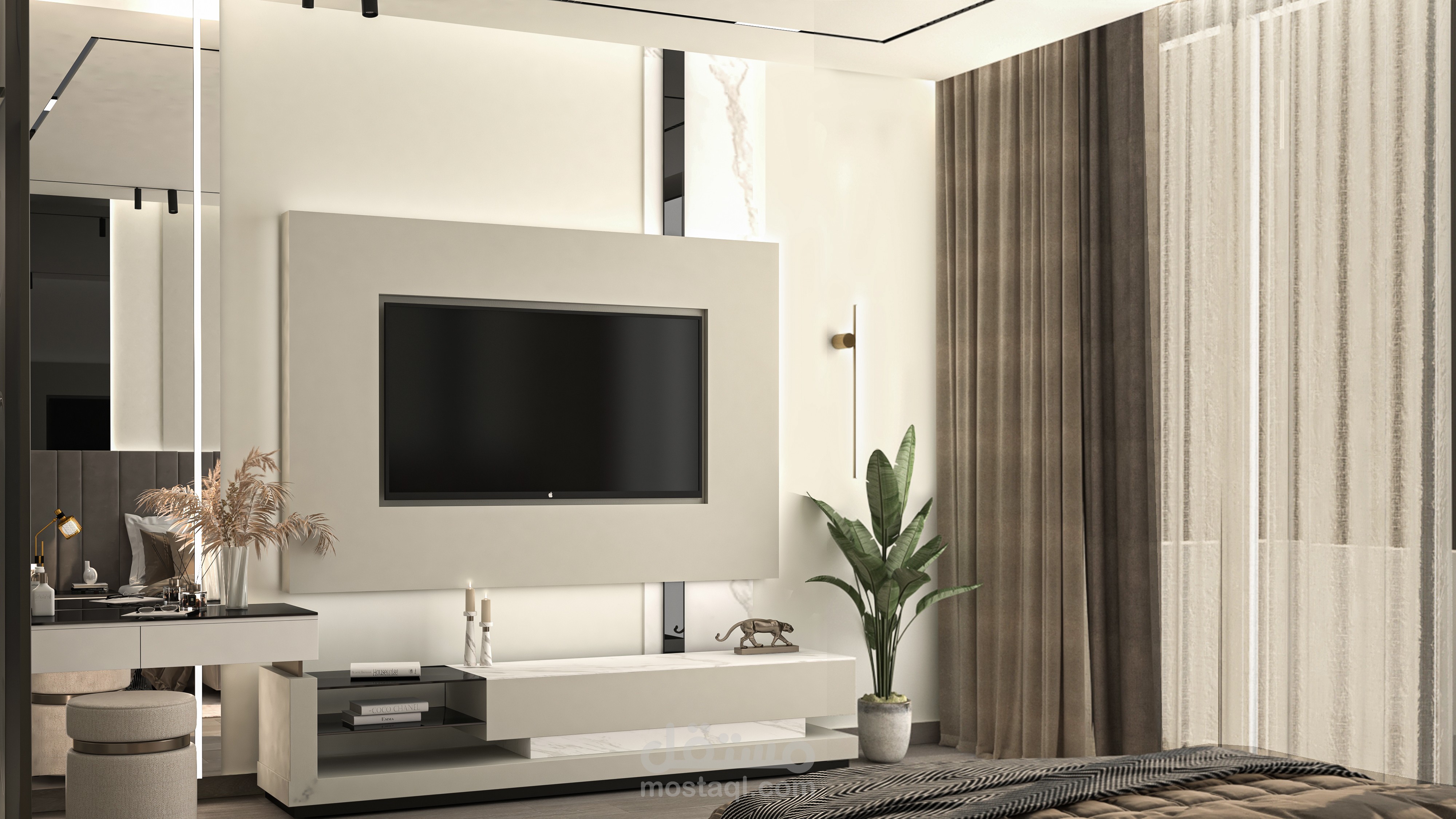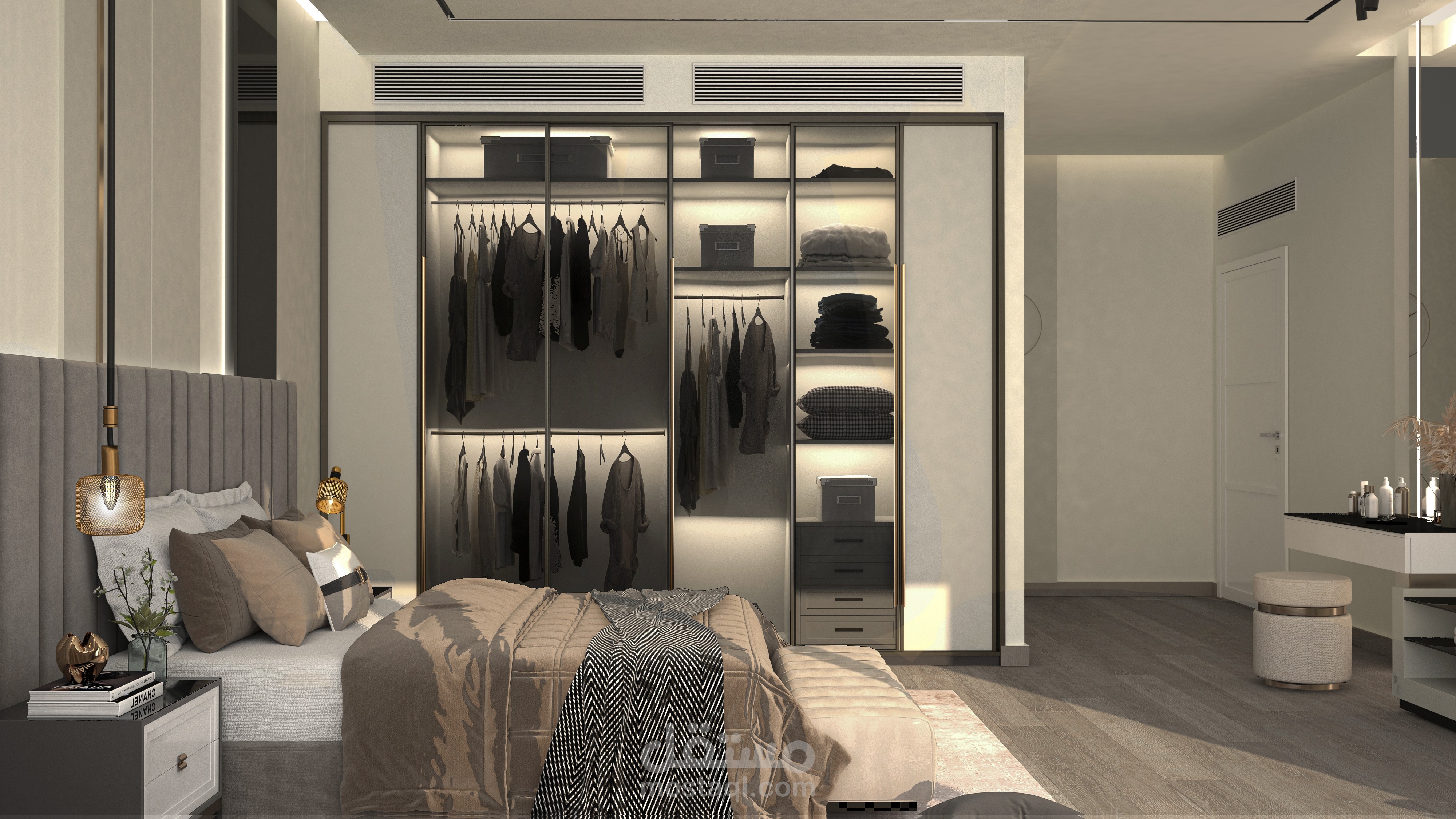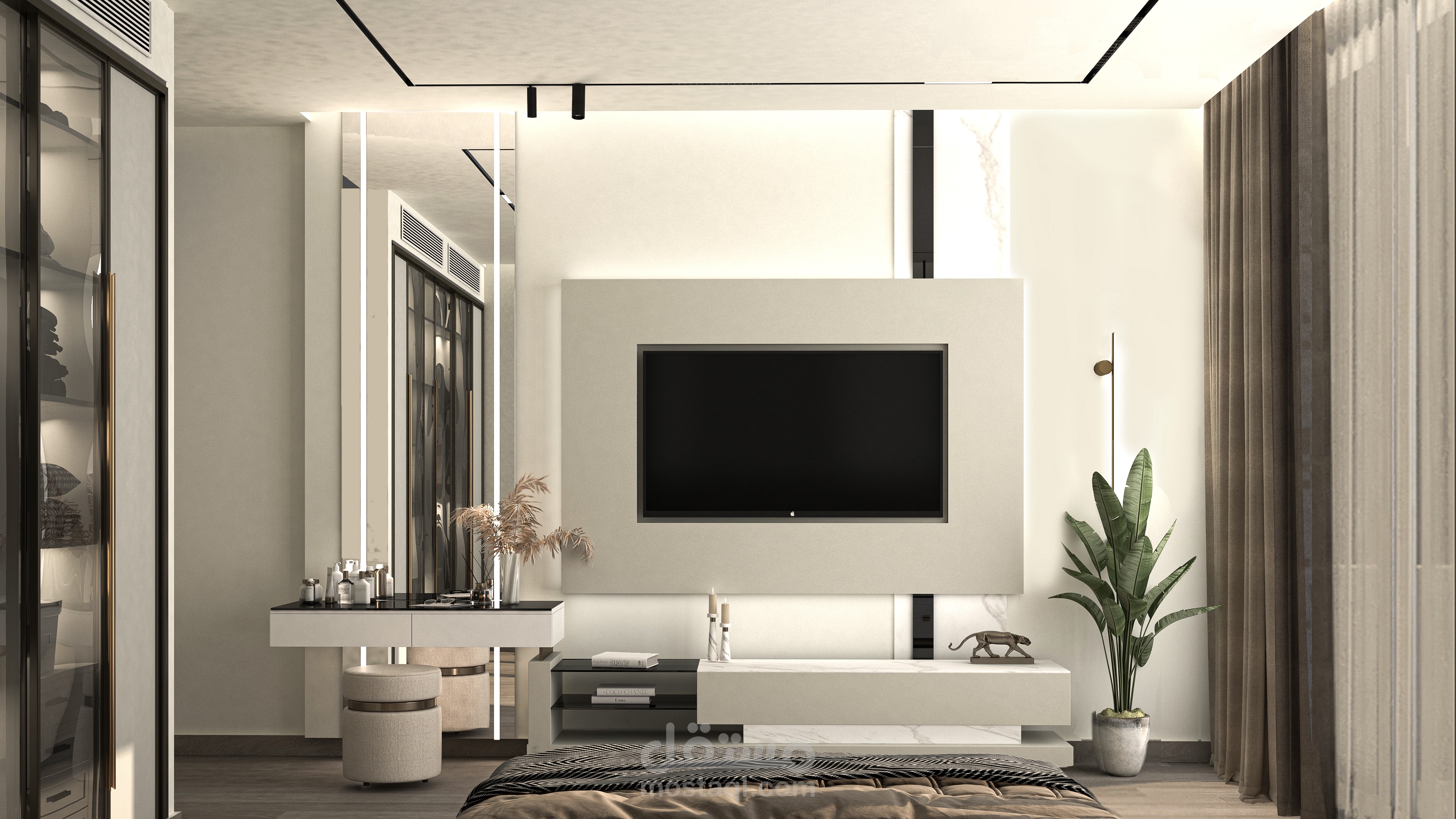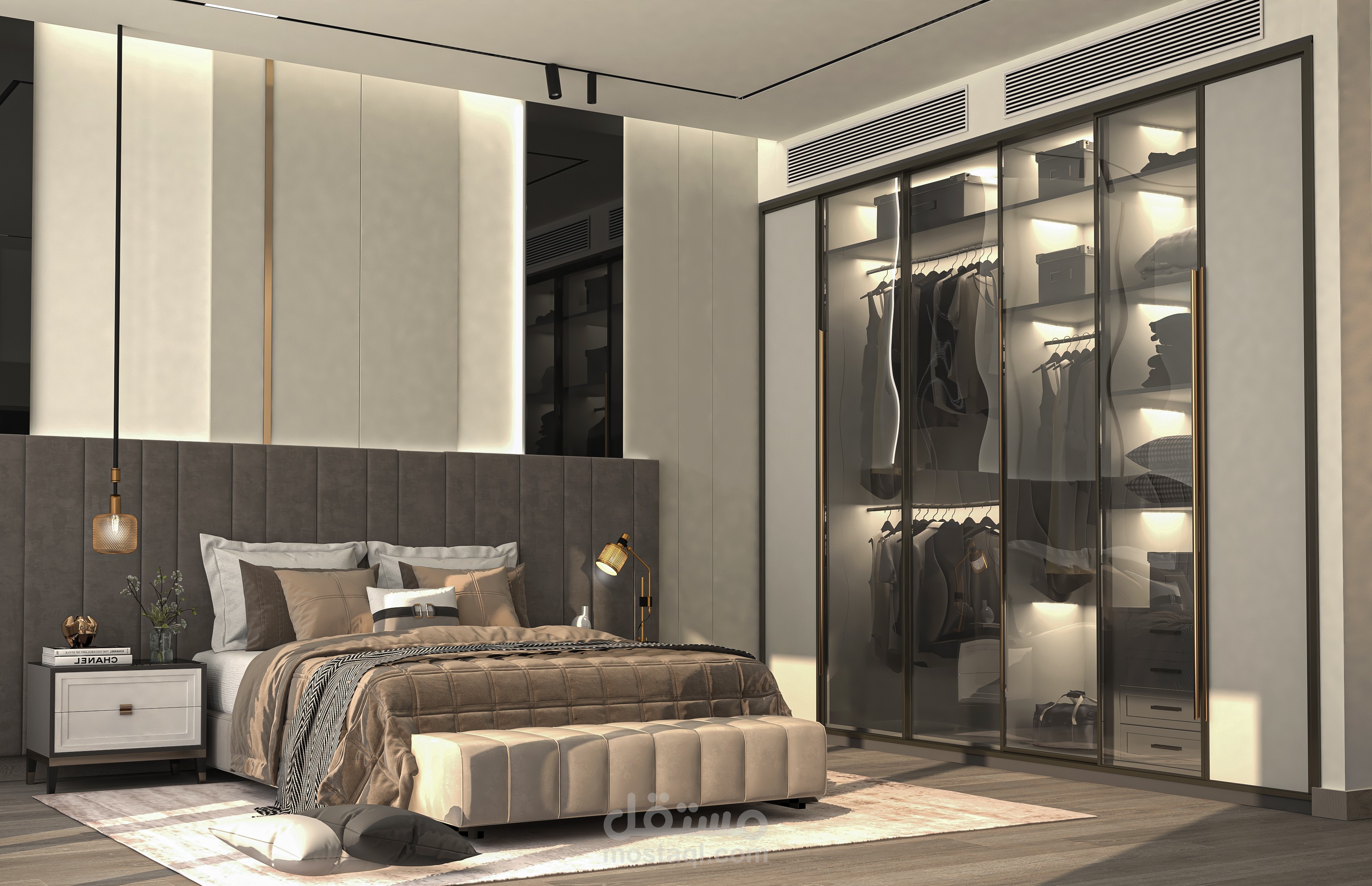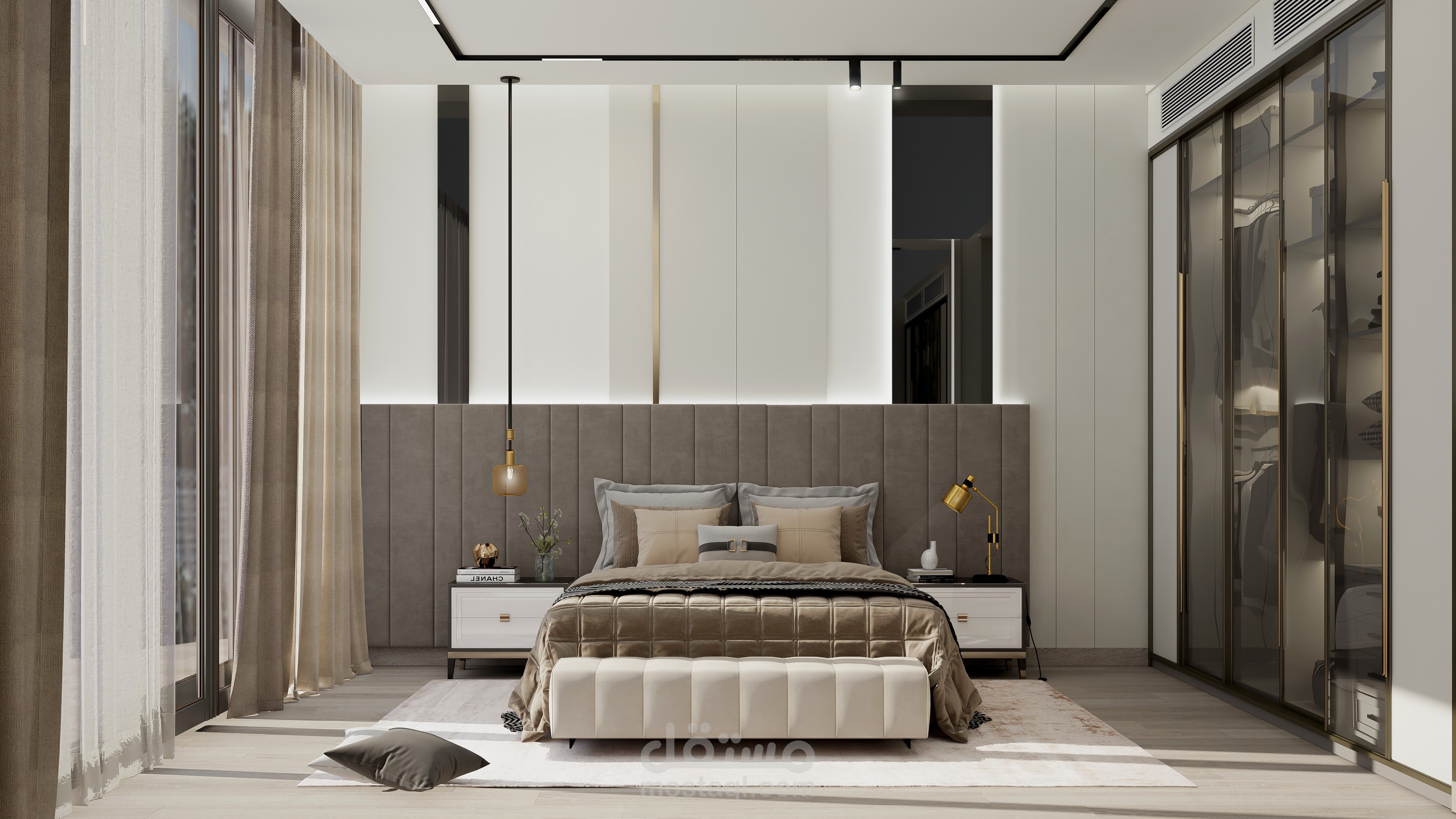 Modern bedroom with accurate choice of warm colors to add coziness and comfort without