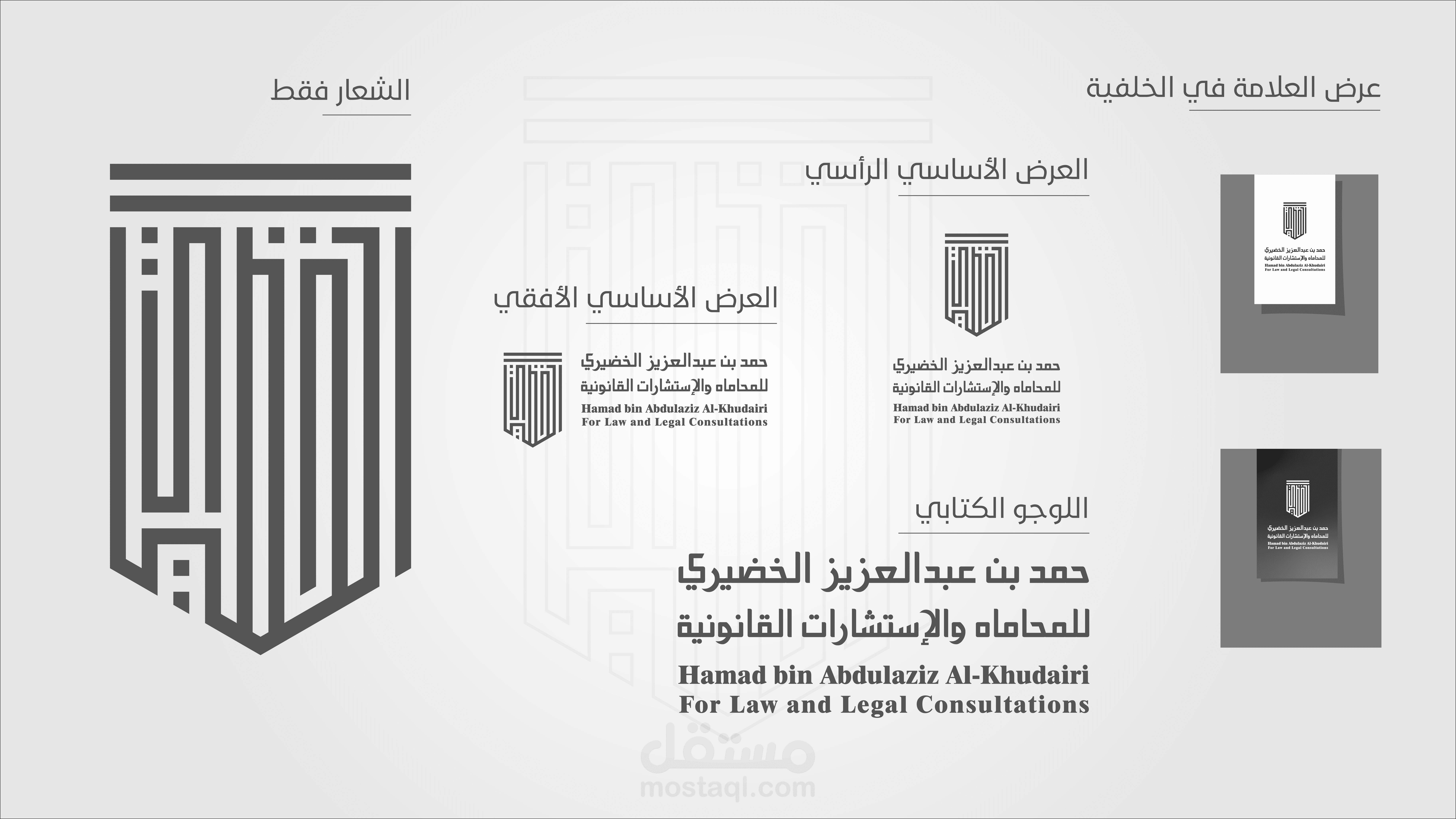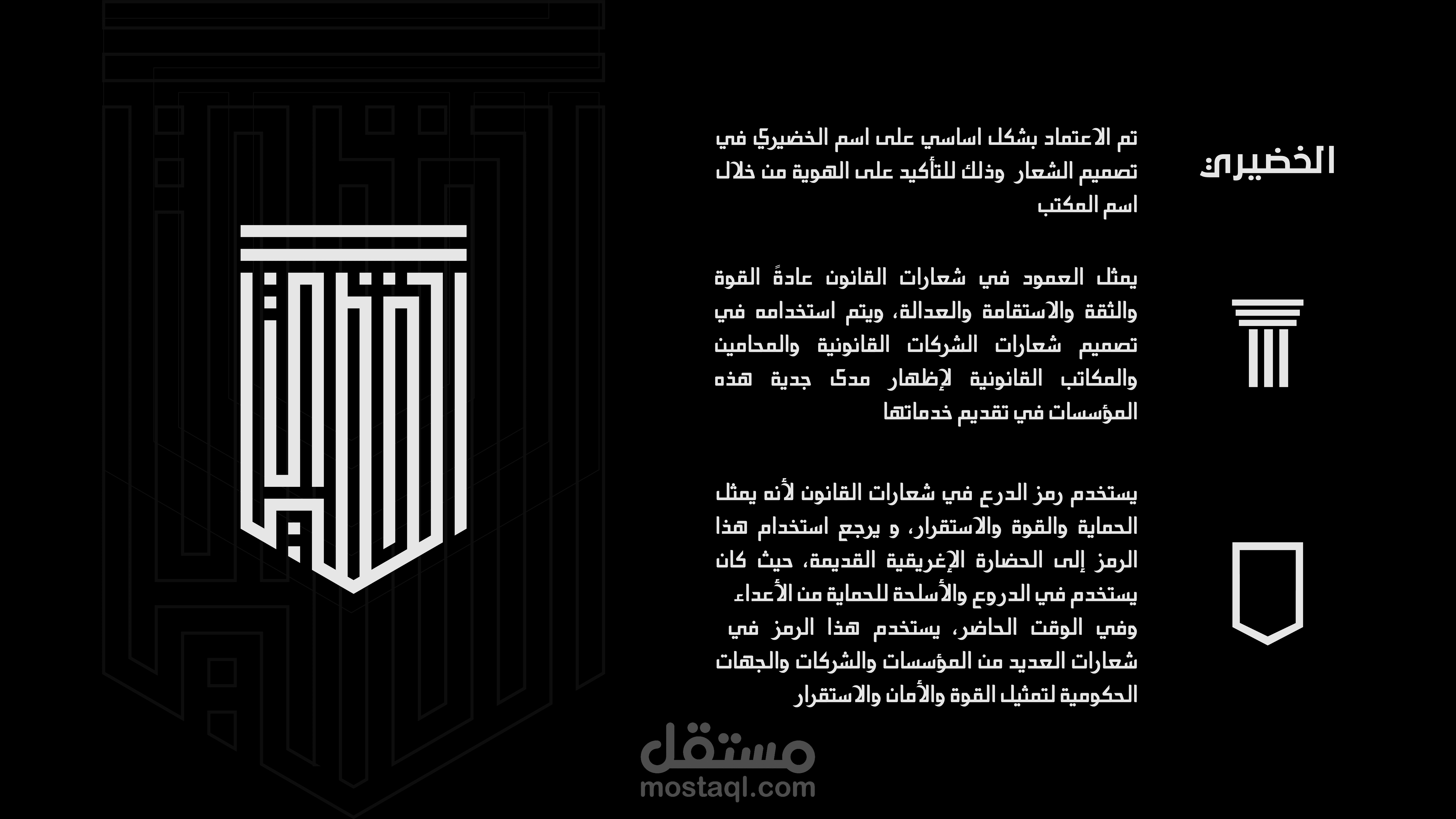 عند العمل على شعار مكتب الخضيري للمحاماه كان هناك الكثير من التحديات حتى يصبح الشعار بهذا الشكل ,حيث تم الاستعانة بالعديد من العناصر التي لها علاقة مباشرة بالقوة والدفاع والاستقامة والقانون مثل الدرع والعمود الأغريقي ومن ثم أسم المكتب .