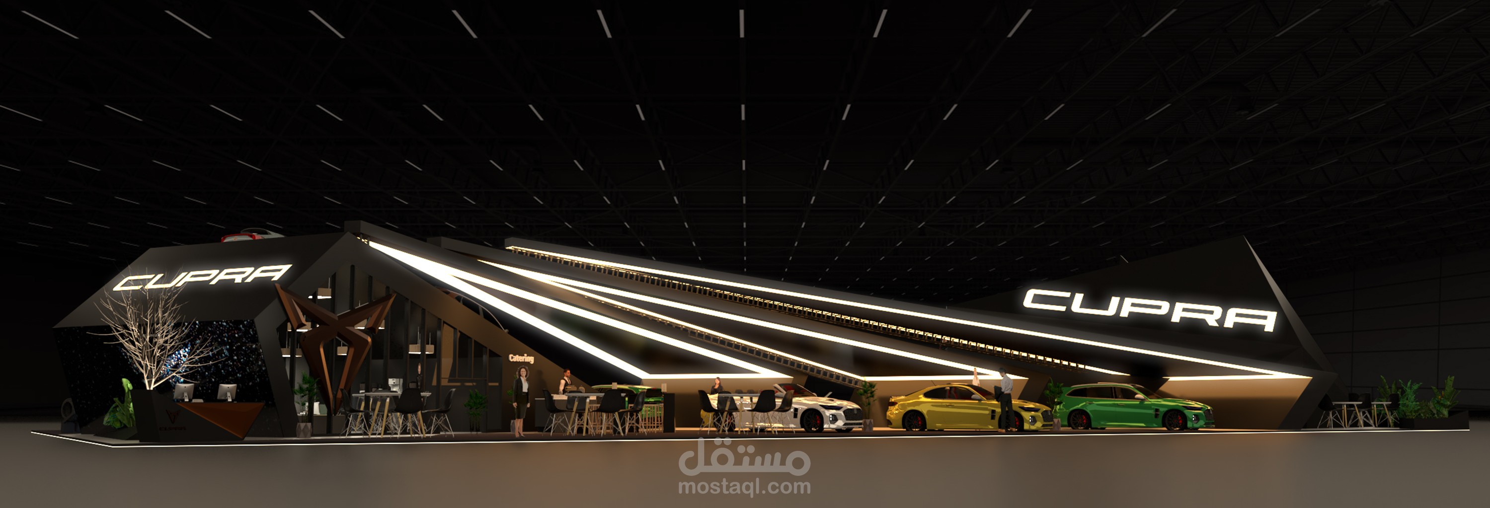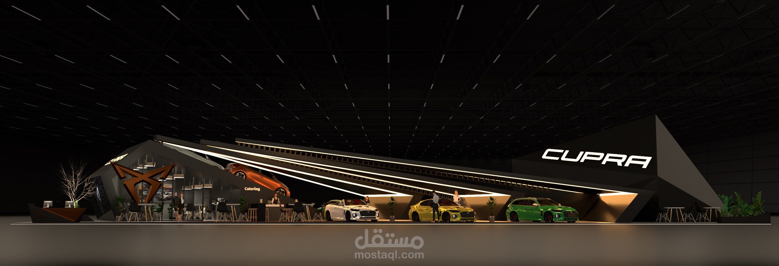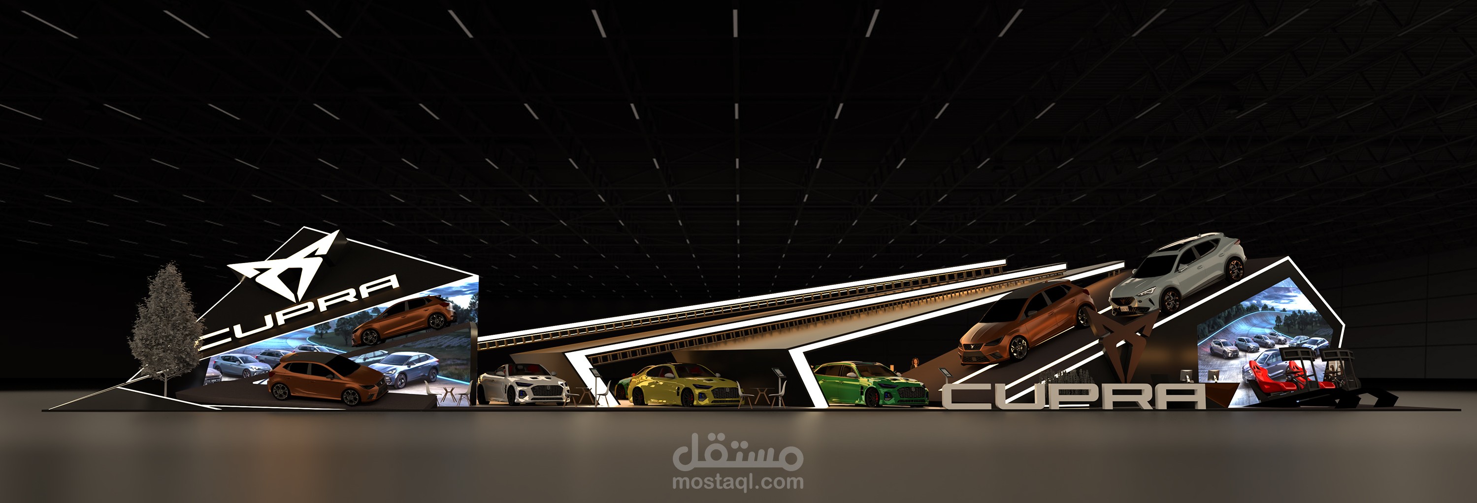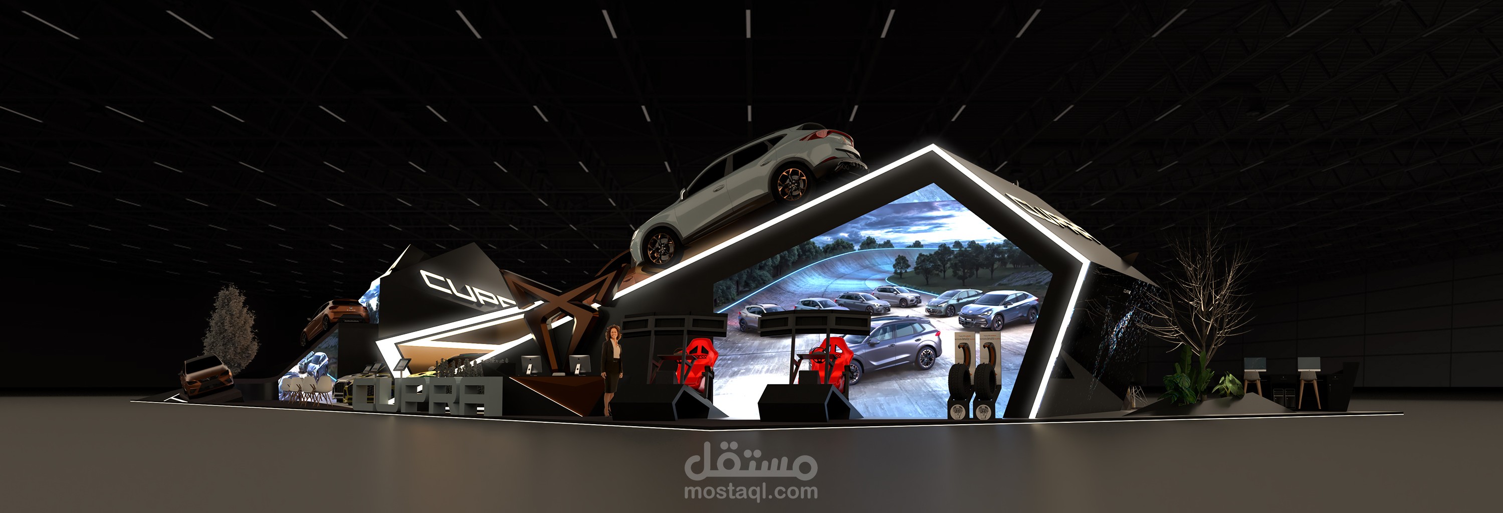 This concept was developed to be both eye-catching and functional, creating a dynamic space that immerses visitors in the CUPRA experience.