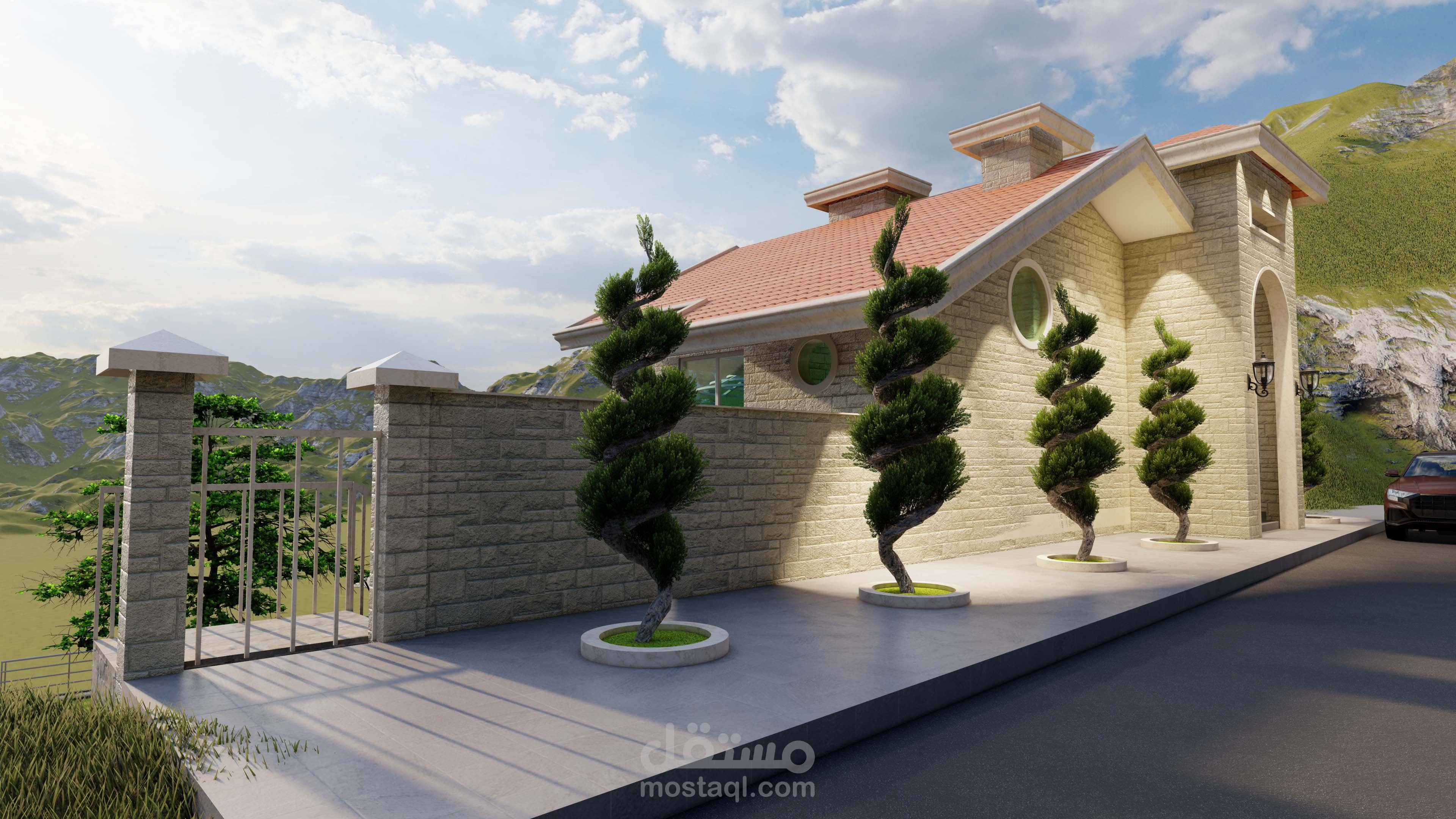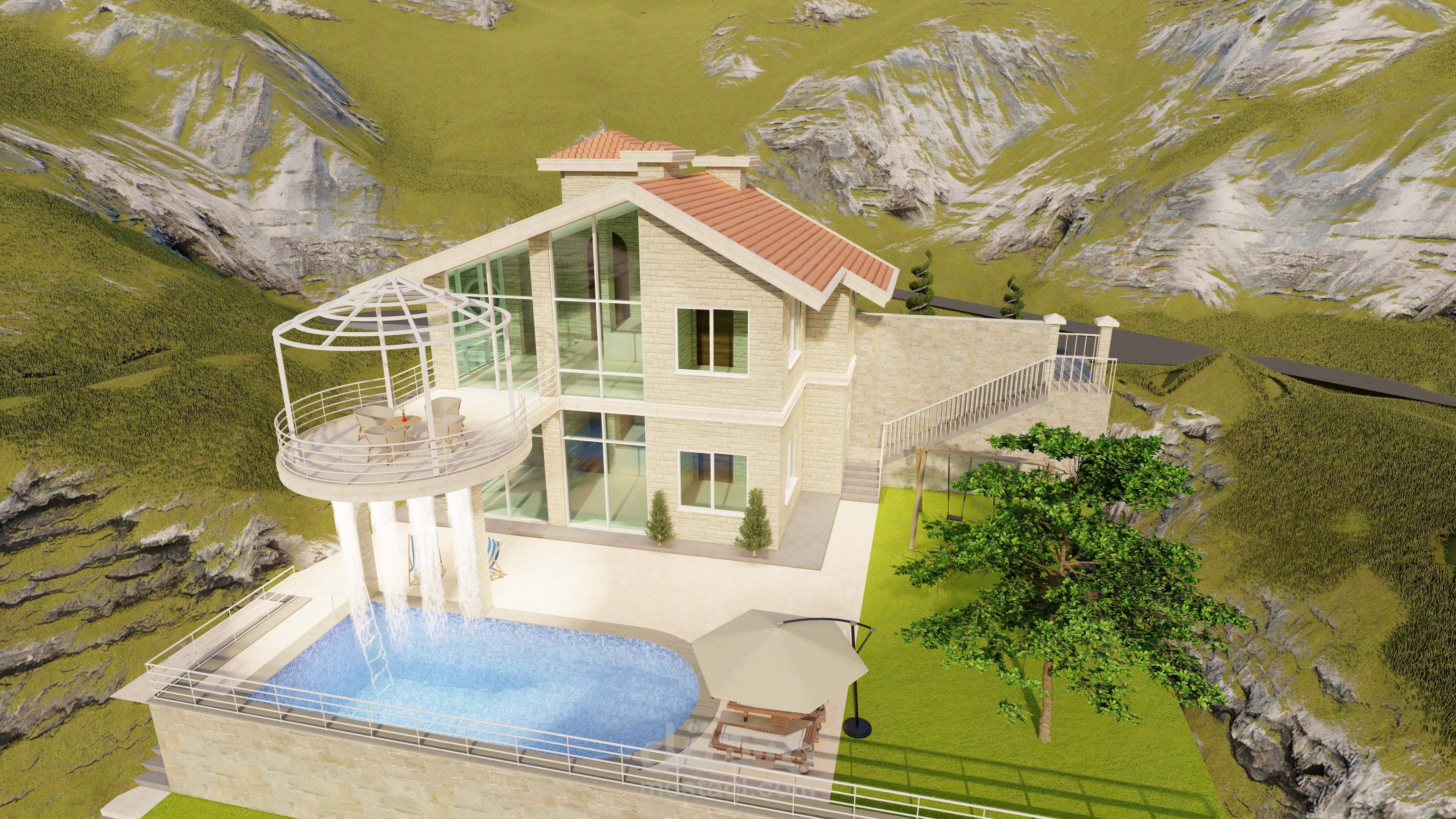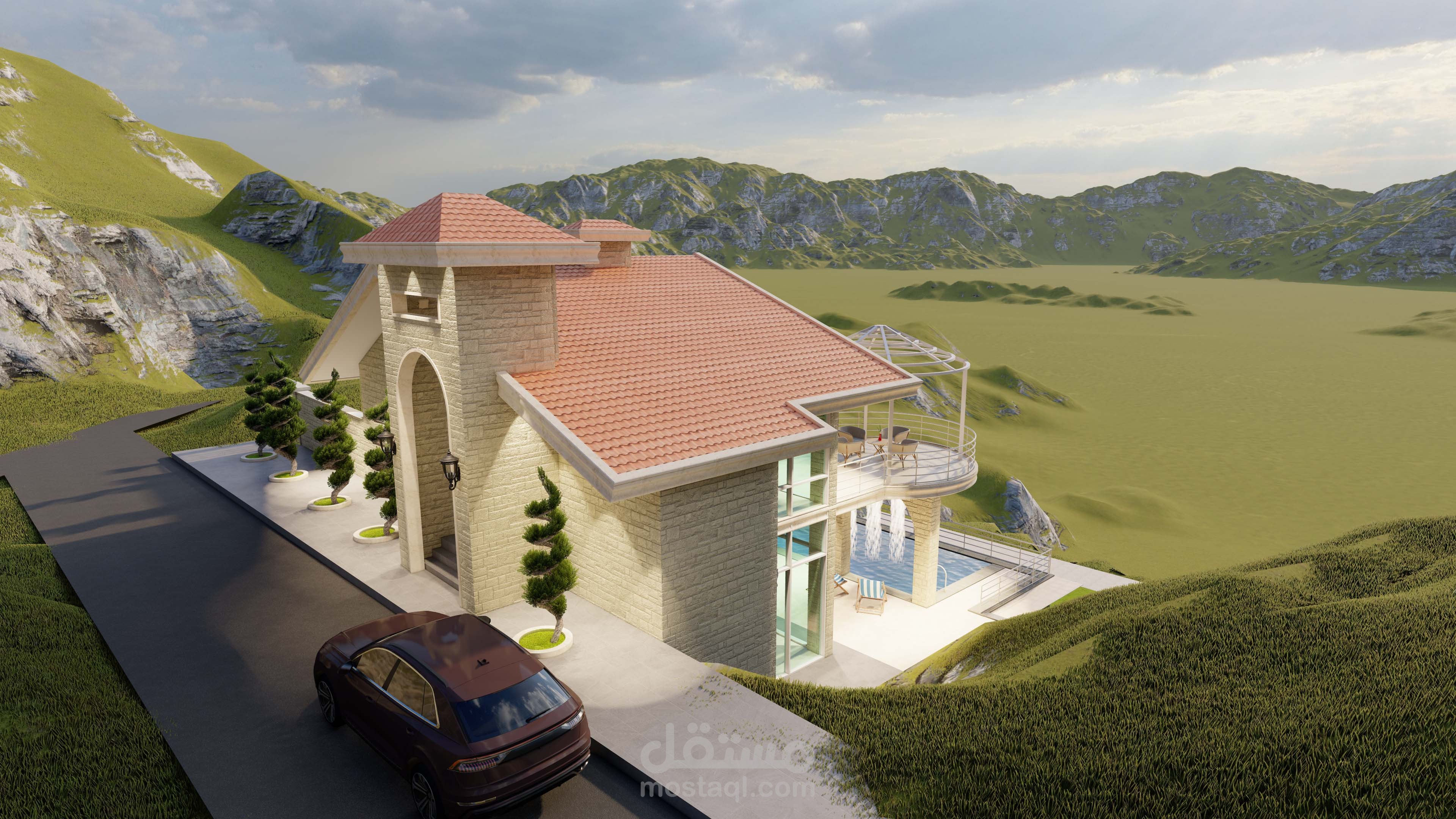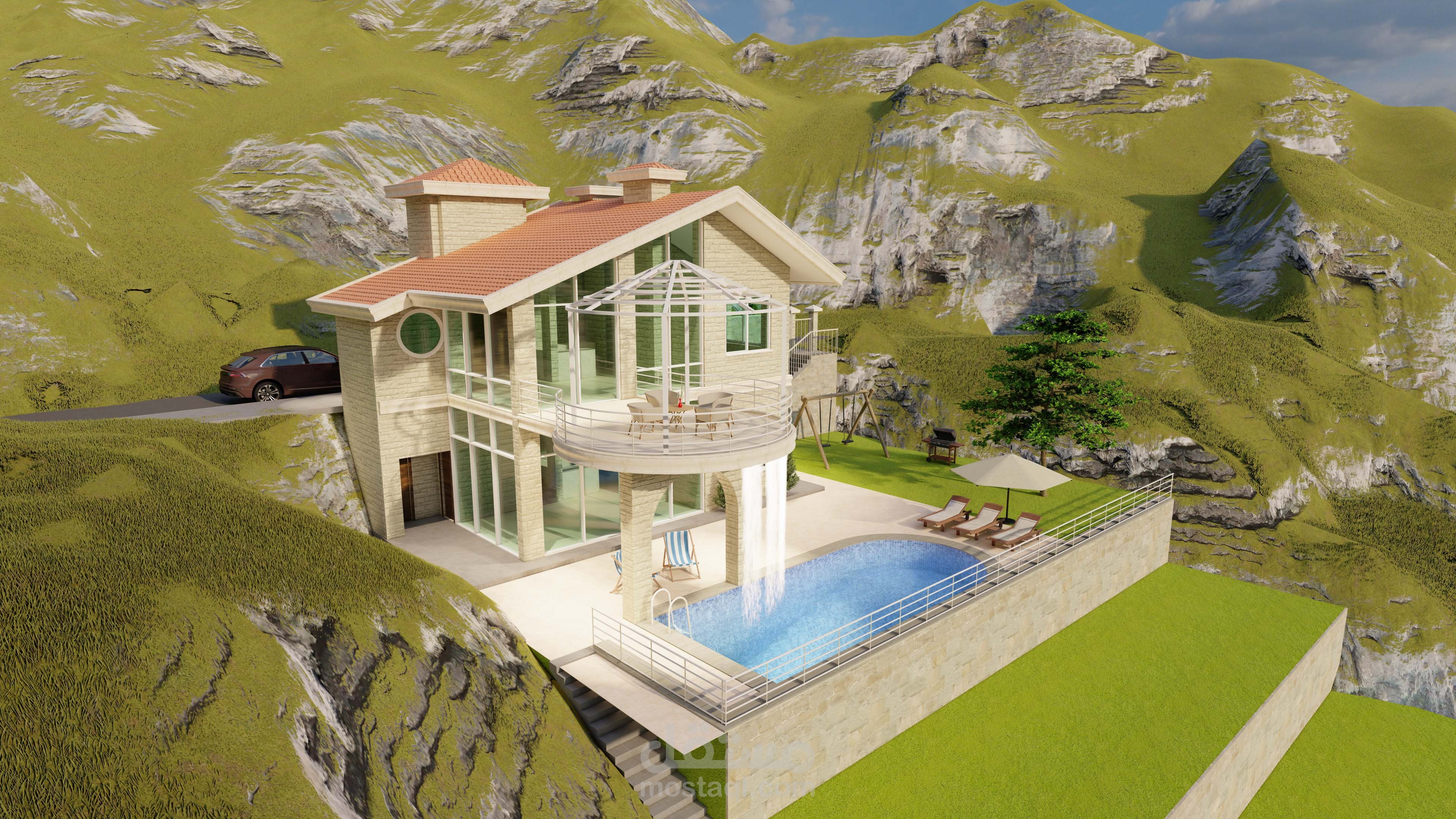 تصميم فيلا مميزة ضمن بيئة جبلية خاصة مع حمام سباحة و شلال بطريقة فريدة و تراس باطلالة ساحرة