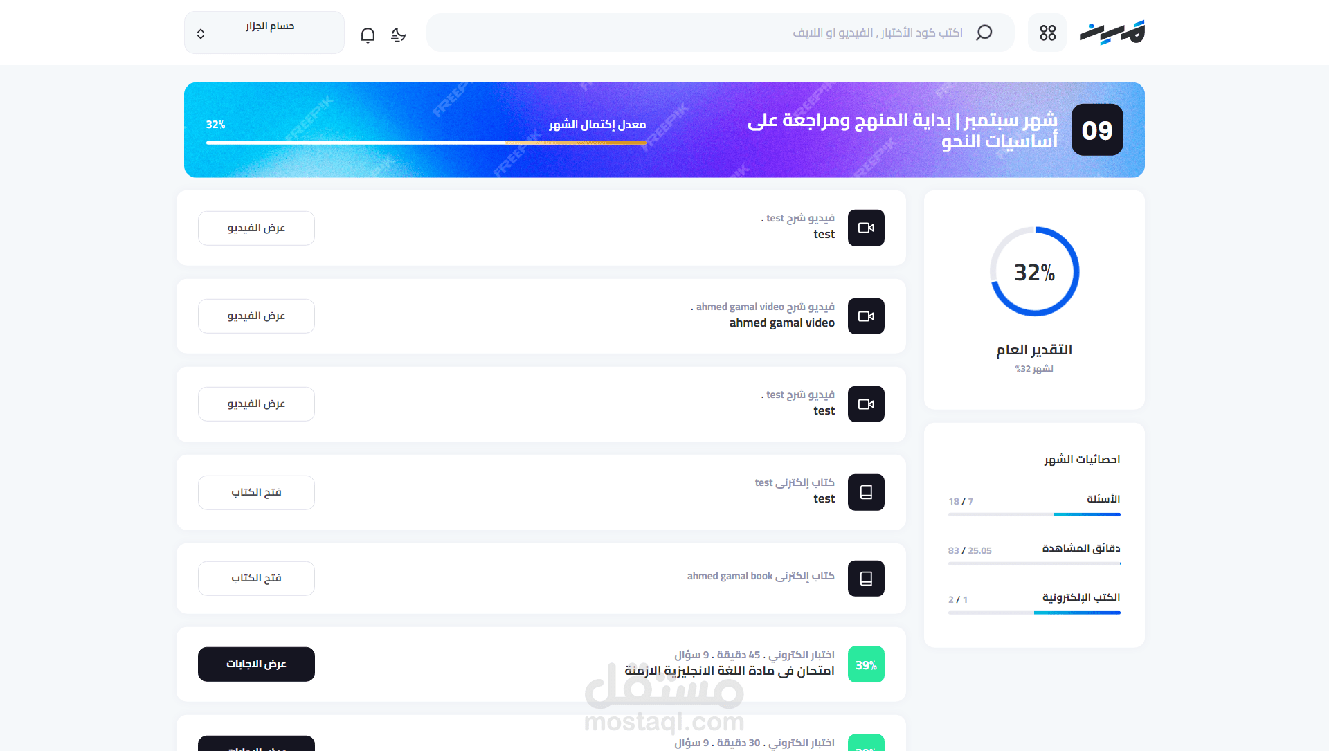 * تقرير شهرى عن أداء الطالب فى الامتحانات على مدار الشهر