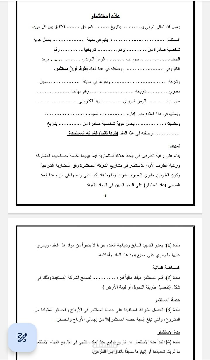 يوضح المساهمة المالية، ومدة الاستثمار، وحصة المستثمر من الأرباح، والإلتزامات القانونية لطرفي العقد، وطريقة انهائه.