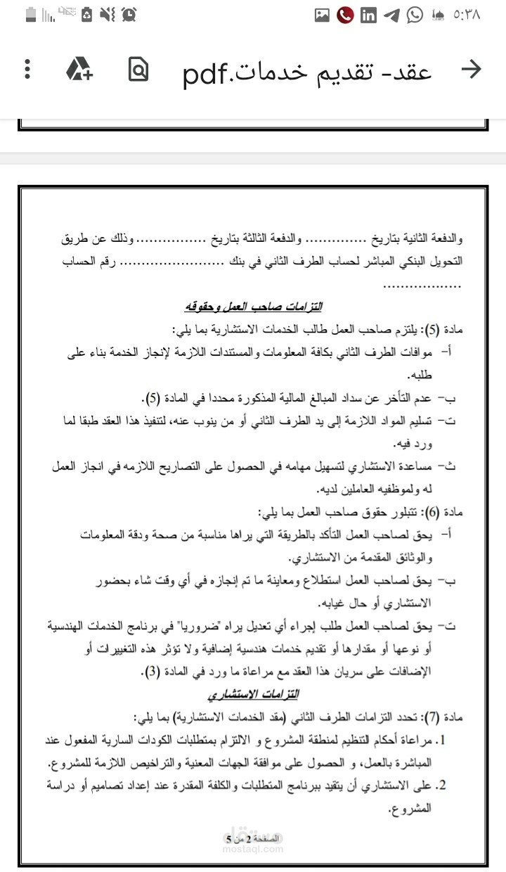 صيغة عقد تقديم خدمات استشارية يوضح نوعية الخدمات، والغرض منها، والغرض منها، وقيمة الخدمات، والتزامات طالب الخدمات وحقوقه، والتزامات الاستشاري وحقوقه، ومراحل إلإنجاز، وضمانة حسن التنفيذ، وحالات فسخ العقد، وحل النزاعات، ووسيلة الإشعارات والمراسلات، وإقرارات المخالصة.