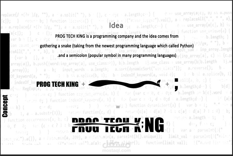 PROG TECH KING is a programming company and the idea comes from gathering a snake (taking from the newest programming language which called Python and a semicolon), popular symbol in many programming languages.