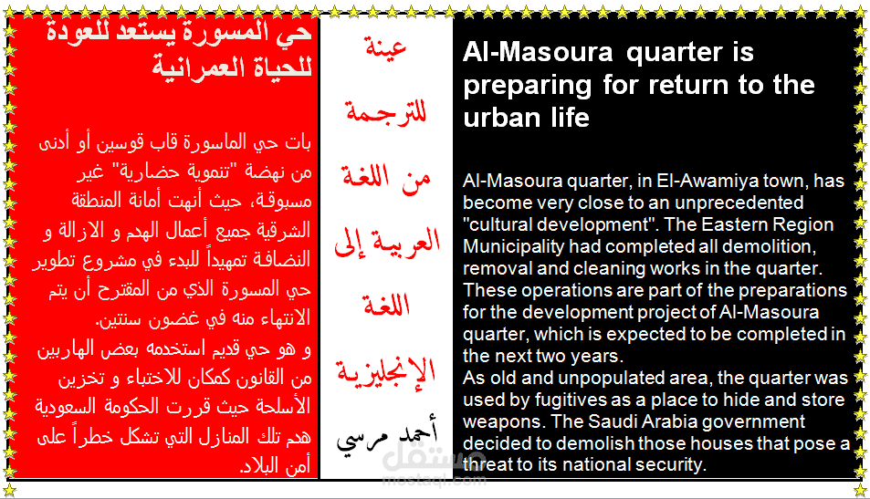 ترجمة لمقال (من العربية إلى الإنجليزية) عن إعادة إعمار أحد الأحياء السكنية بالمملكة العربية السعودية بعدما تصدعت مبانيه وأصبح وكراً للخارجين عن القاانون.