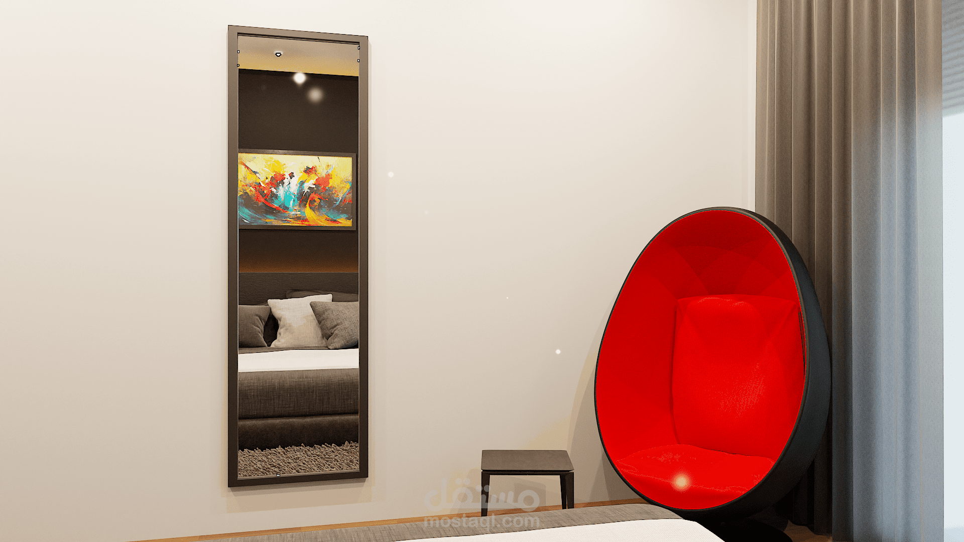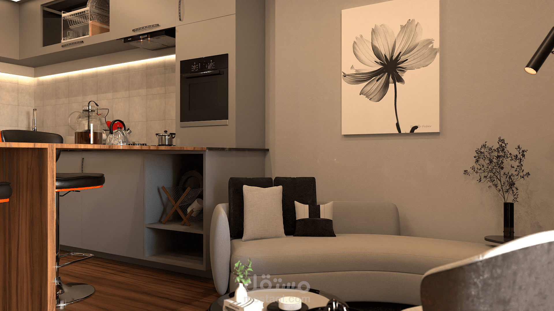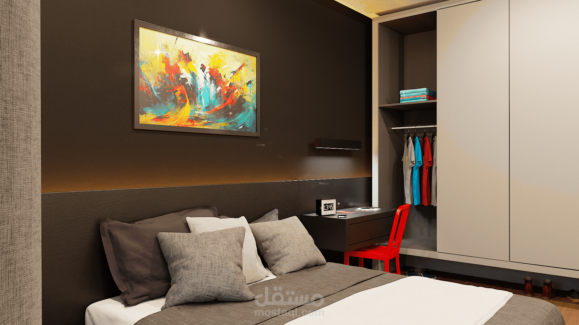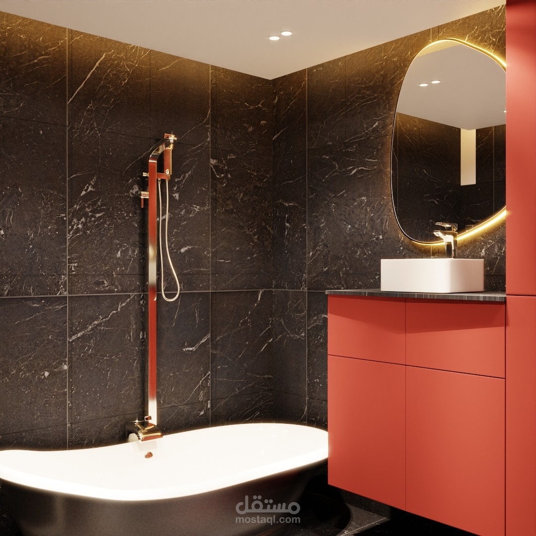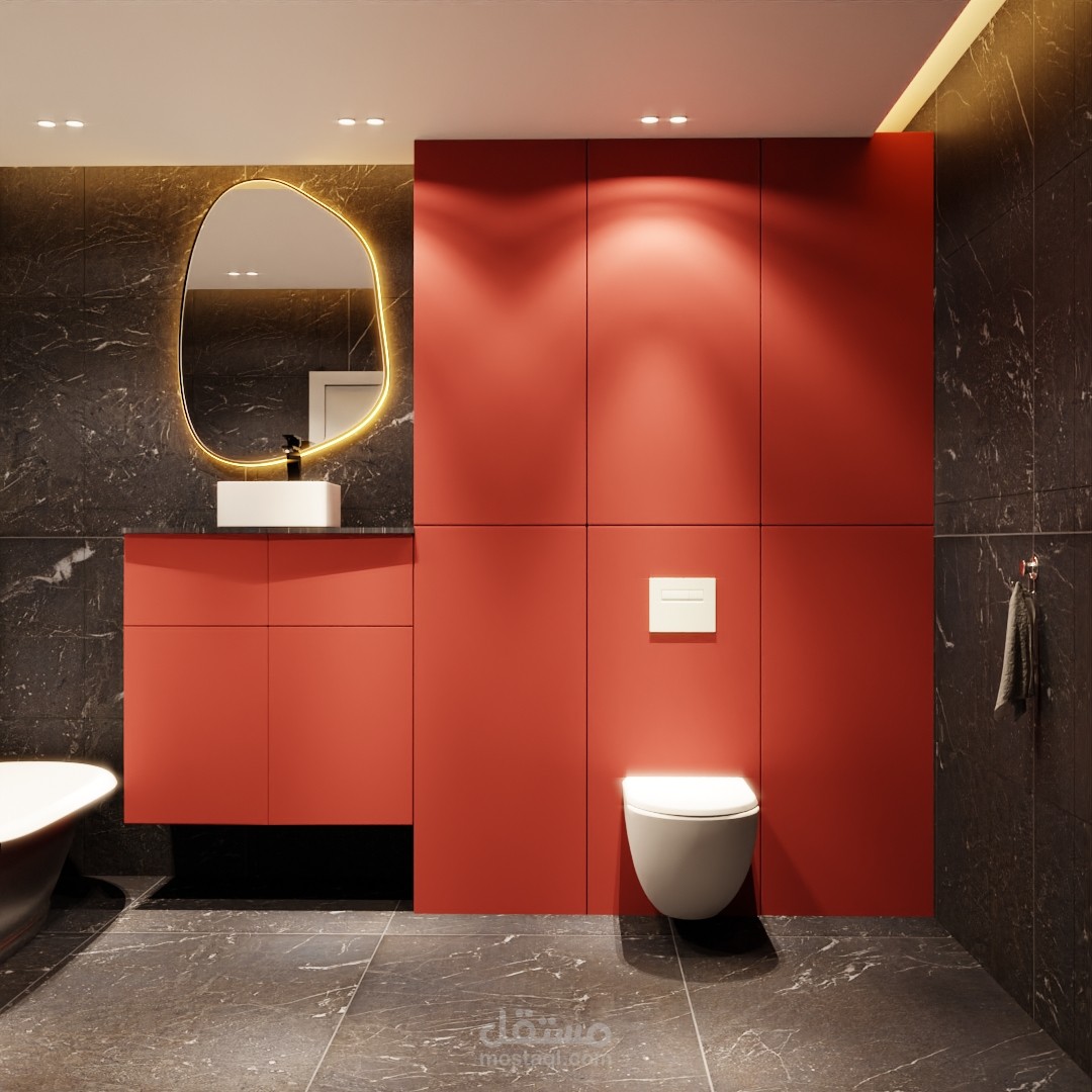تصميم مودرن لشقة يتميز بالمزيج بين الالوان الترابية والنارية مما يعمل على وجود تباين في التصميم وكذللك اللبساطة والسهولة عند التنفيذ .