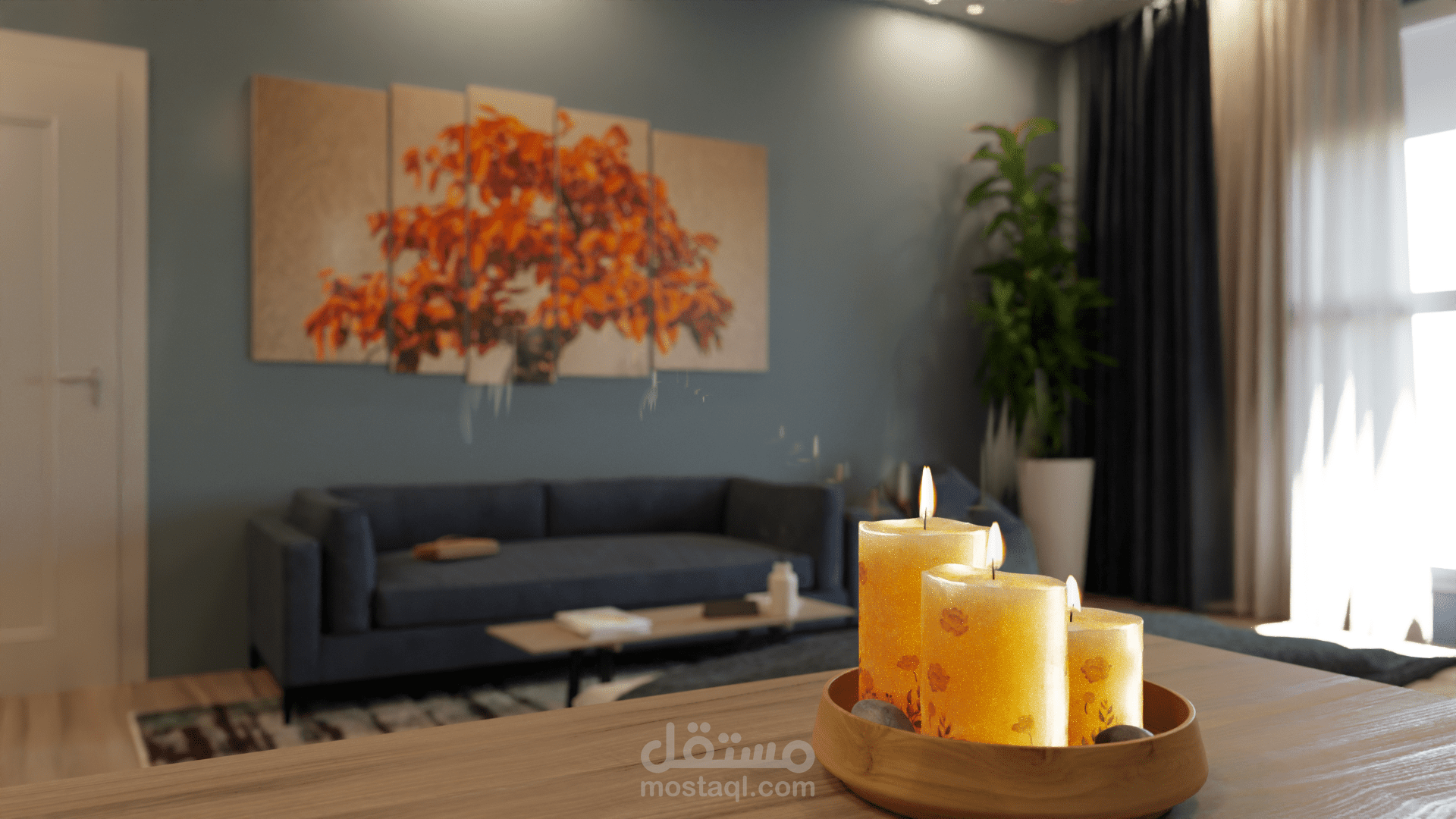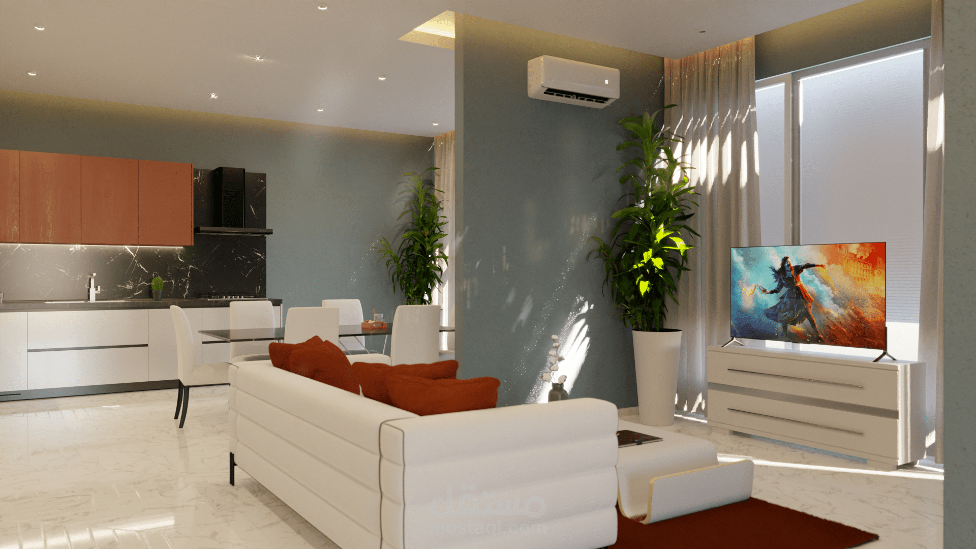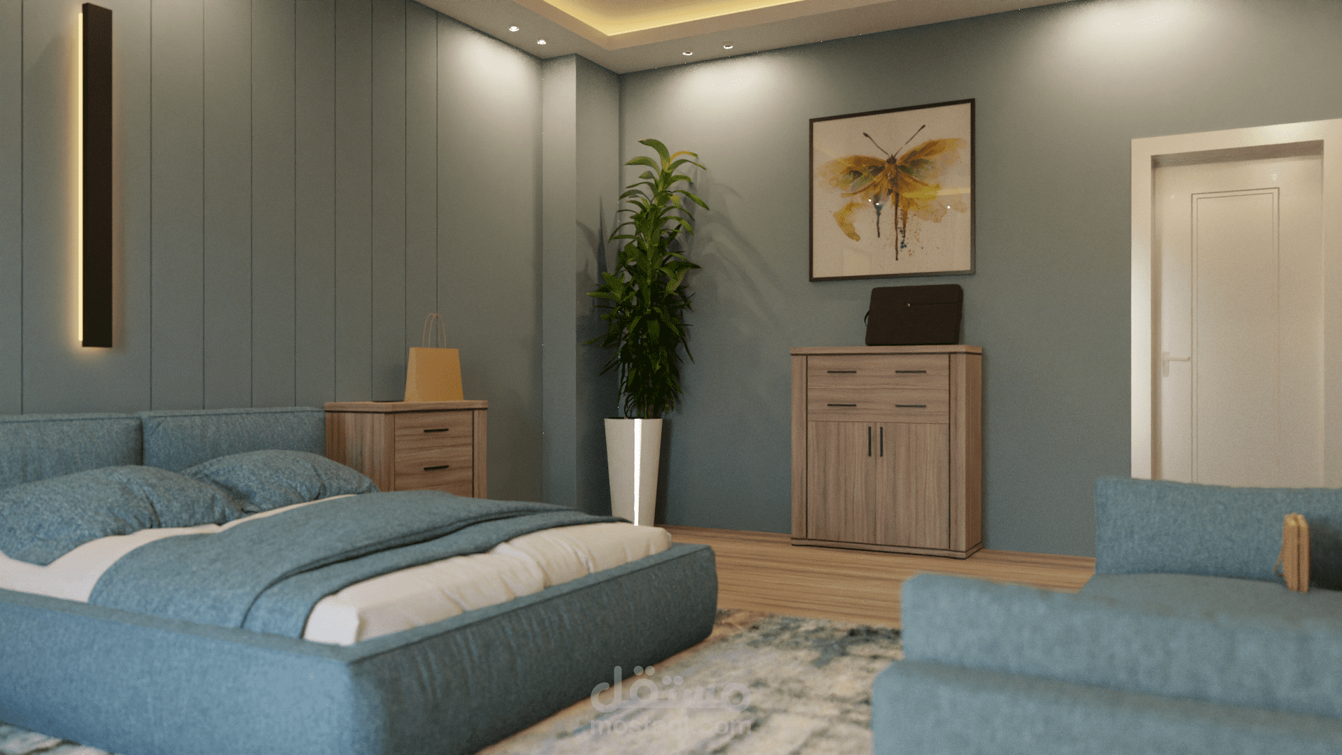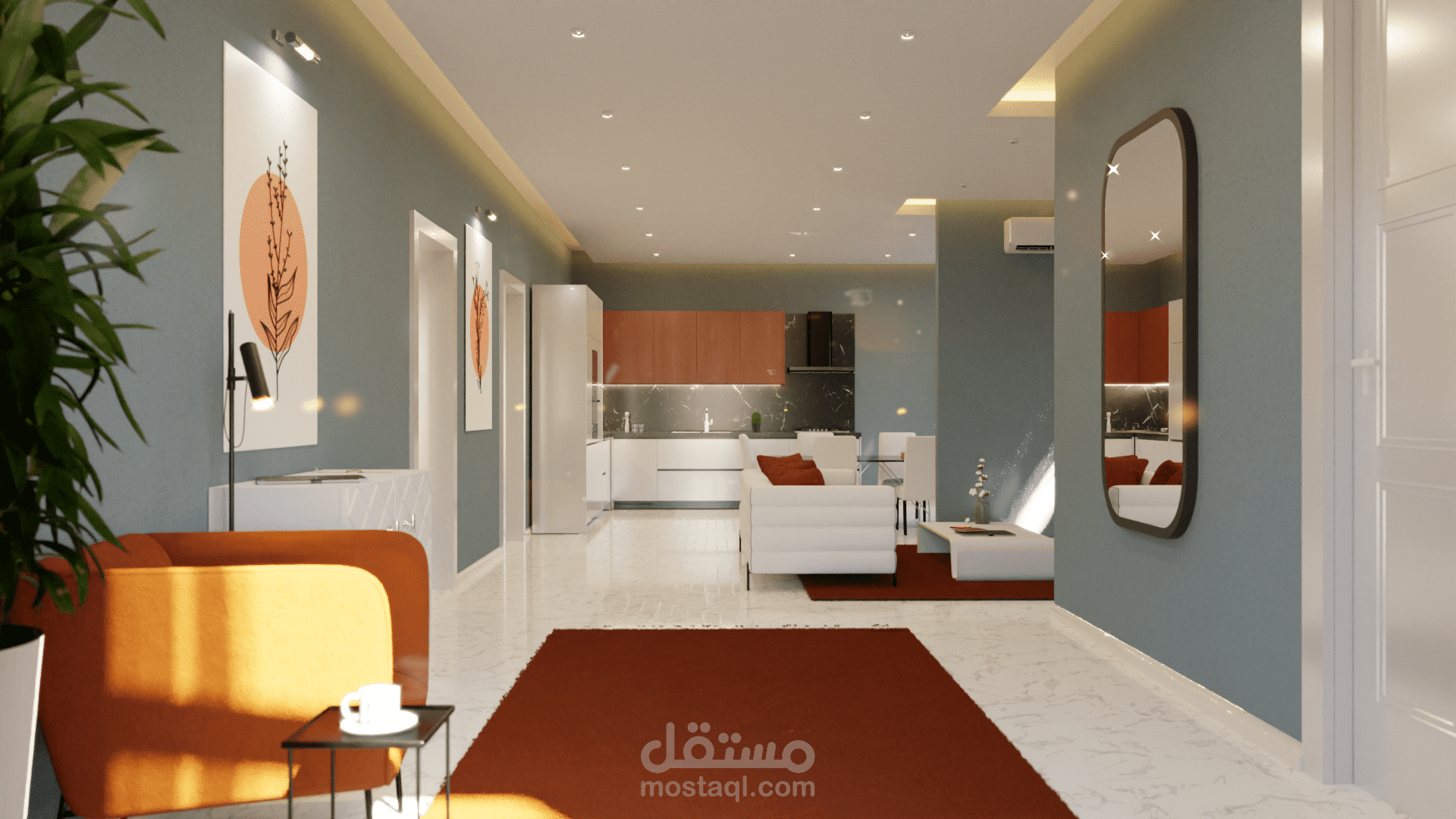 شقة مودرن تم اختيار اللون الاساسي الازرق البترولي واختيار نظرية التماثل في اختيار اللاوان المكملة