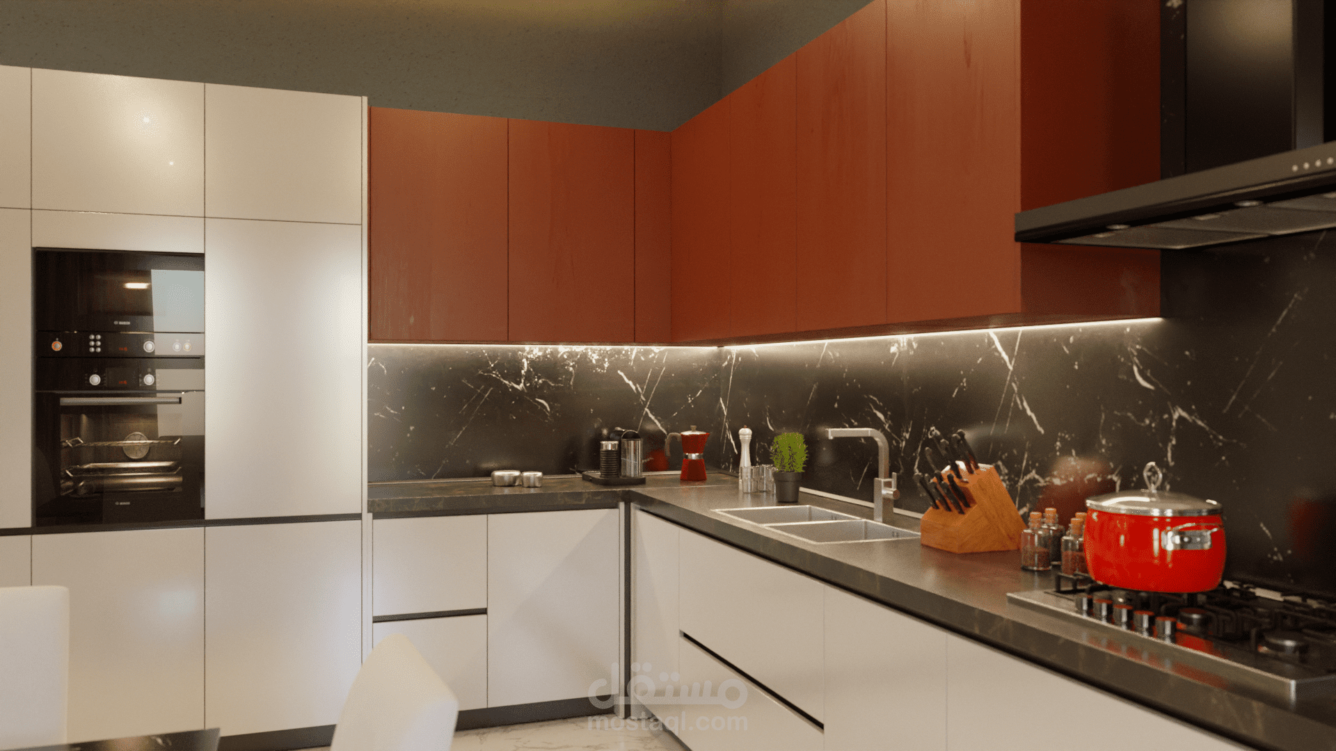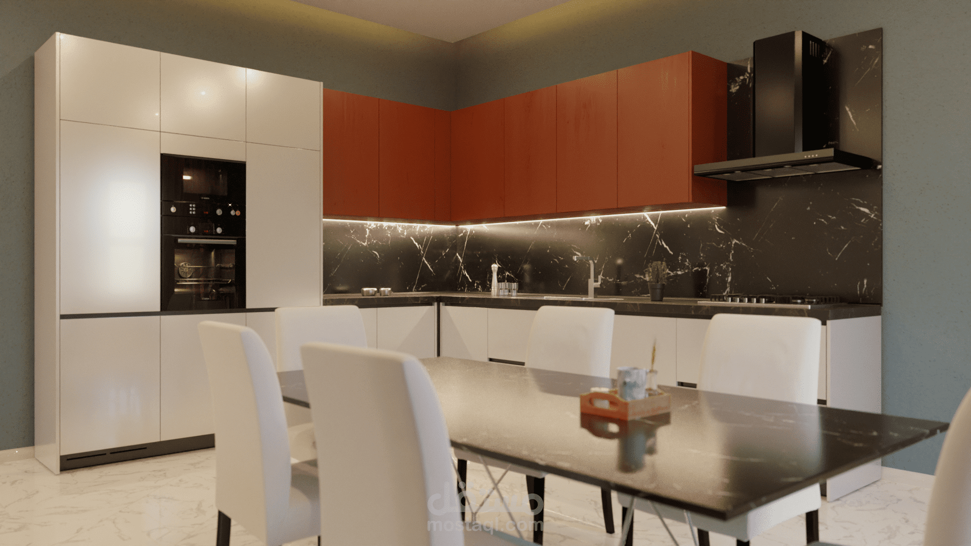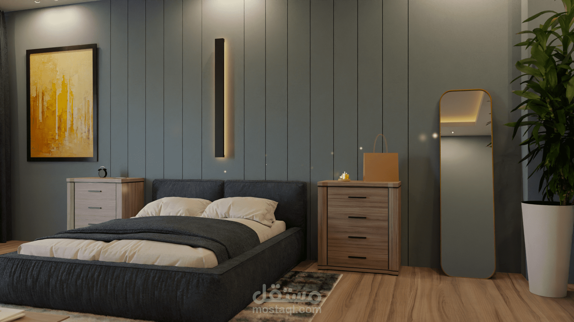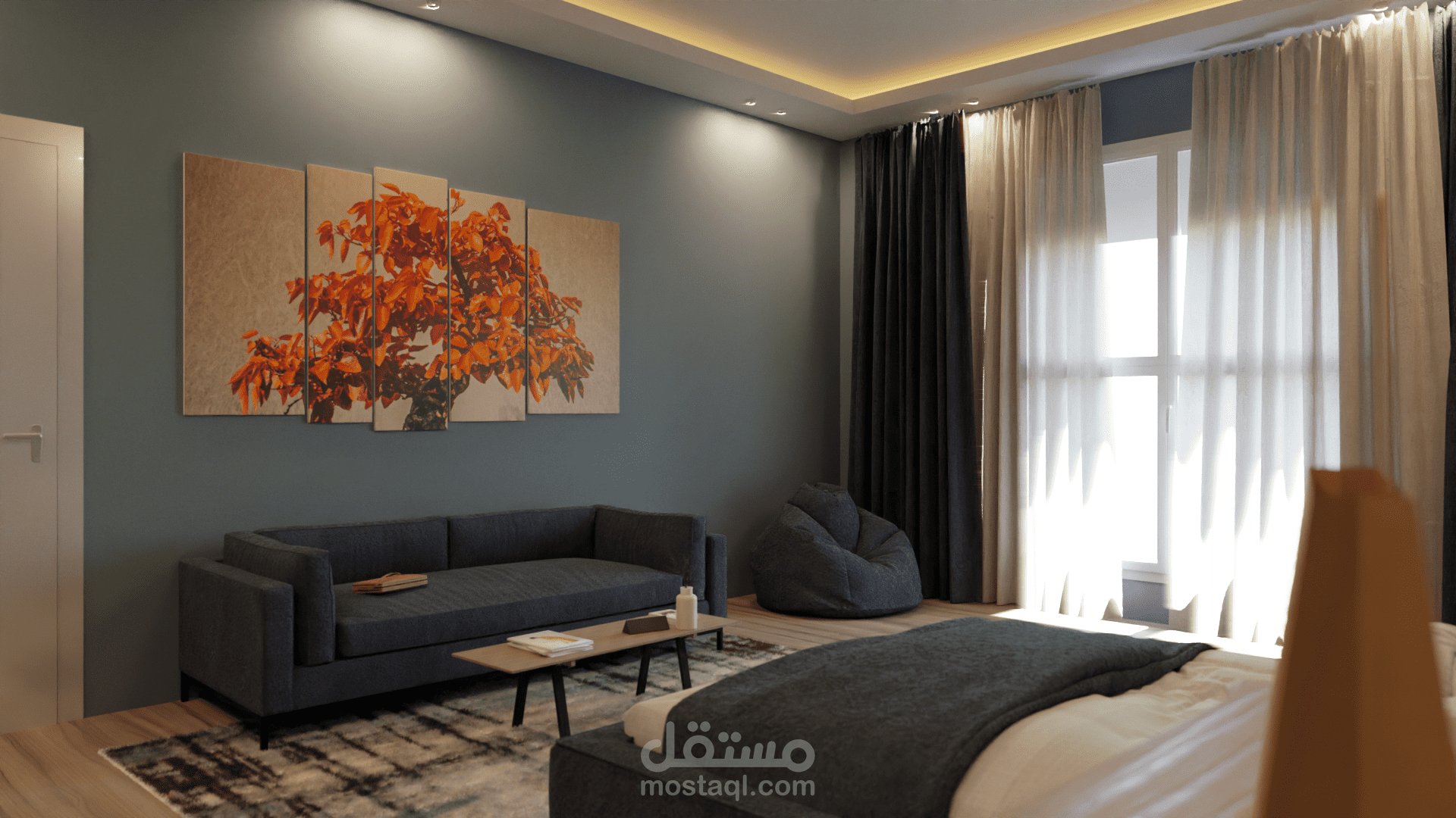 شقة مودرن تم اختيار اللون الاساسي الازرق البترولي واختيار نظرية التماثل في اختيار اللاوان المكملة
