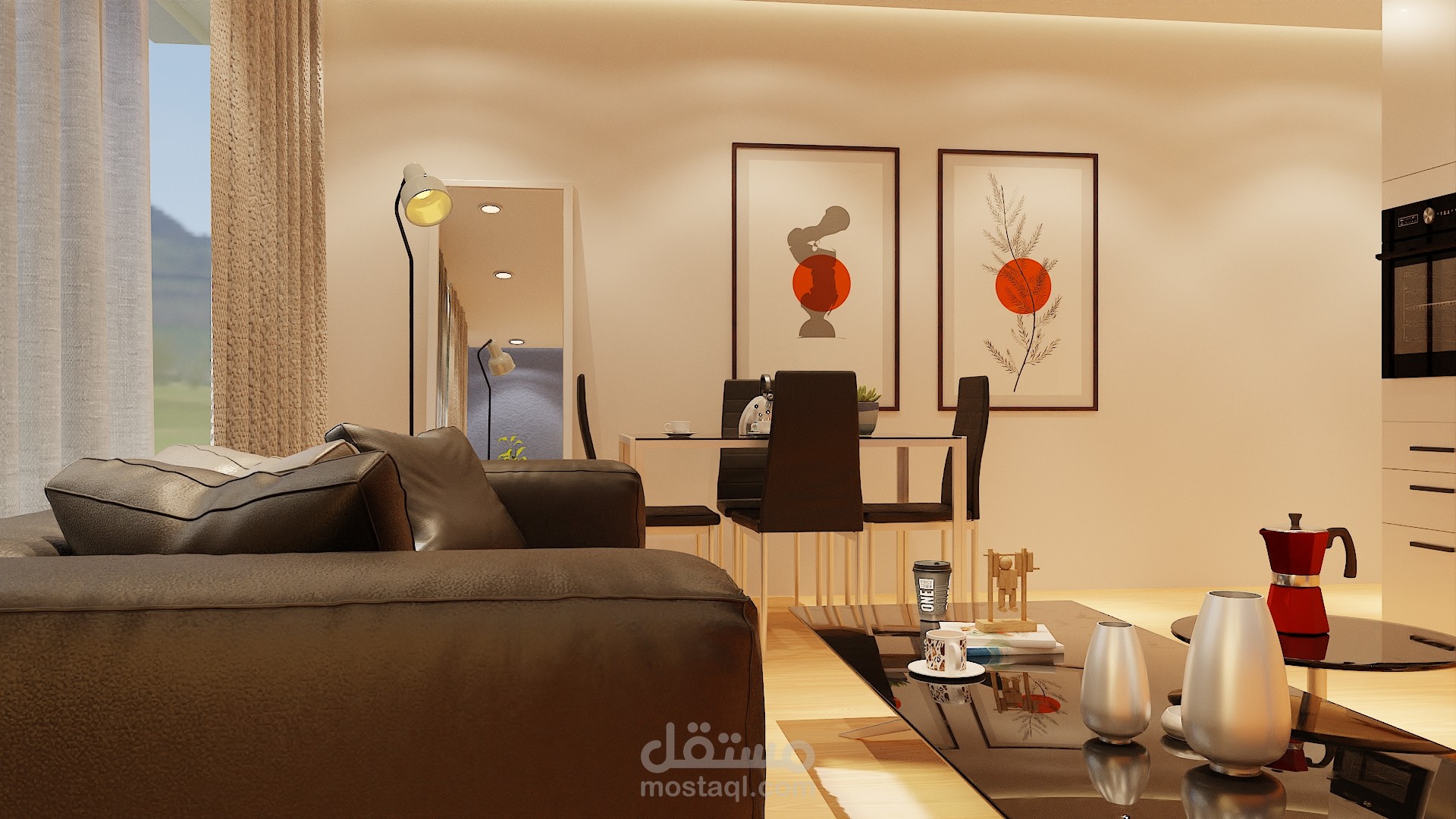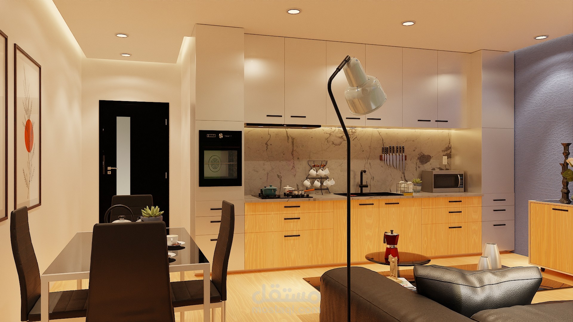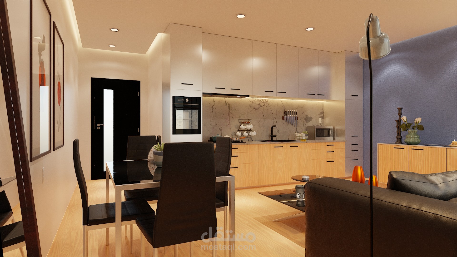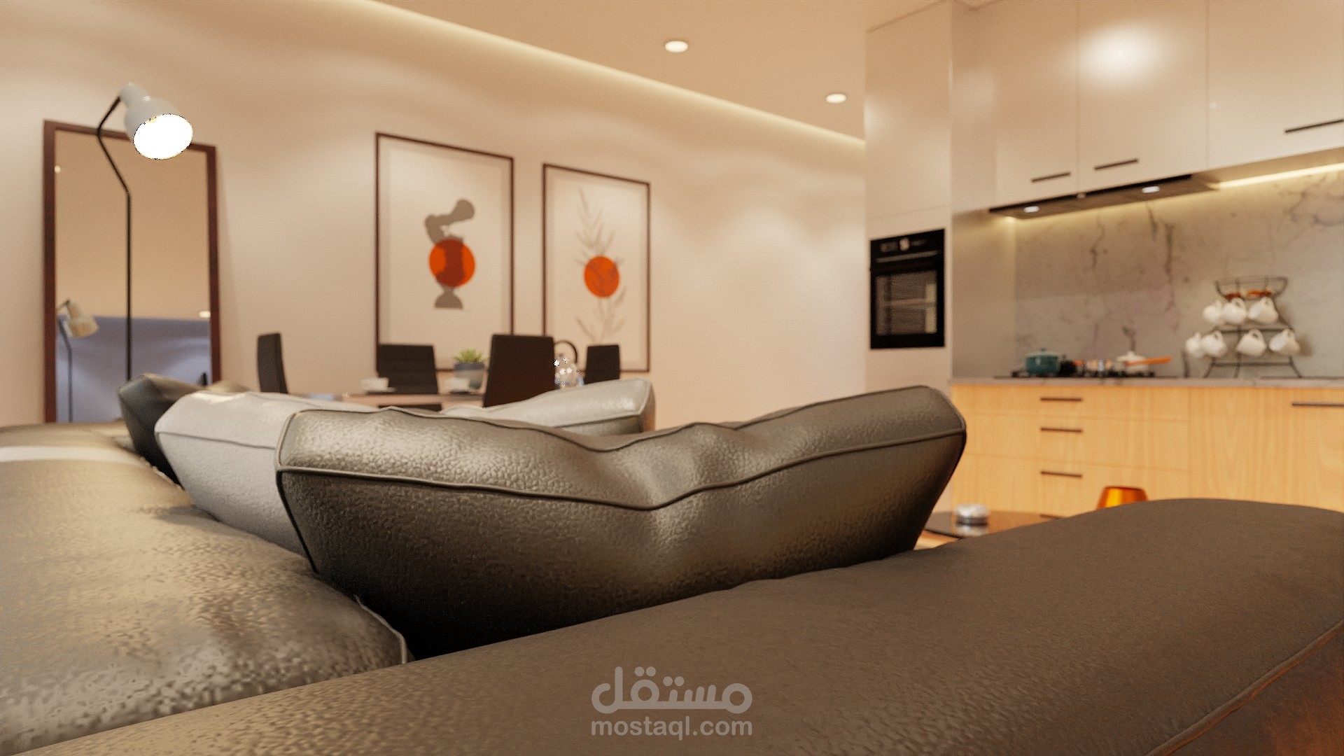 غرفة معيشة مودرن مع مطبخ مفتوح وسفرة