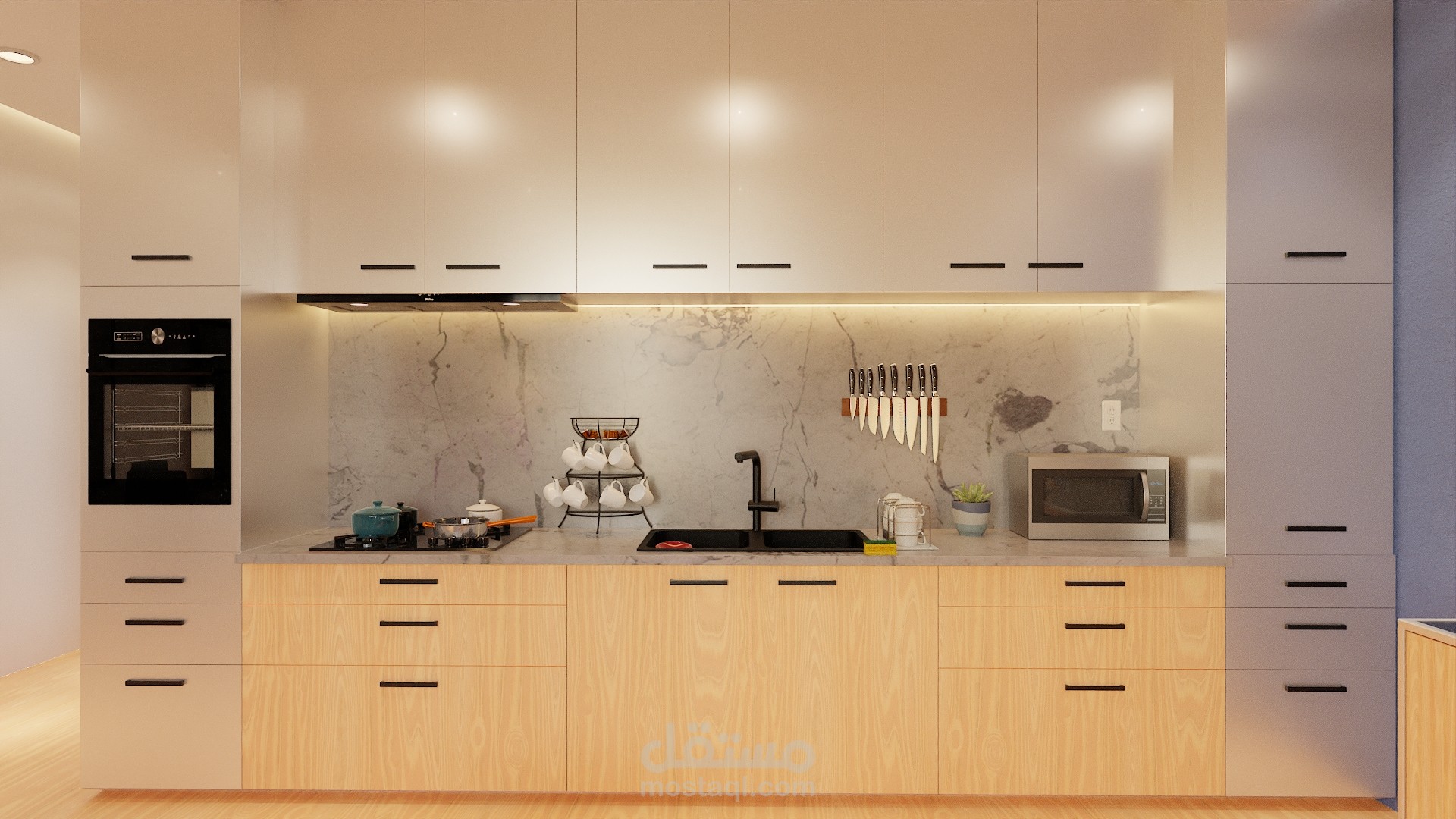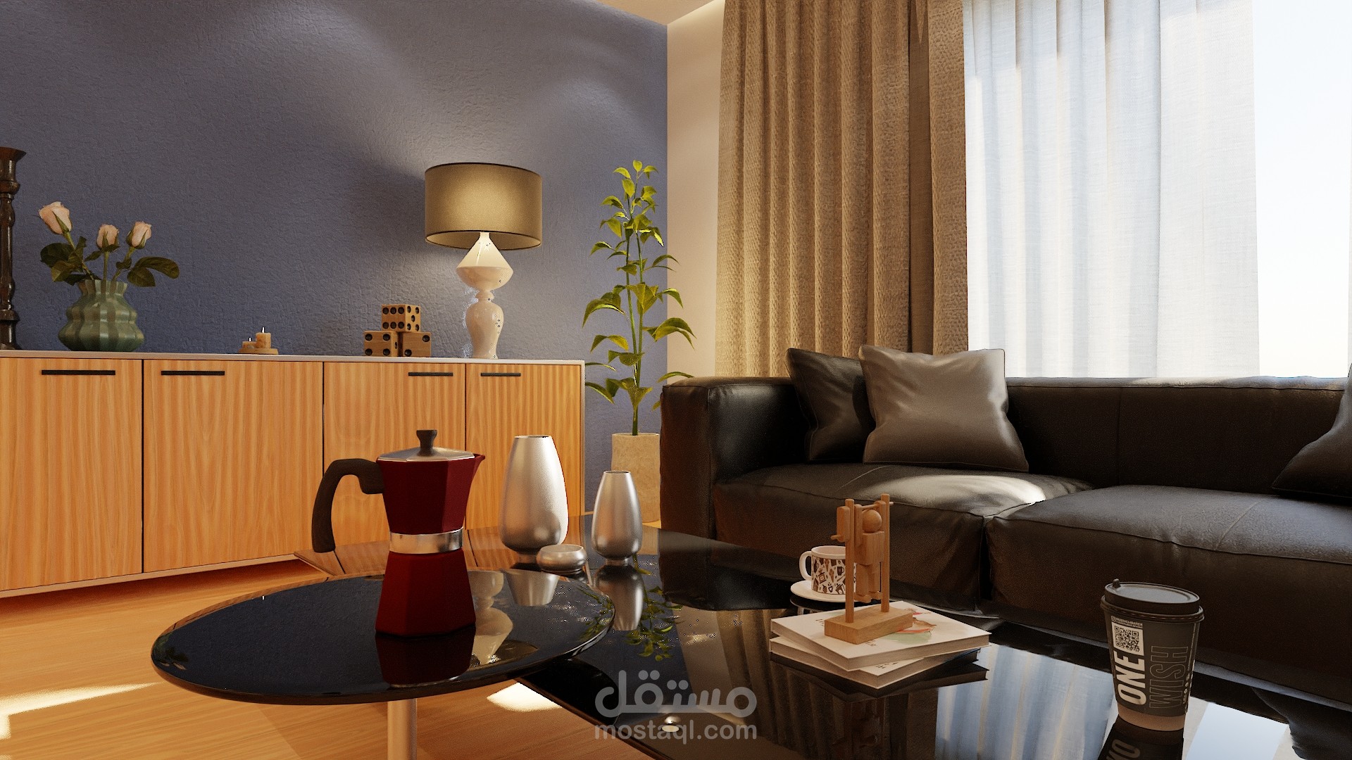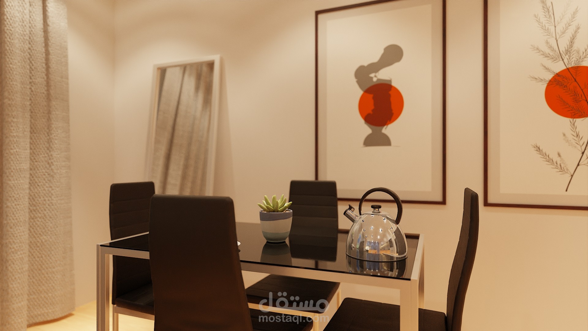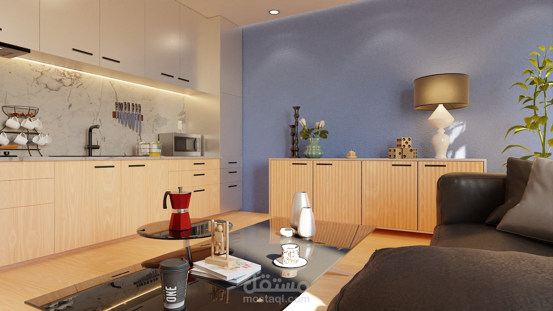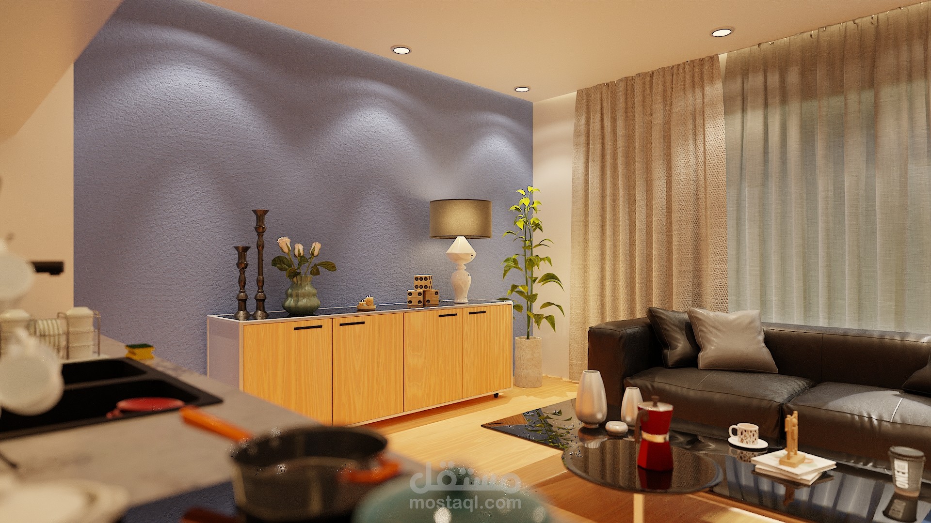 غرفة معيشة مودرن مع مطبخ مفتوح وسفرة