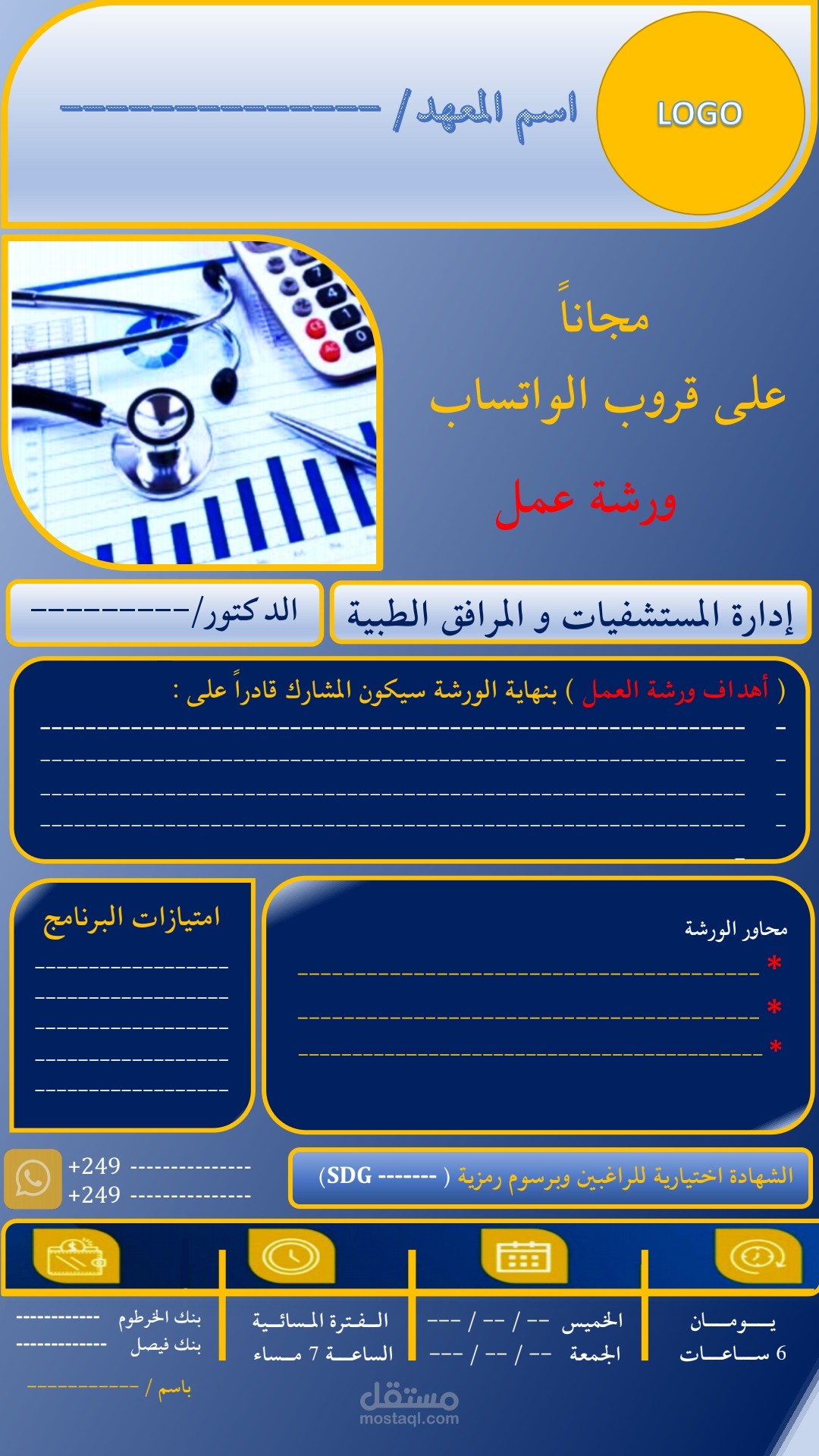 تم تصميم نموذج لورشة عمل workshop خاصة بإدارة المستشفيات و المرافق الطبية ، الورشة كانت عبر تطبيق الواتساب لمدة يومين وهي عبارة عن ورشة عمل مقاطع فيديو و نصوص كتابية و مساحة بين الأعضاء المشتركين في القروب للنقاش مع المحاضر ، مهامي شملت ( تصميم البوستر الخاص بورشة العمل ، صياغة المحتوى المعطى من قبل المدرب توضيح المدة و الوقت و تاريخ الورشة و كذلك وضع الحسابات البنكية ليتم إيداع مبلغ استخراج الشهادة من المعهد التدريبي ، كتابة اسم المدرب و المحاور و أهداف الورشة و الامتيازات الممنوحة للمشترك بالإضافة لجوائز للمشتركين في آخر يوم لورشة العمل )