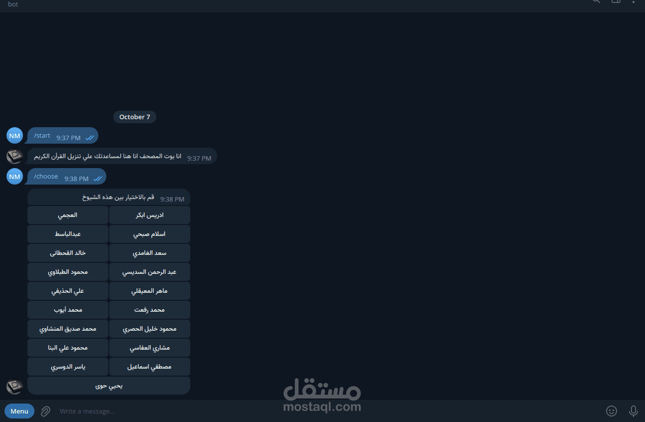 بوت تلجرام لتحميل القرأن الكريم مع قاعدة بيانات مع api بسيطة تمكنك من متابعة المستخدمين وعدد الرسائلز