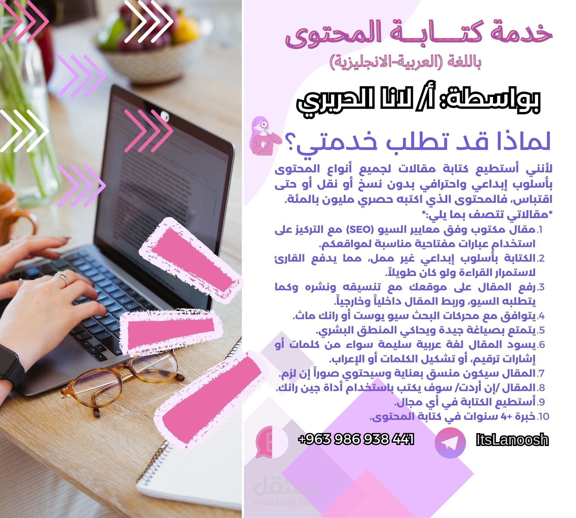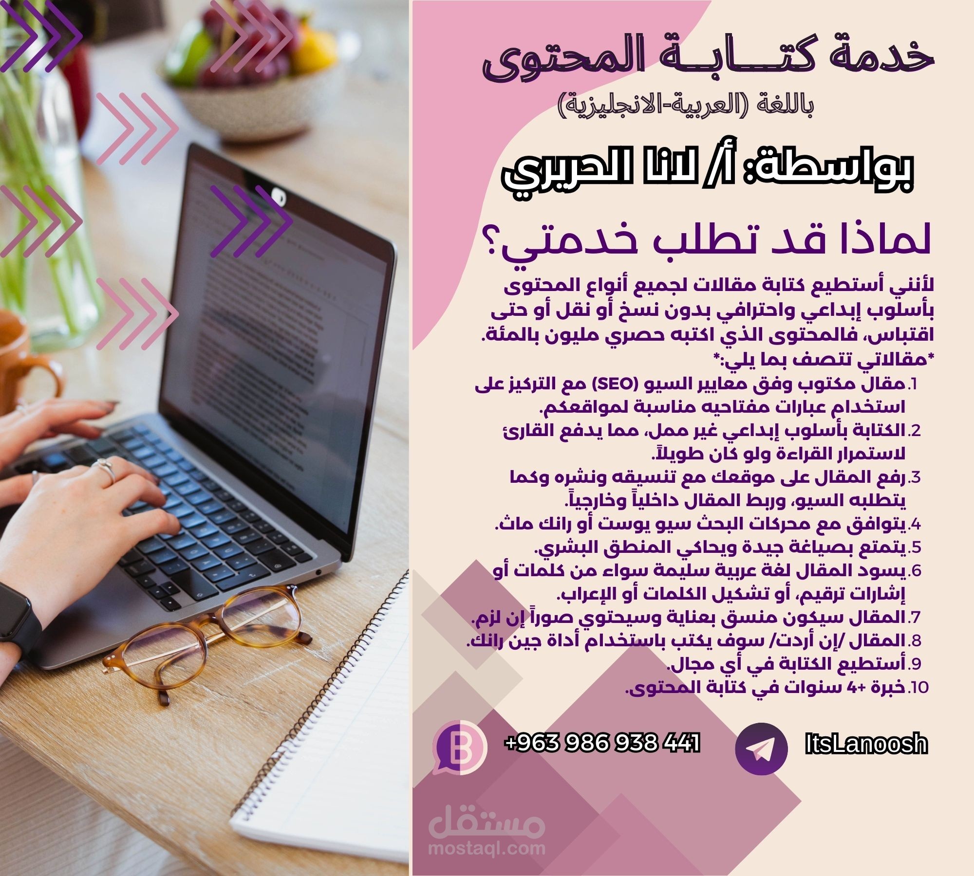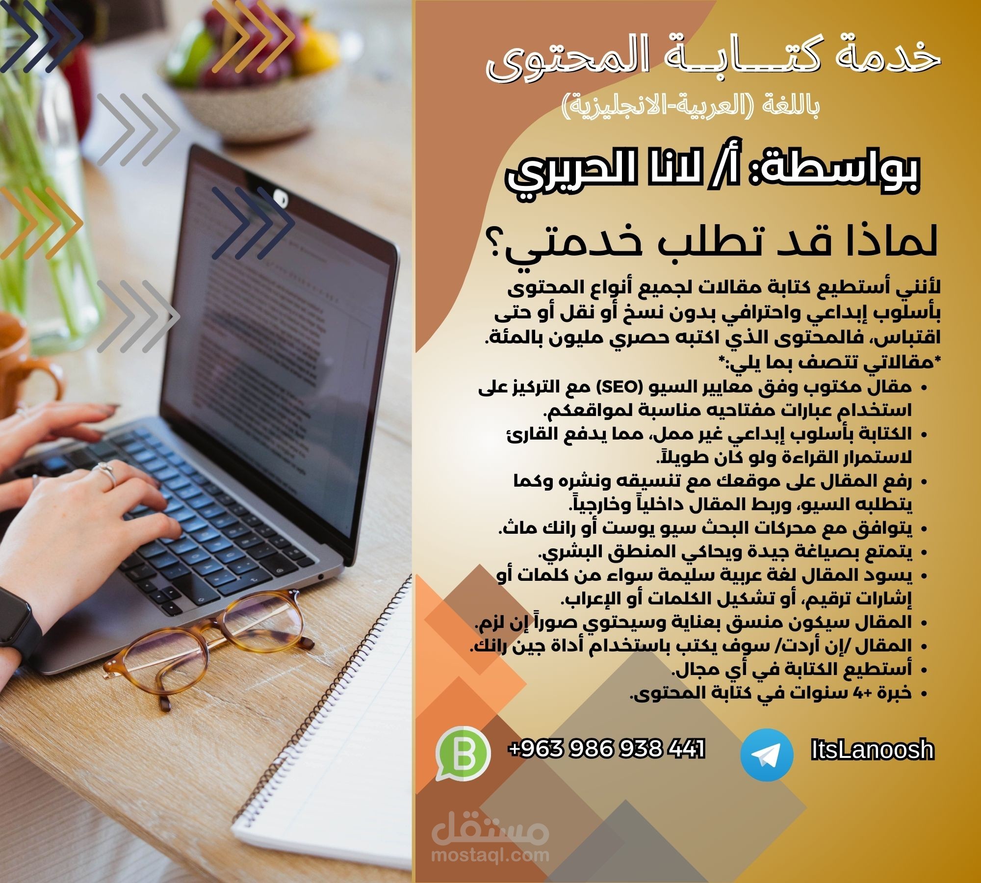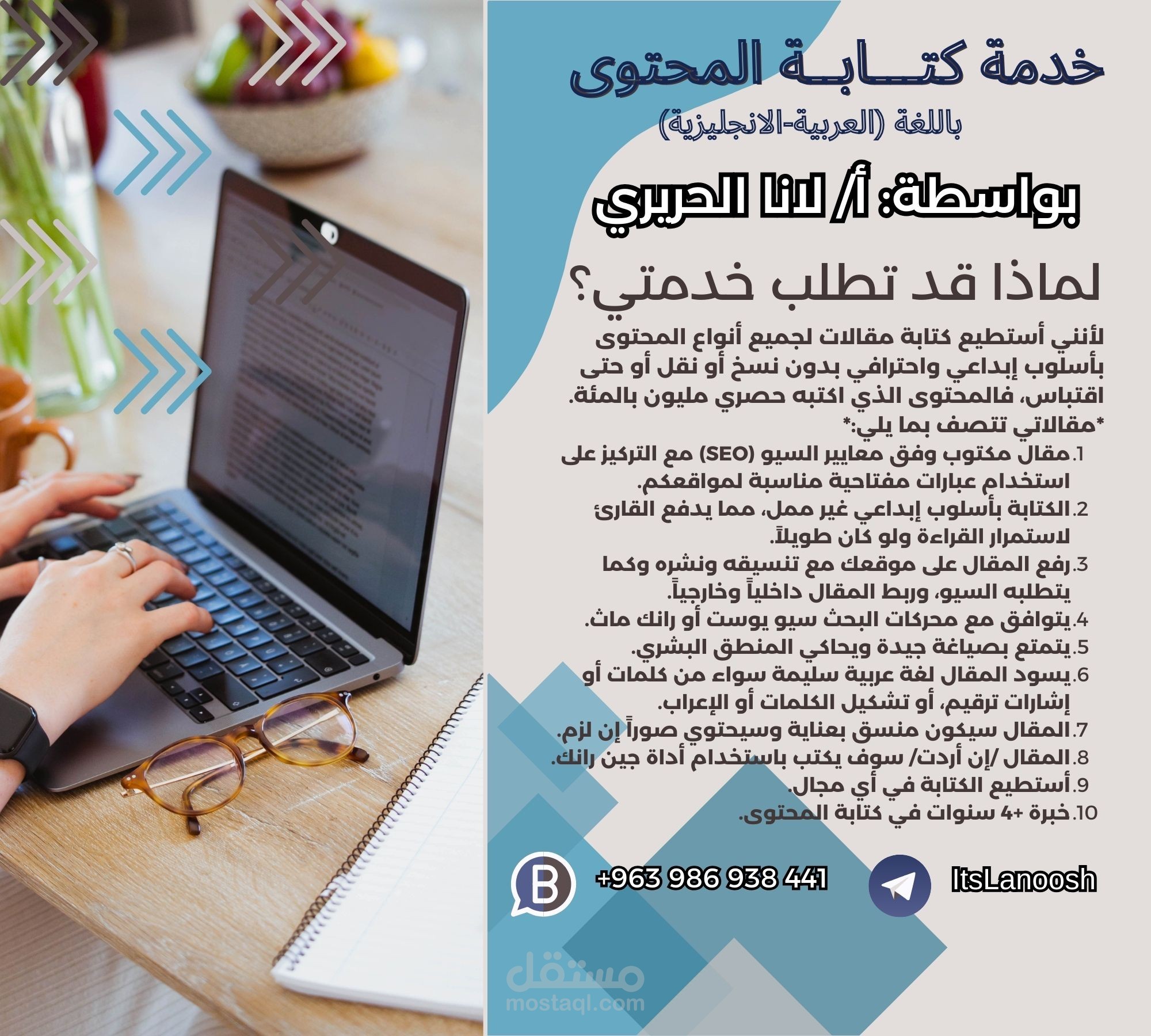 تصميم إعلان لخدمتي وهي كتابة المحتوى، أُظهر فيها أهم ما يمكنني فعله أثناء كتابة المحتوى، ومعلومات الاتصال، ضمن إطار شيق يحتوي على فكرة عامة لكتابة المحتوى على اللابتوب المحمول.