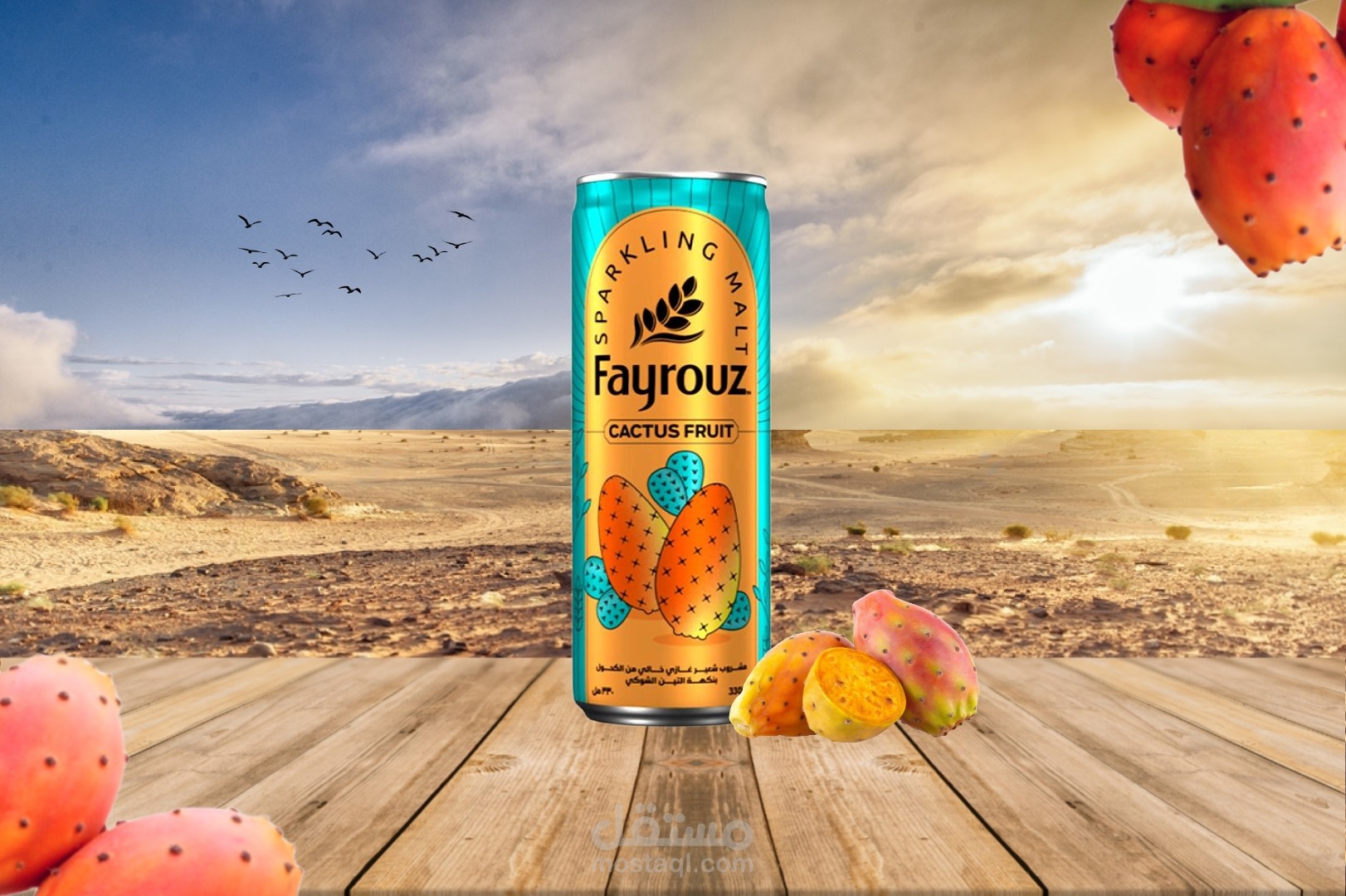 لقد قمت بتصميم مشروب غازي بطعم التين الشوكي من شركه فايروز و تم التركيز و تسليط الضوء علي عبوة المشروب لذالك وضعتها في منتصف التصميم و بجانبها ثمرات التين التين الشوكي و ايضا اختارت ان تكون الخلفيه عباره عن صحراء و صخور لكي تعكس اجواء الصحراء لان التين الشوكي يحصد من الصحرا و ايضا اختيار اللون الاصفر بتدرجاته لكي يعكس اجواء الصحراء