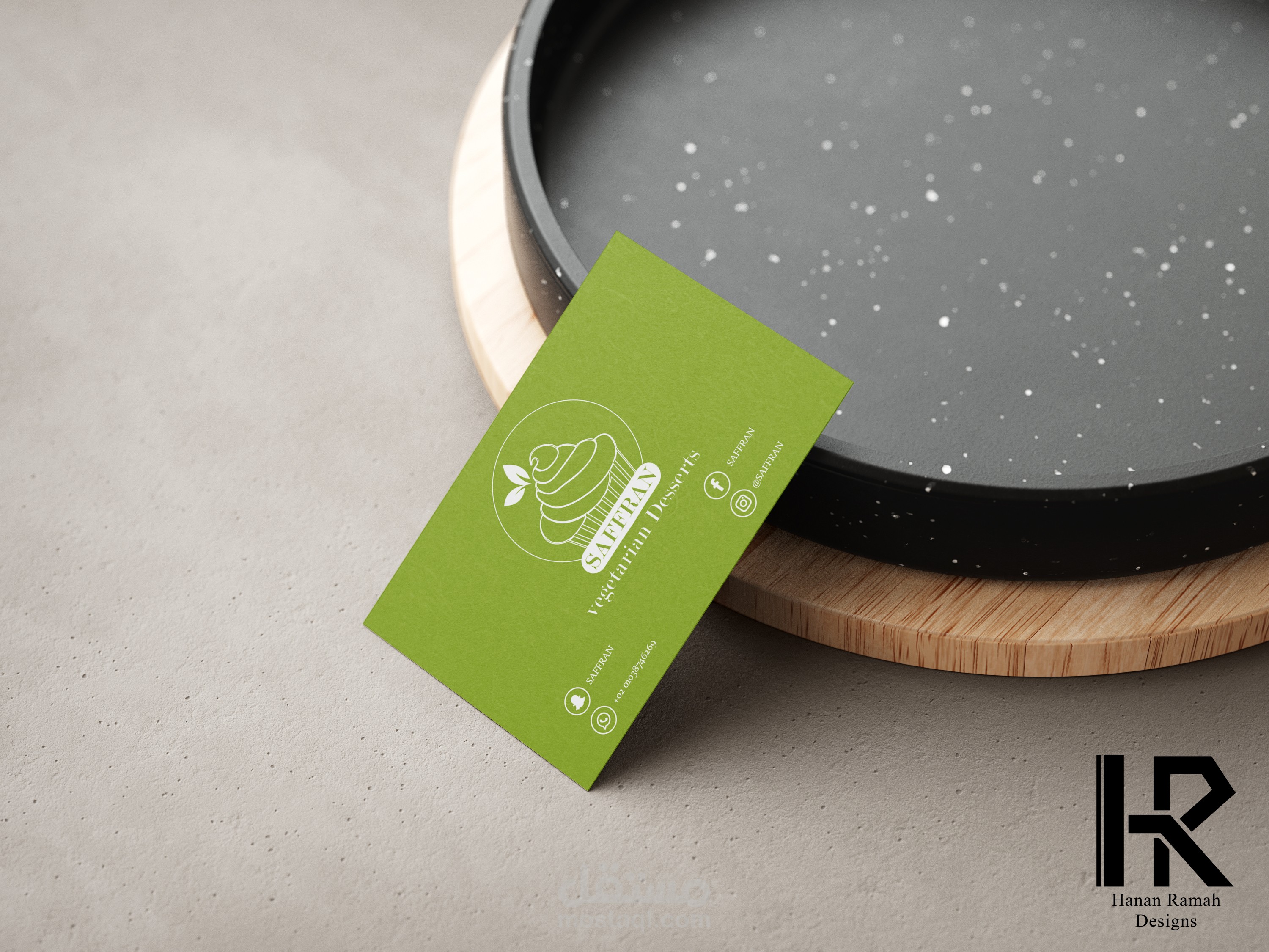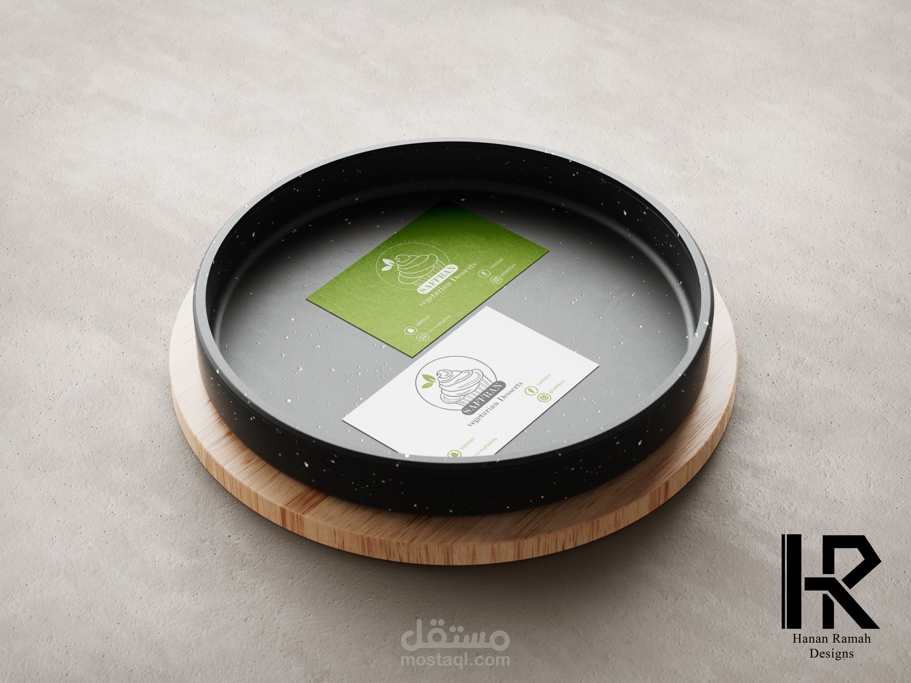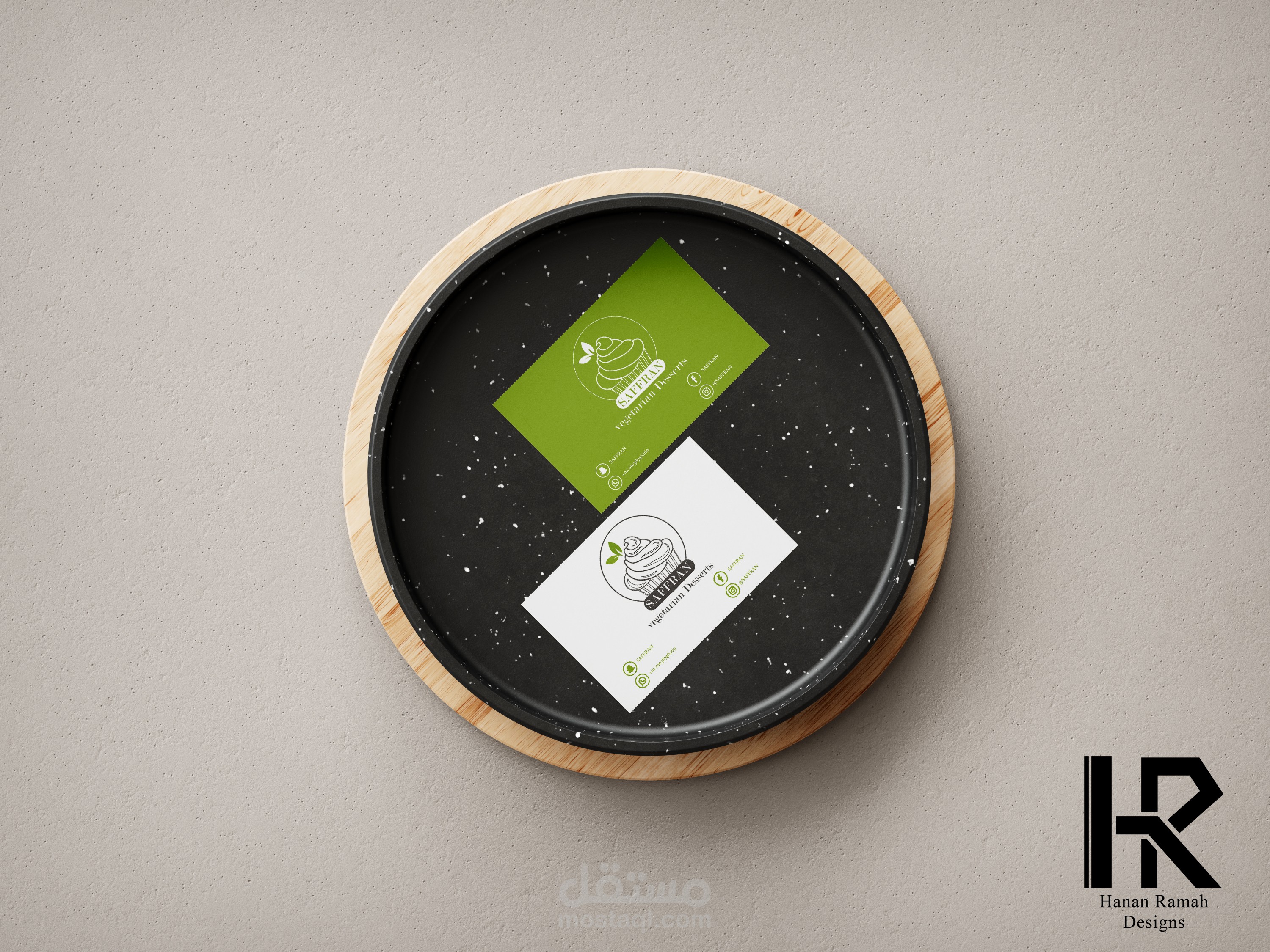 تصميم شعار محل حلويات نباتية مع تصميم الكارت الخاص به والاشياء الخاصة بالتعبئة والتغليف