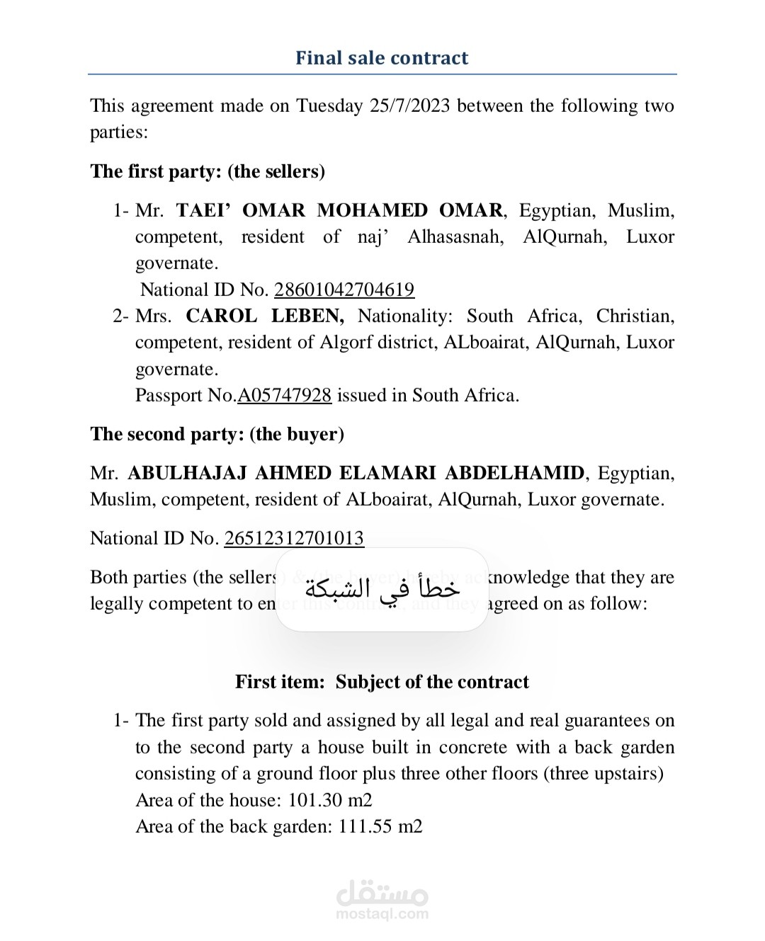 ترجمة عقد بيع نهائى لمنزل من اللغة العربية الى اللغة الانجليزية وتسليم الترجمة فى ملف pdf بتنسيق رائع