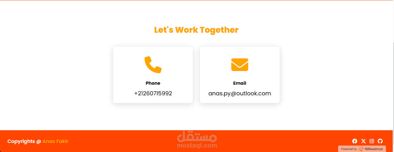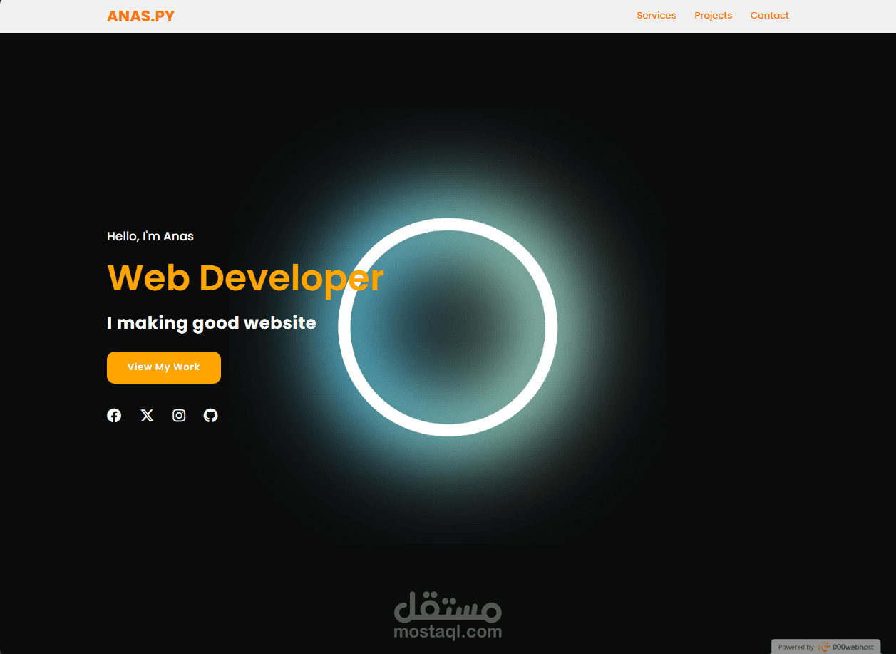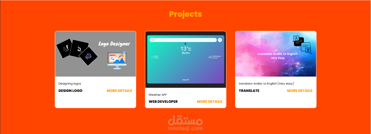 في هذا المشروع، قمت بتصميم موقعٍ إلكتروني شخصي. يتضمن الموقع ثلاثة أقسام رئيسية، وهي الصفحة الرئيسية، وبعدها قسم الخدمات، ثم قسم المشاريع. في النهاية، هناك قسم للتواصل وقسم للـFooter.