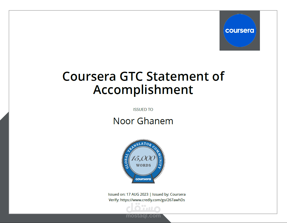 ترجمة 15000 كلمة من فيديوهات المحتوى التعليمي المتوفر على منصة كورسيرا من اللغة الإنكليزية إلى اللغة العربية.