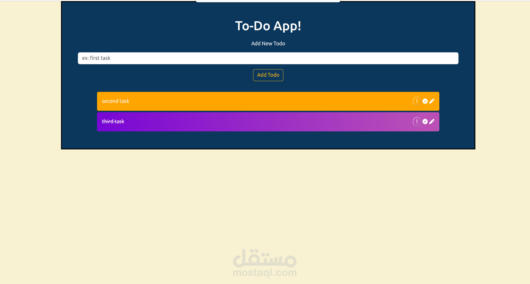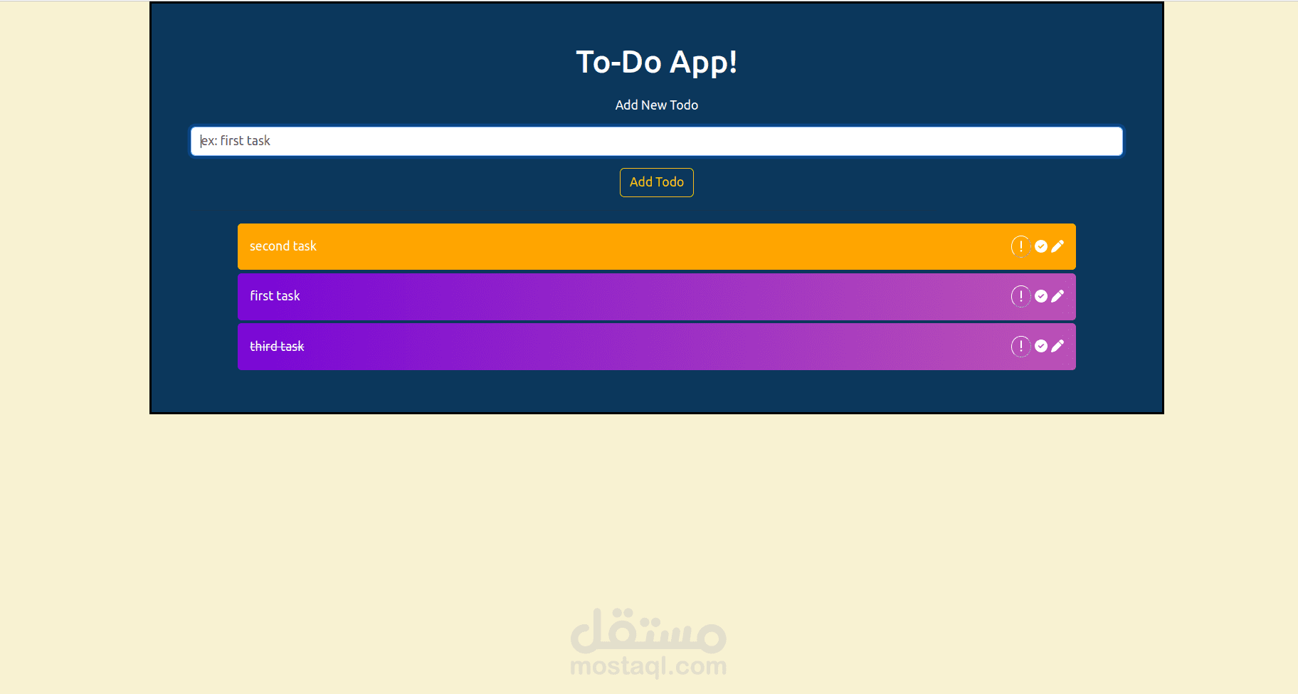 تطبيق باستخدام ReactJS لتنظيم المهمات. يمكن للمستخدم أن يرتب أهمية المهمات بالضغط على أيقونة علامة التعجب ويمكنه أيضا حذفها اذا كان أتمها ولا يريد عرضها و يستطيع أيضا الرمز الى انتهائها مع الاحتفاظ في صفحة المهمات.