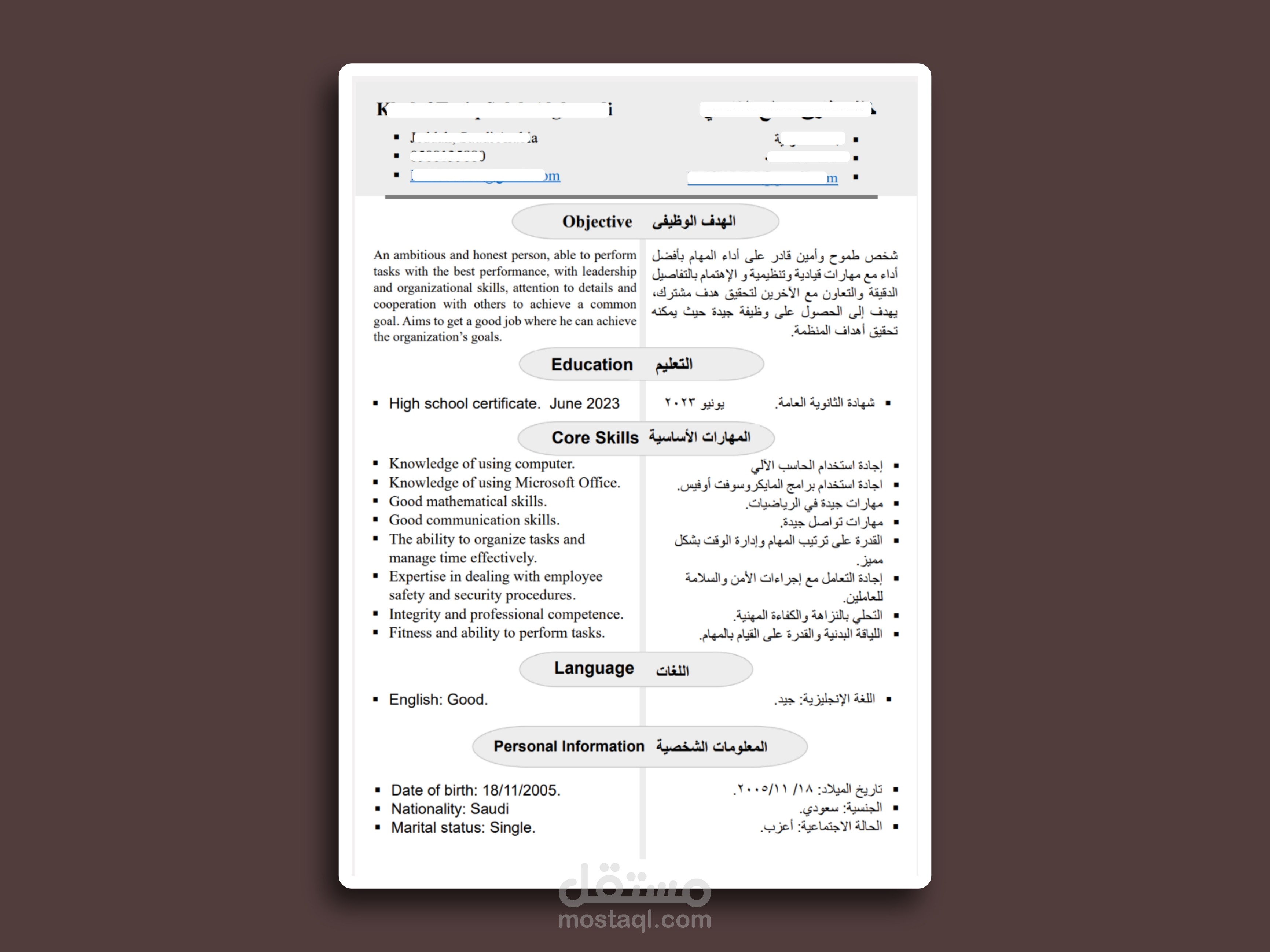 سيرة ذاتية احترافية مُدمجة باللغتين معاً العربية والإنجليزية
