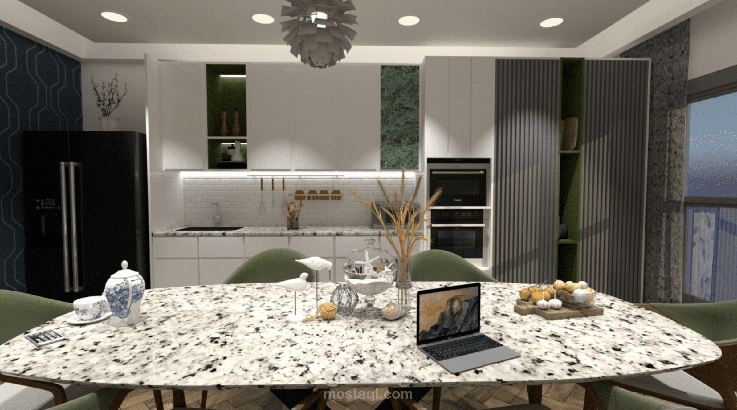 The render picture depicts a stunning modern kitchen that combines sleek design elements with functionality. The space exudes a sense of sophistication and efficiency, reflecting contemporary aesthetics.