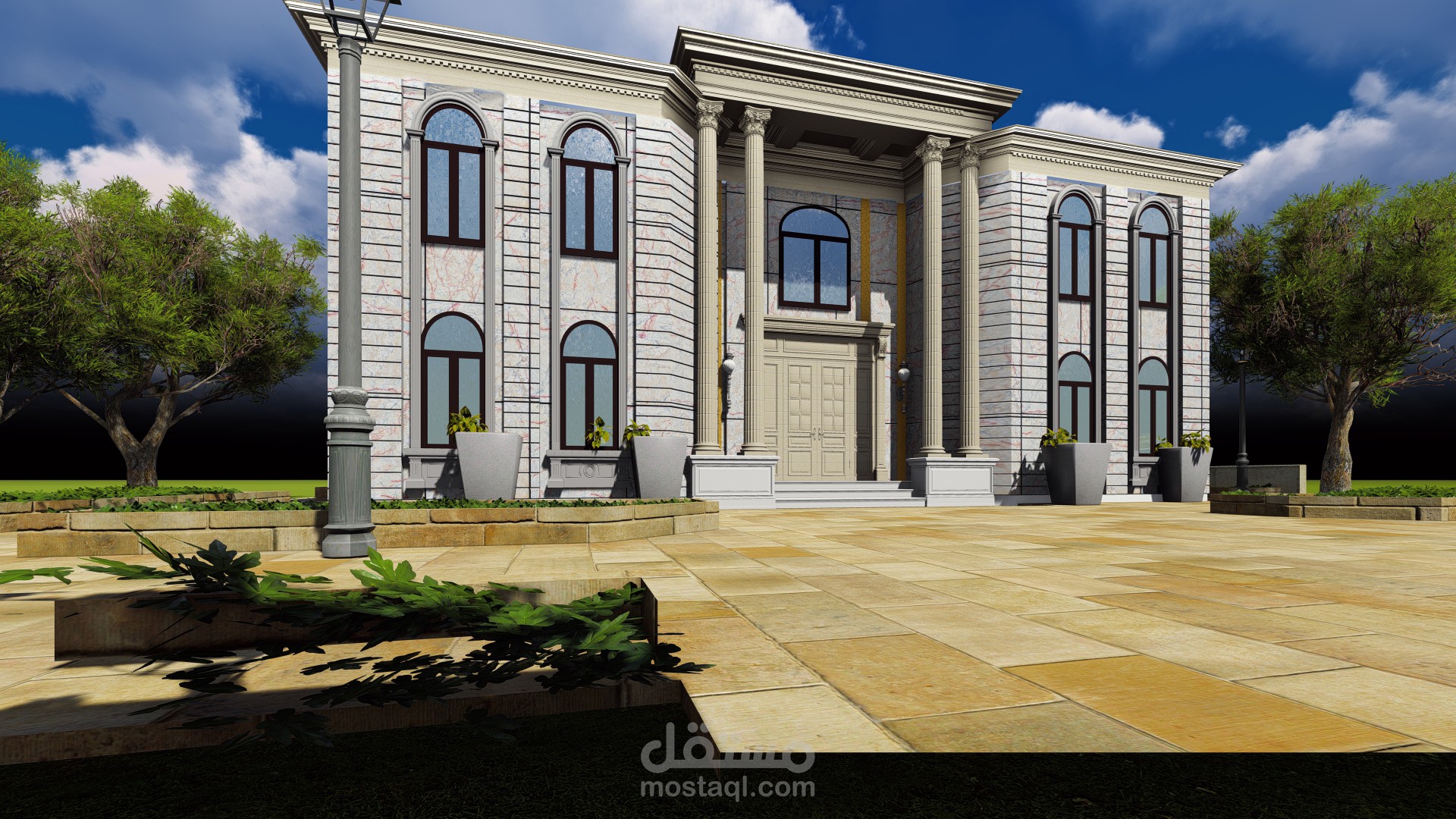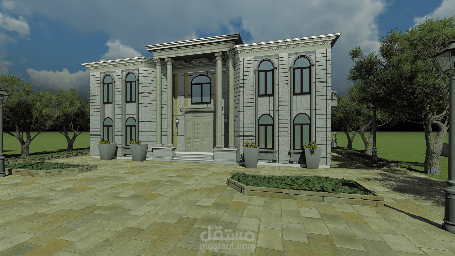 تم تصميم فيلا وفق الطراز المعماري الكلاسيكي الخديث بنموذج بسيط وتم نمذجة هذا الملف على برامج النمذجة الحديثة 3d max n- lumion