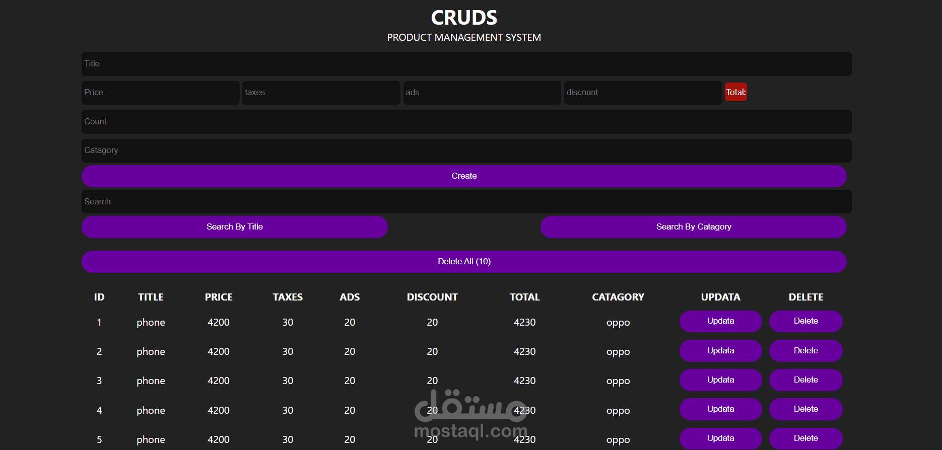 موقع الكتروني لتخزين بيانات مثل بيانات الموبيلات والكميات وحذف واضافه وتعديل