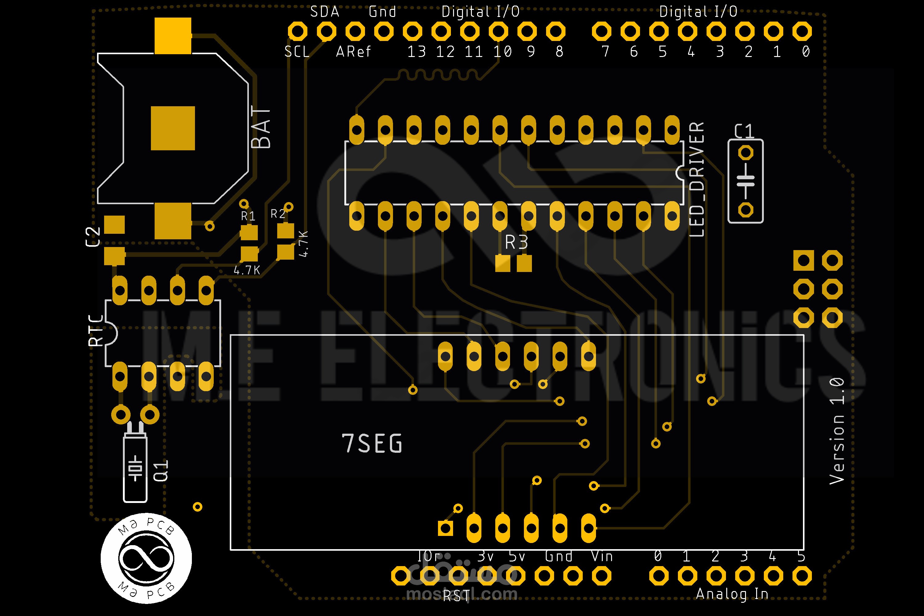دائرة إلكترونية مطبوعة (PCB) يمكن ربطها مع Arduino UNO وتستخدم في تطبيقات ال(RTC(Real time clock وStop watch وتطبيقات عديدة، تم تصميمها باستخدام برنامج AutoDesk Eagle.